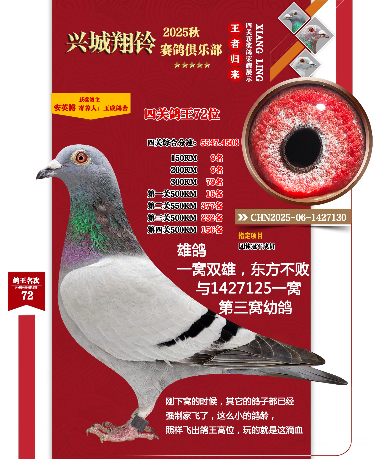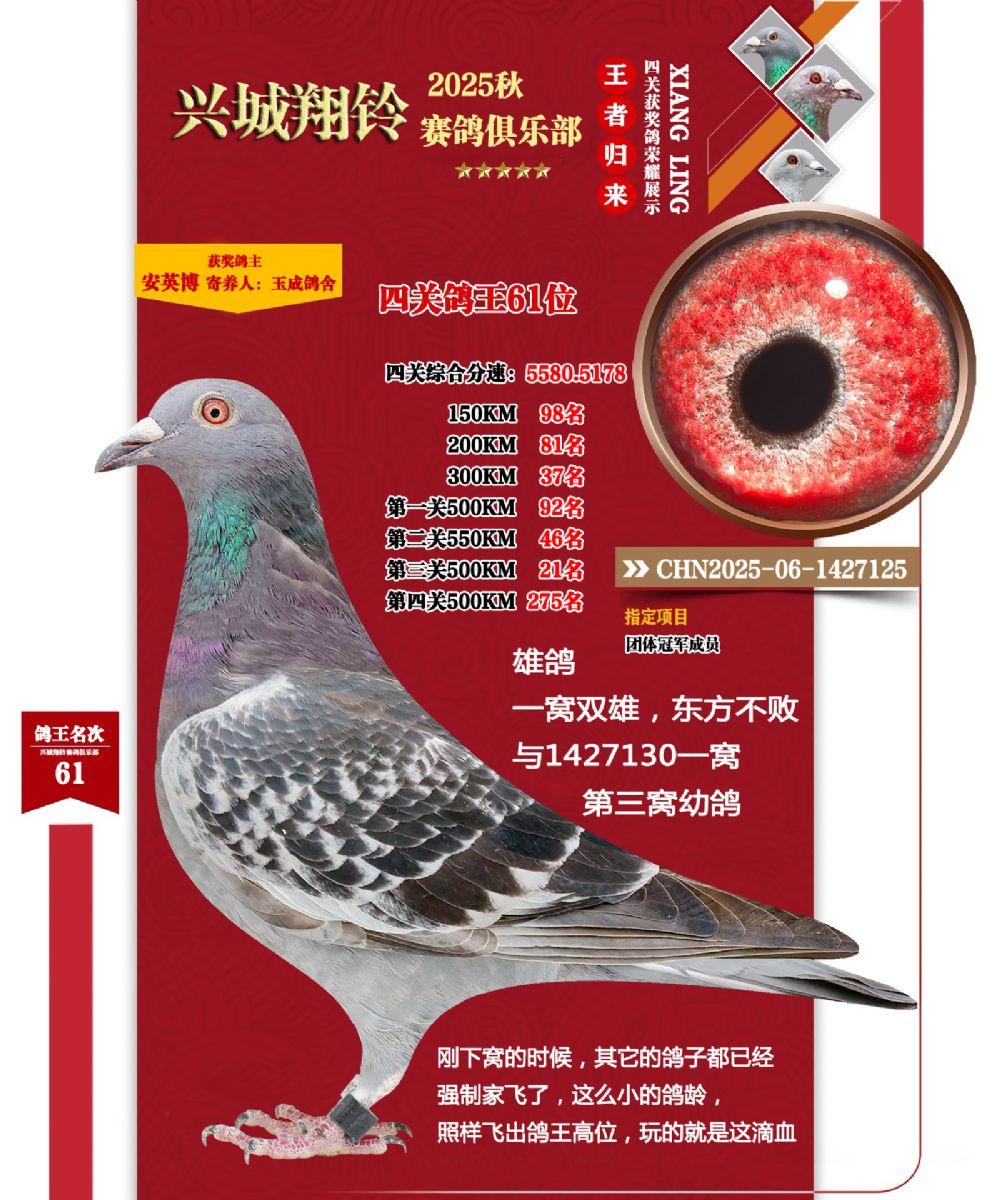 优秀的赛绩只能靠鸽子本身的质量,2025年秋季仅给新徒弟买20个特比环,四关鸽王进奖9羽,鸽王前十名进2羽,仅本舍前十占两位鸽王(比赛时剩17羽),达到2羽就进奖1羽的比例,斩获本年度的团体冠军,金牌教练。