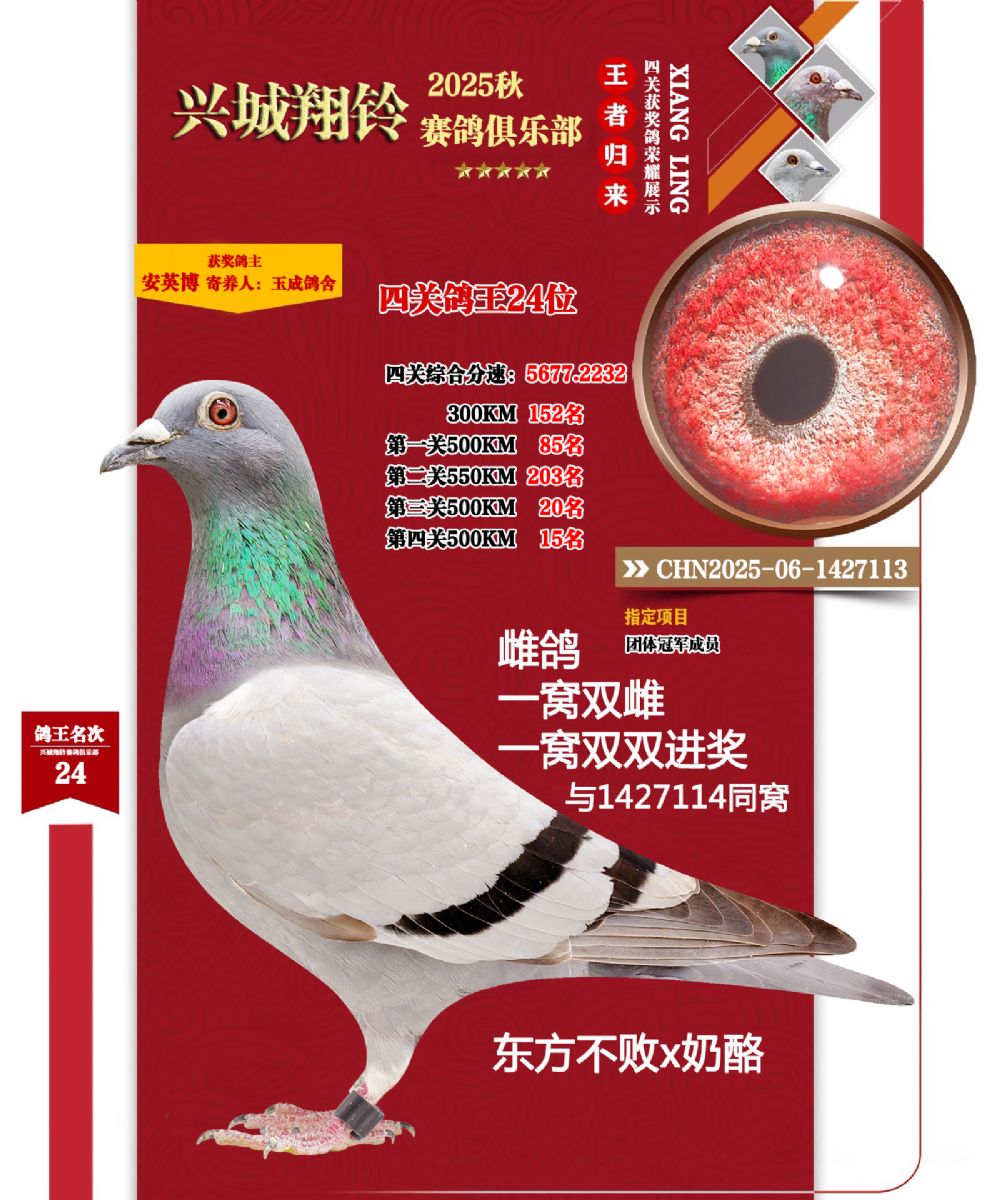 | 1613114 | 强盗号(泰奥·克里克)平辈做出四关鸽王殿军,三关鸽王亚军 | ¥0元 | 0次 |