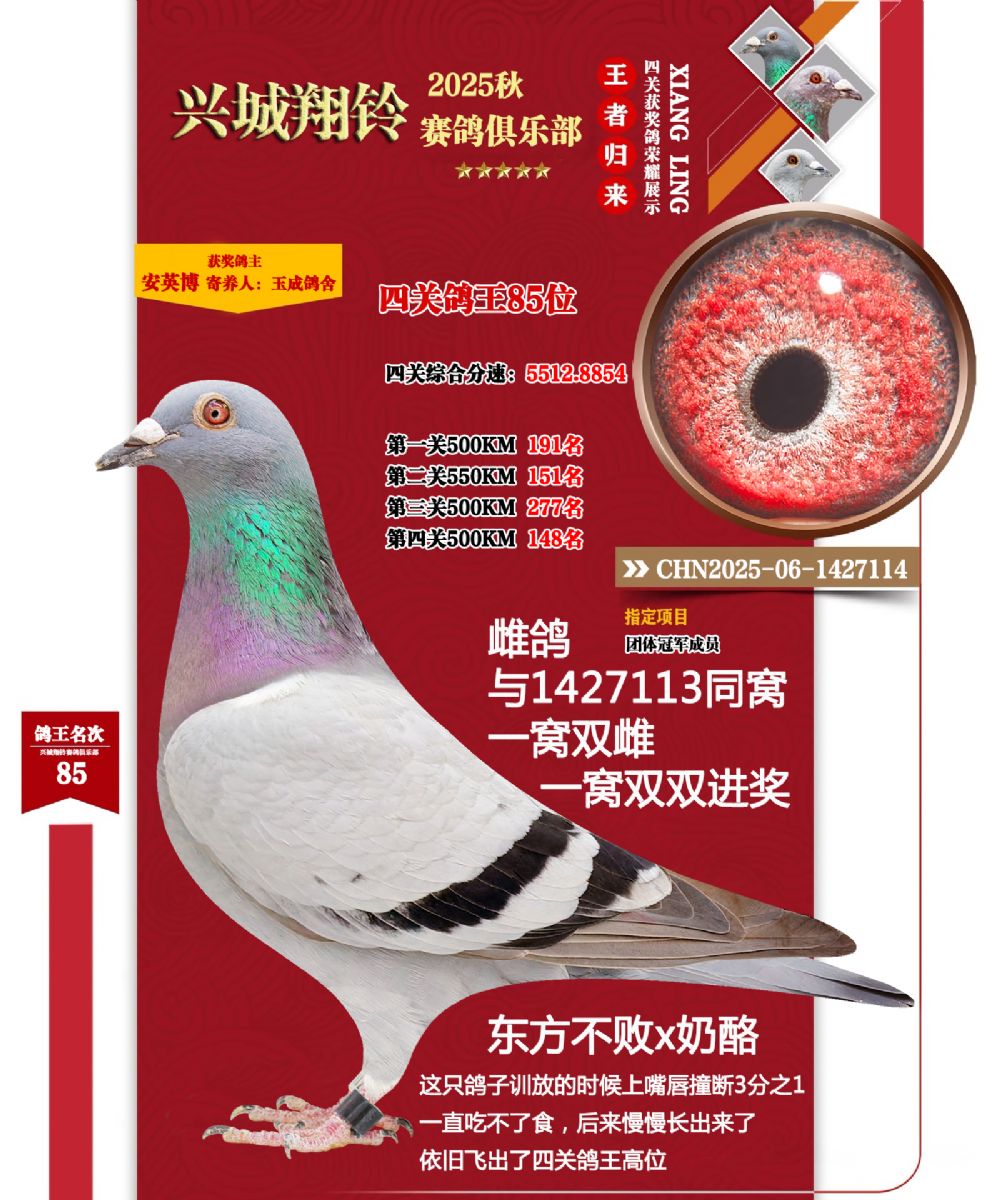 优秀的赛绩只能靠鸽子本身的质量,2025年秋季仅给新徒弟买20个特比环,四关鸽王进奖9羽,鸽王前十名进2羽,仅本舍前十占两位鸽王(比赛时剩17羽),达到2羽就进奖1羽的比例,斩获本年度的团体冠军,金牌教练。