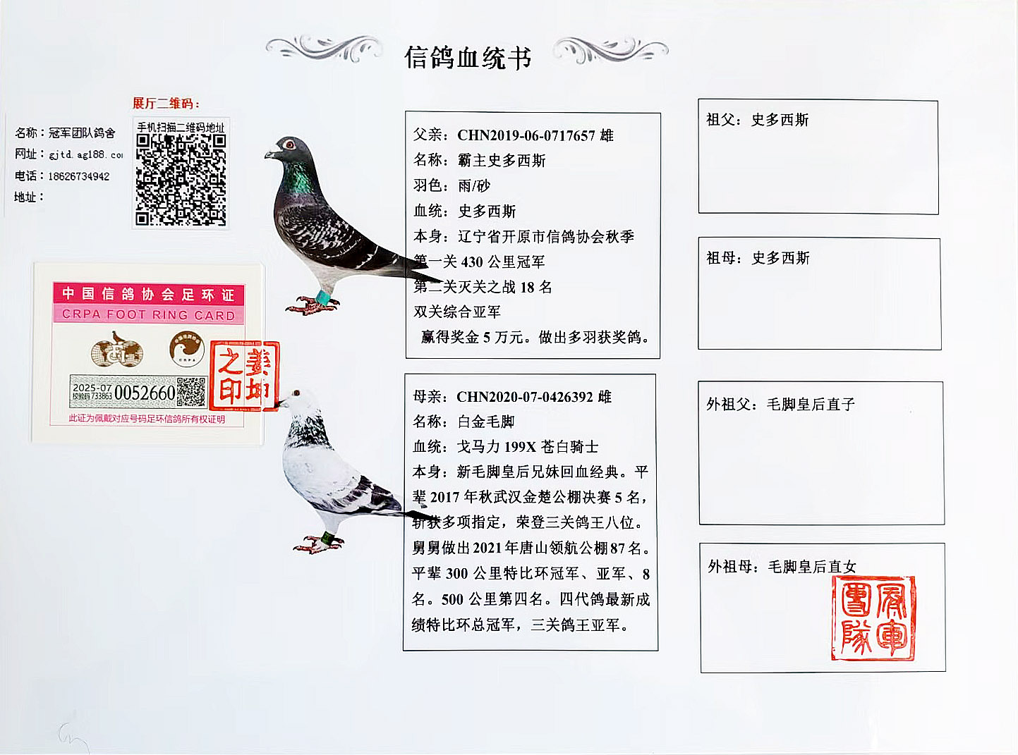 空间有限0元分享,假一赔百,拒卖百家鸽。机不可失。成绩、血统永久保真。血统书足环卡随鸽发出。
