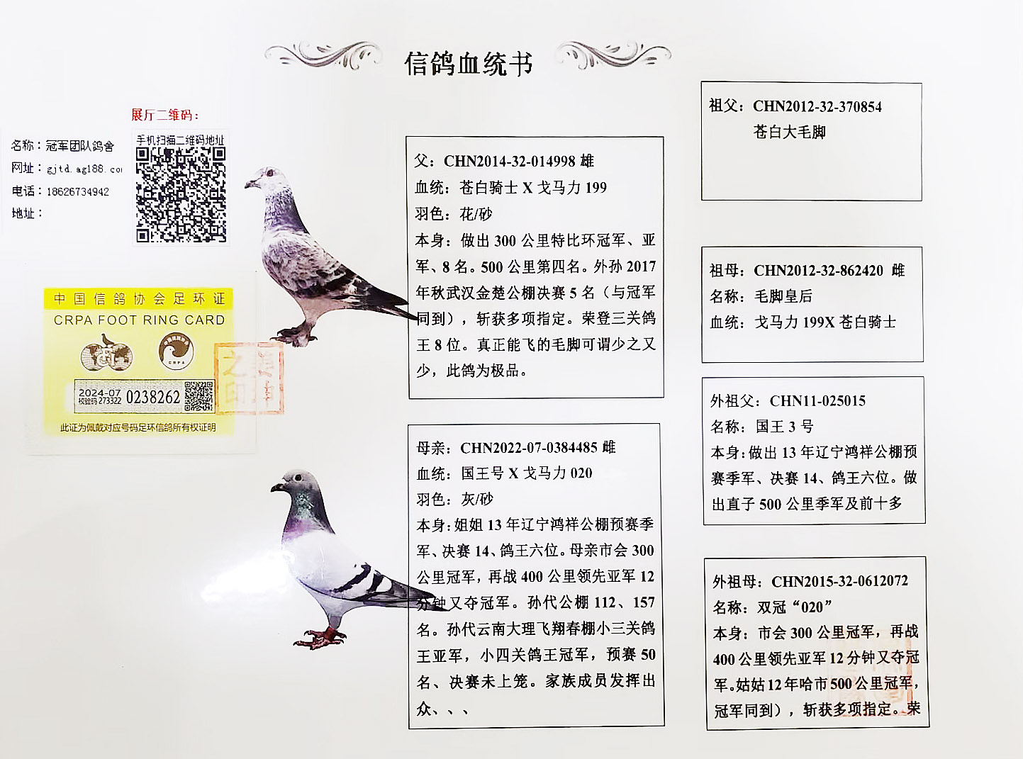 空间有限0元分享,假一赔百,拒卖百家鸽。机不可失。成绩、血统永久保真。血统书足环卡随鸽发出。
