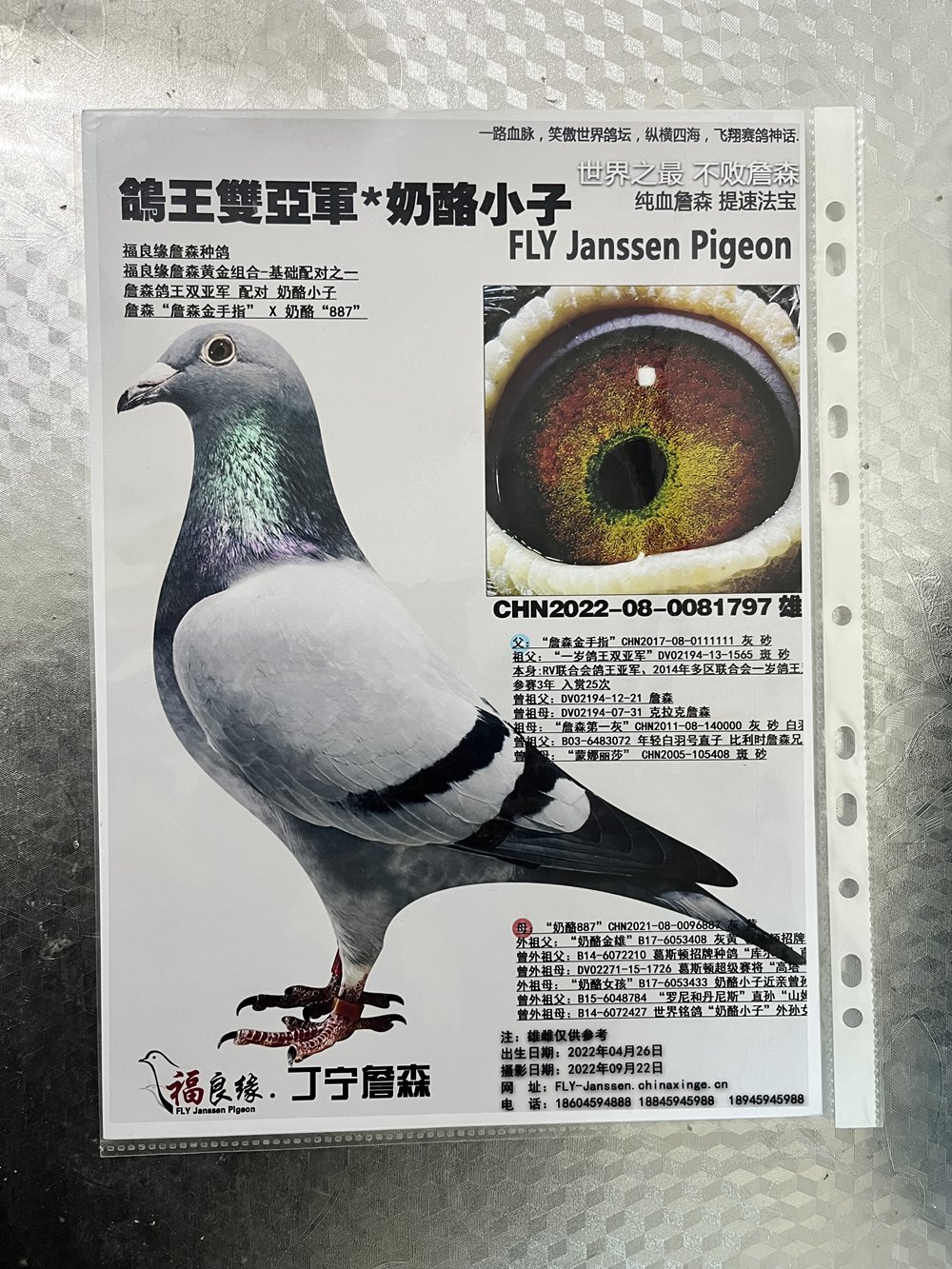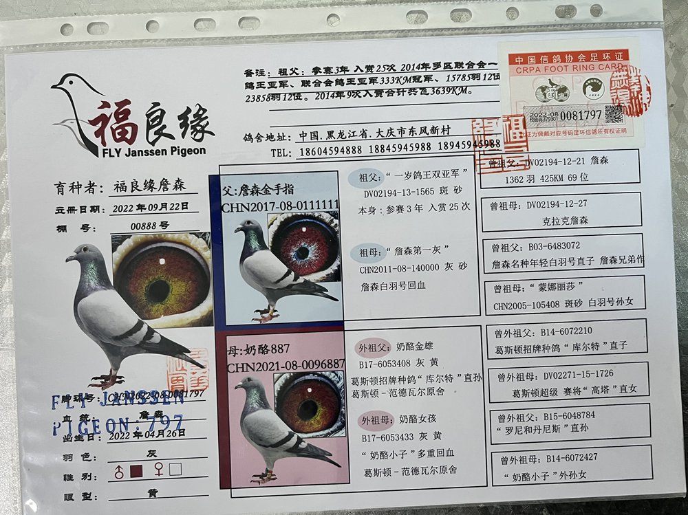 CHN22-08-0081797 雄 父:CHN2017-08-0111111 詹森金手指 母:CHN2021-08-0096887 奶酪887;鸽主:福良缘-丁宁詹森 咨询电话: 13601192027 白宇 (微信同号)运输方式:快递60/羽【新疆西藏包括】、长途车100元【不论羽数】、飞机400元"