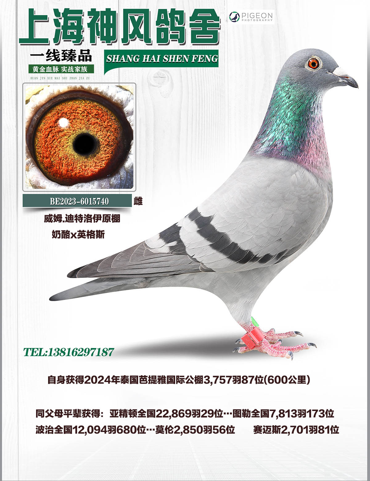 增祖父:02B2326226 新鸽王直孙 半兄弟贝泽国家赛赛区亚军 半兄弟钢铁侠 作出09年亚精顿国家赛15名