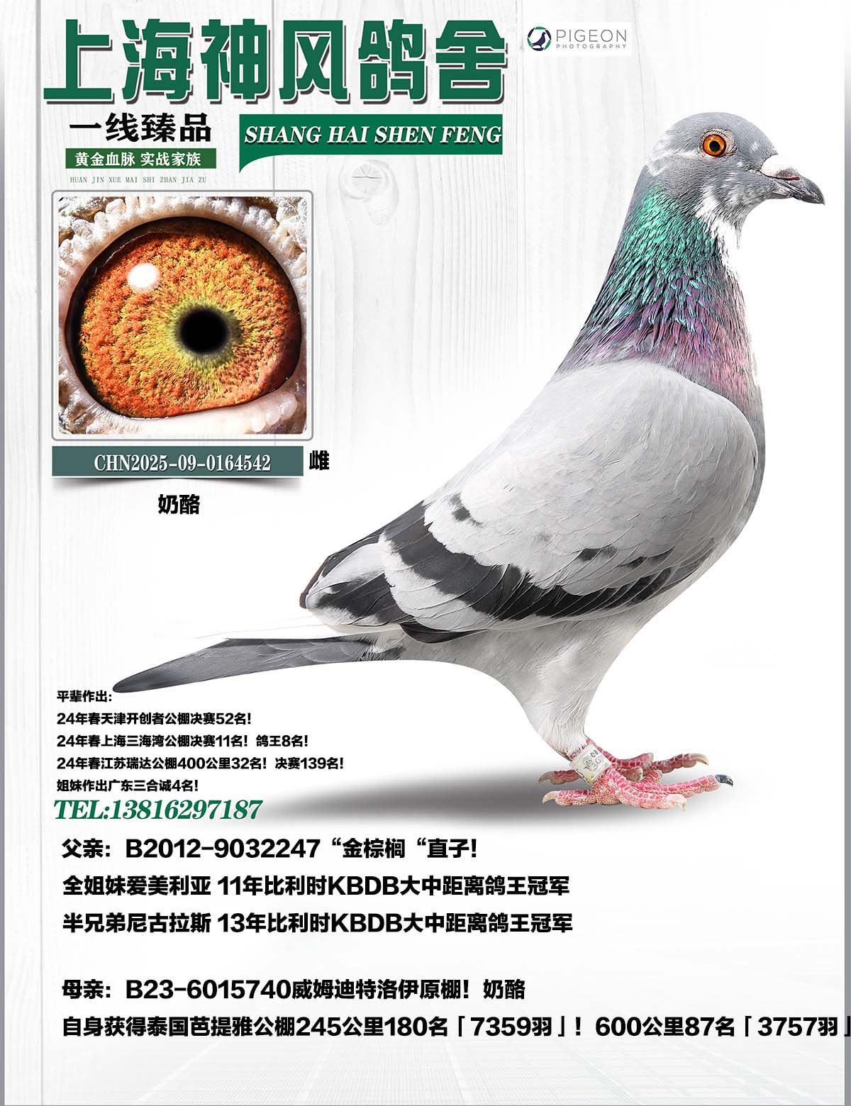 增祖父:02B2326226 新鸽王直孙 半兄弟贝泽国家赛赛区亚军 半兄弟钢铁侠 作出09年亚精顿国家赛15名