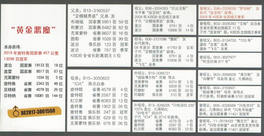 本身成绩:2011年比利时KBDB中距离全省鸽王季军,2009年亚精顿902羽冠军,全省5251羽亚军
