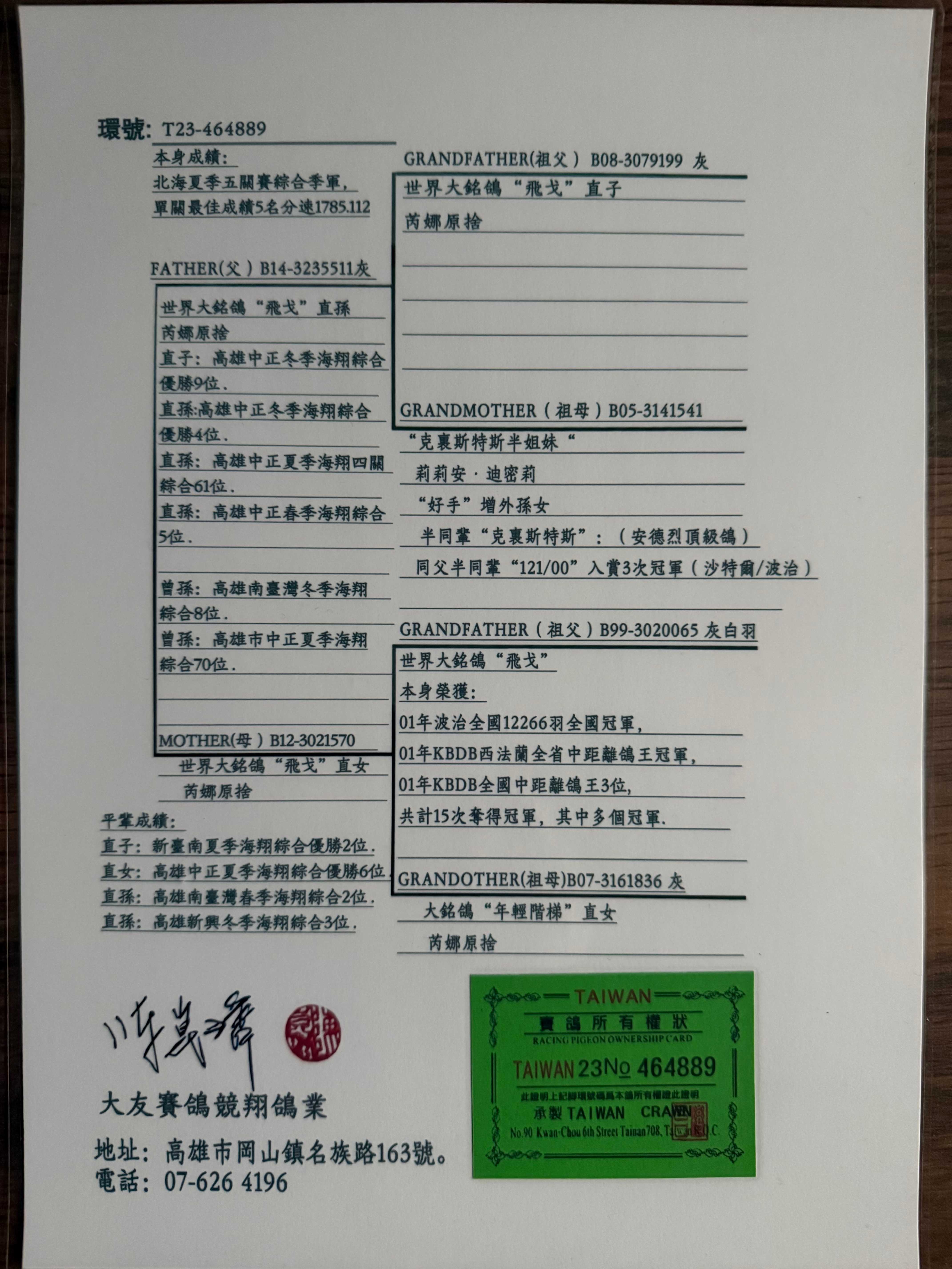 1615750 台湾飞鸿赛鸽竞翔作出 本身成绩四关鸽王综合8名 ¥0元 0次