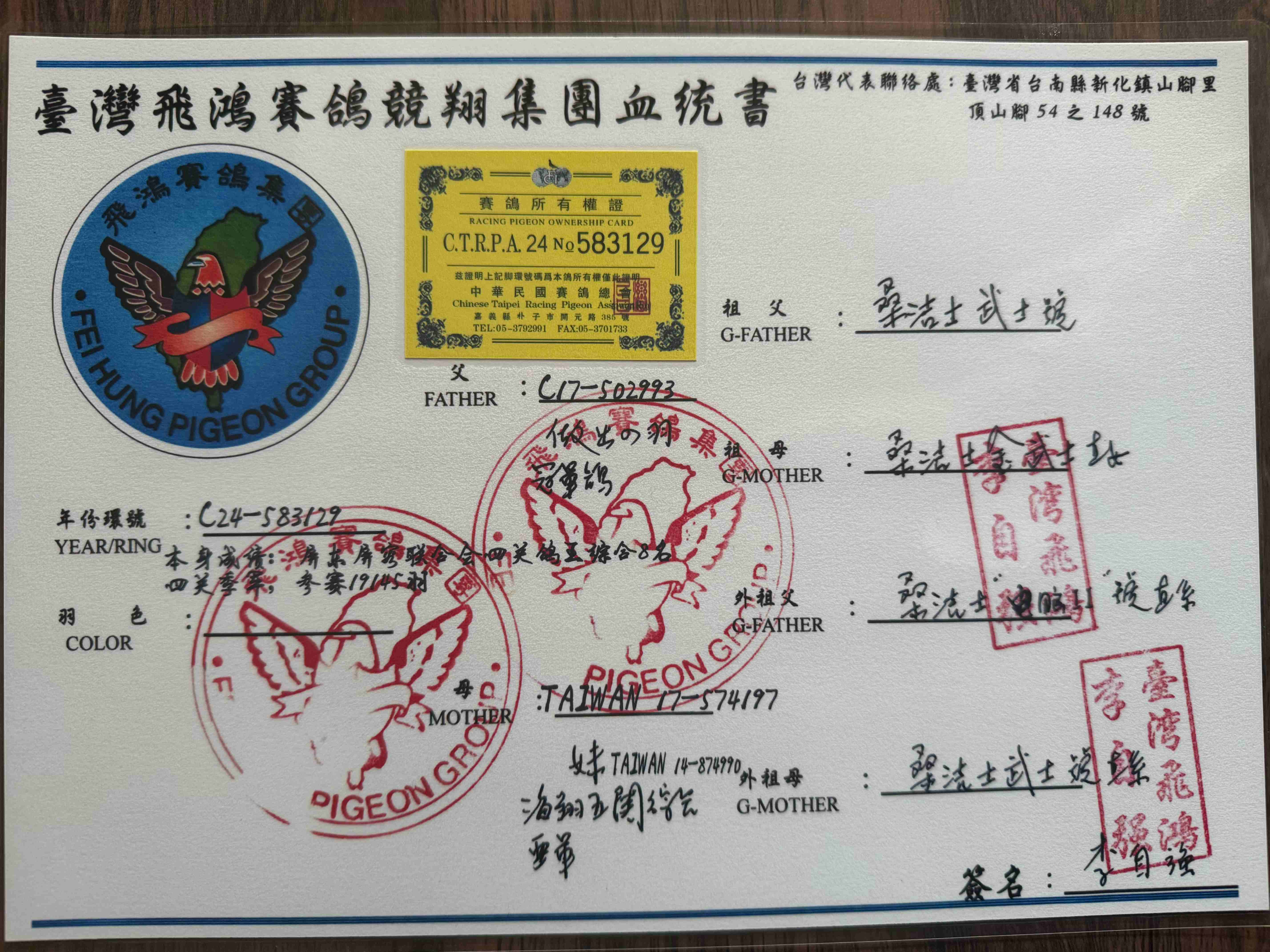 - 当前查看拍卖鸽:台湾飞鸿赛鸽竞翔作出 本身成绩四关鸽王综