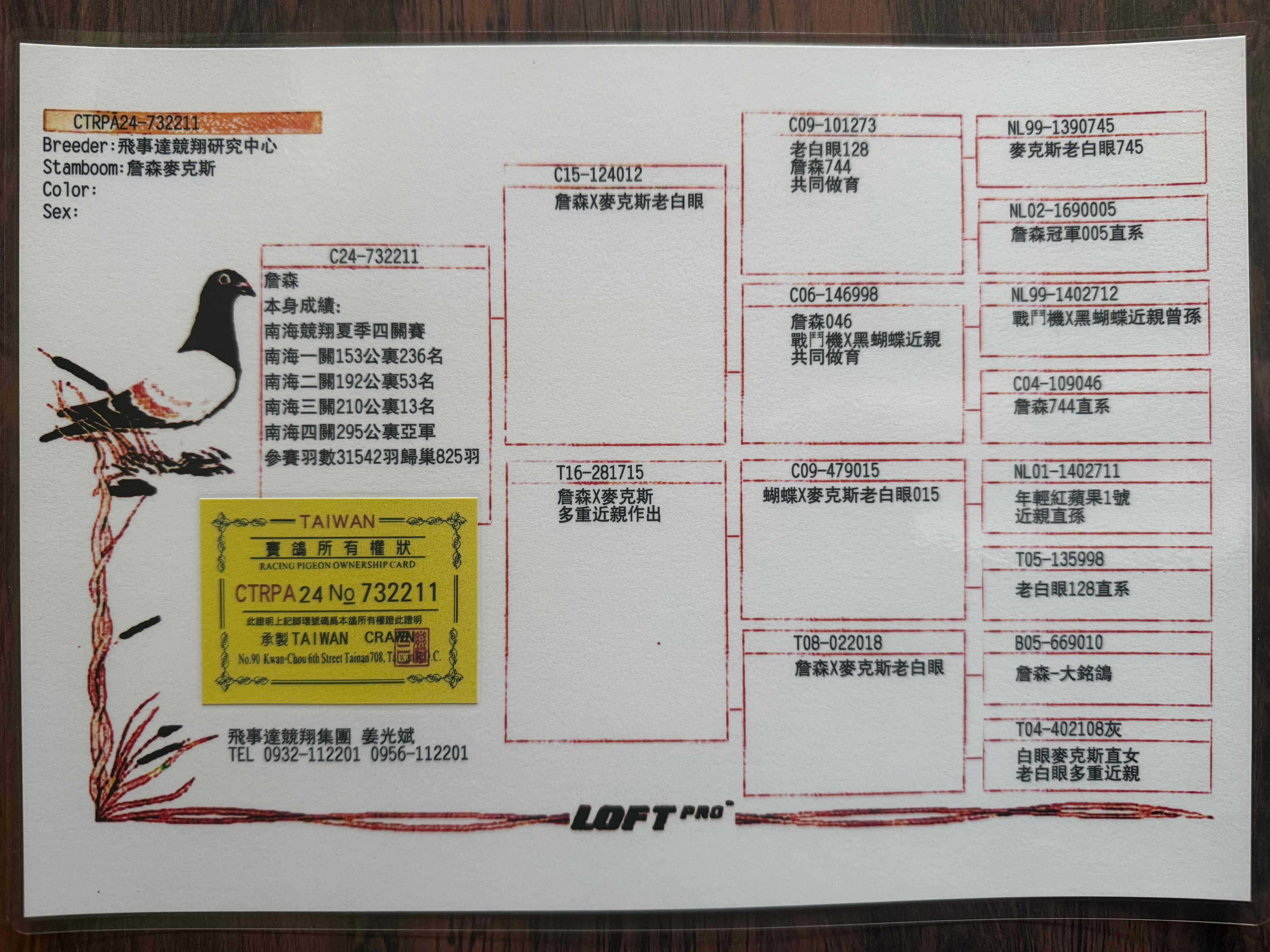 - 当前查看拍卖鸽:台湾飞事速翔研究中心血统:詹森“作出