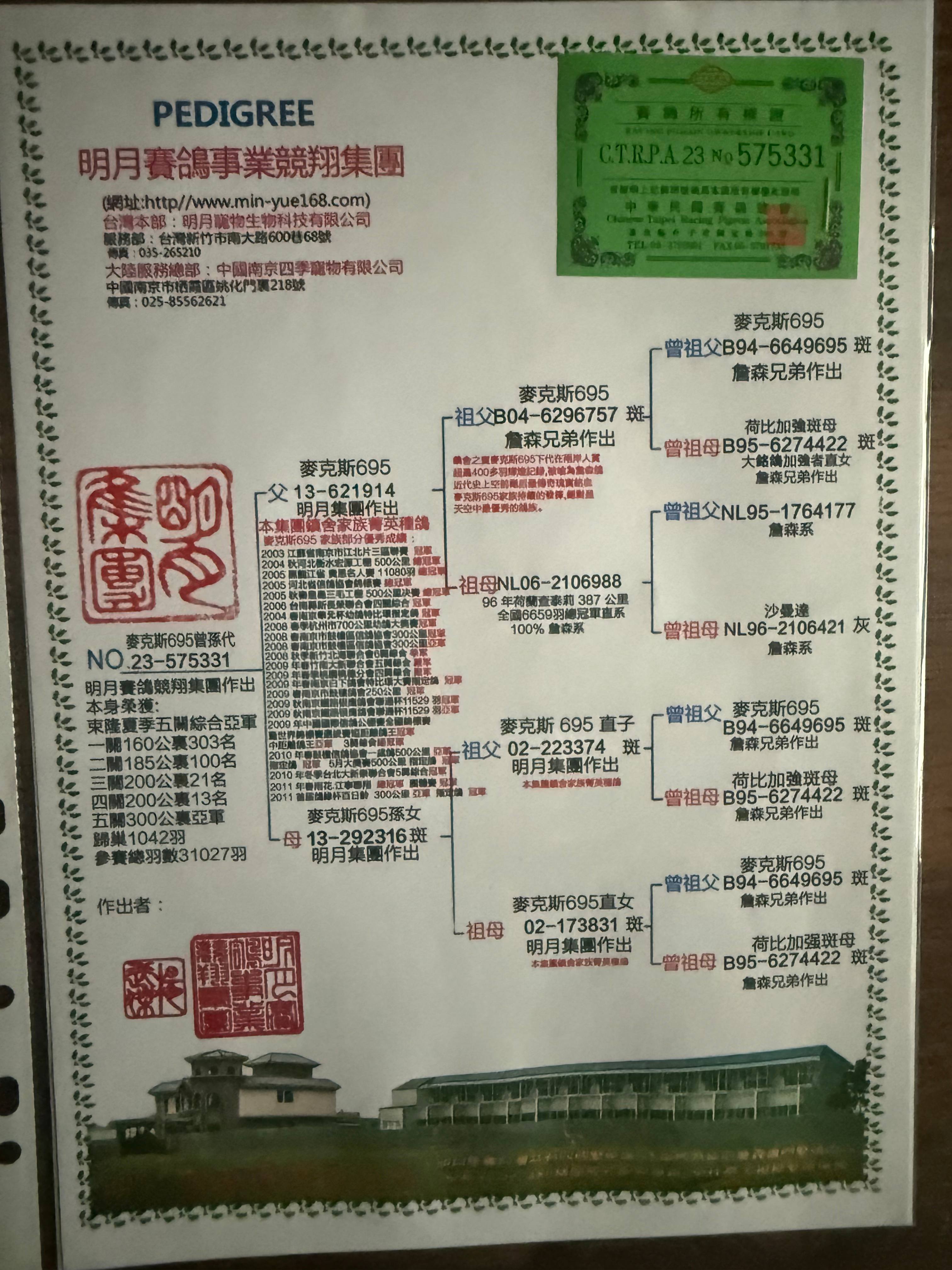 台湾明月赛鸽竞翔集团作出”麦克斯695曾孙代“