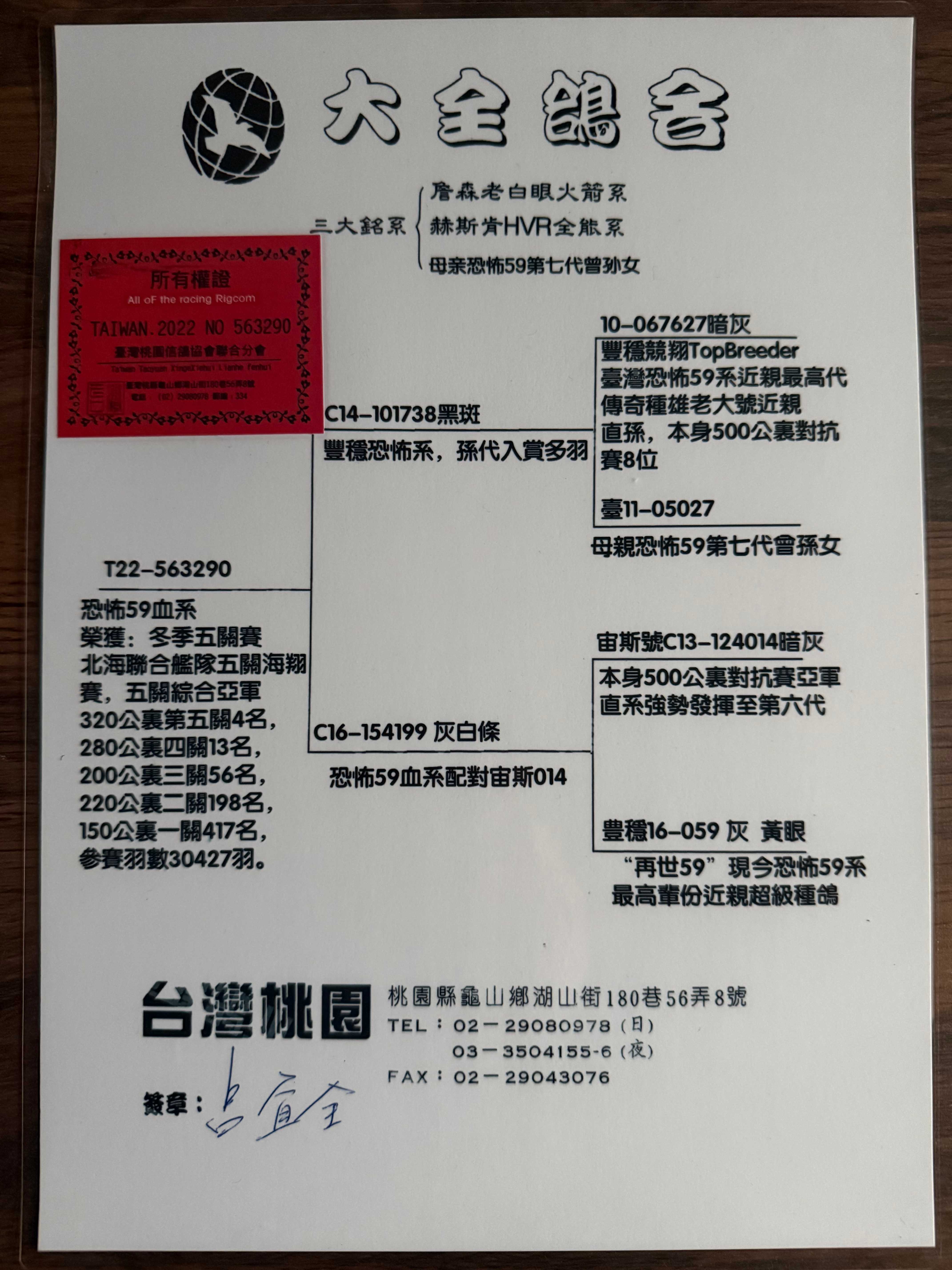 - 当前查看拍卖鸽:台湾大全鸽舍”恐怖59血系“ 本身成绩: