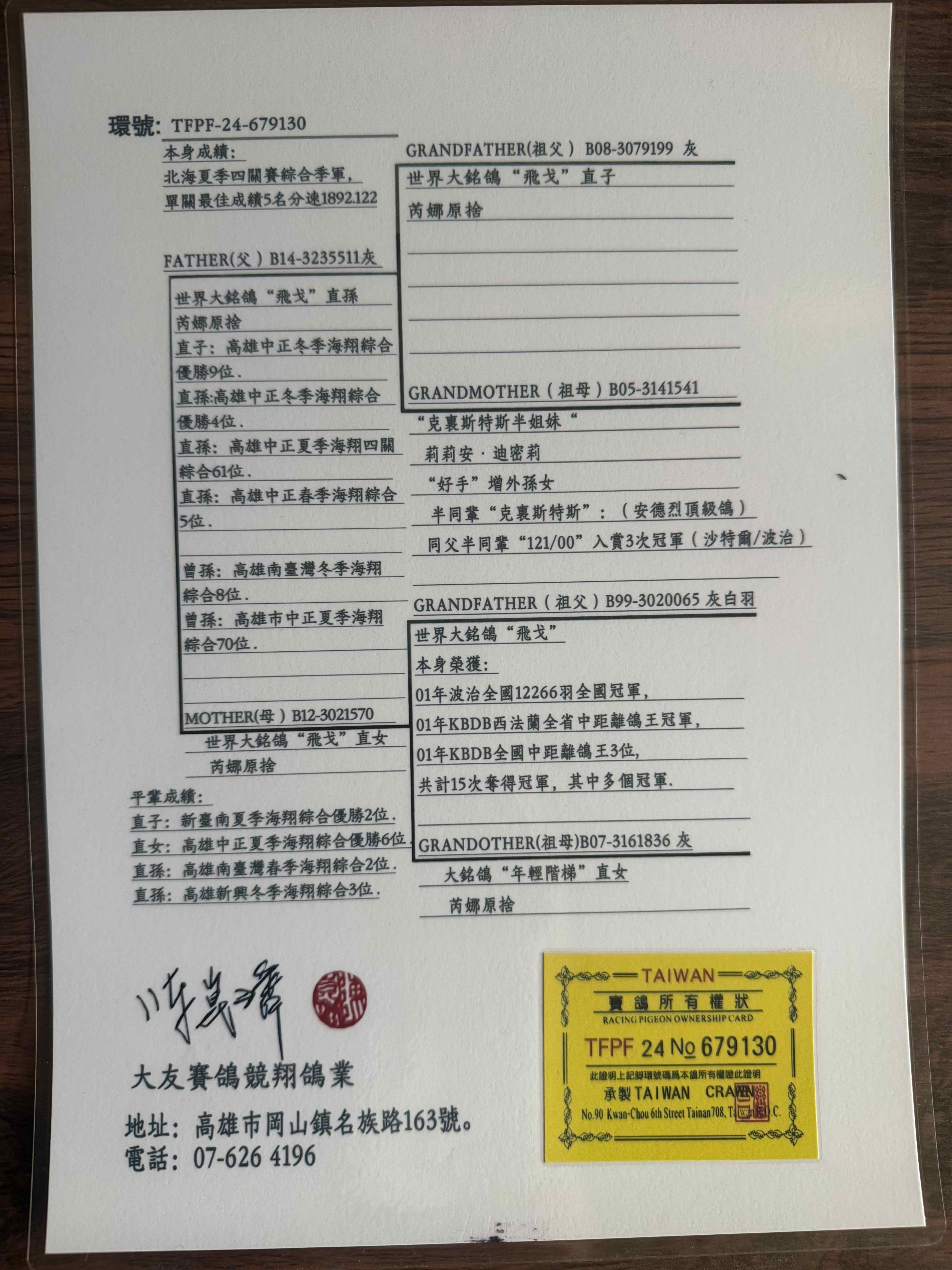 - 当前查看拍卖鸽:台湾大友赛鸽竞翔大铭鸽”飞戈“直系