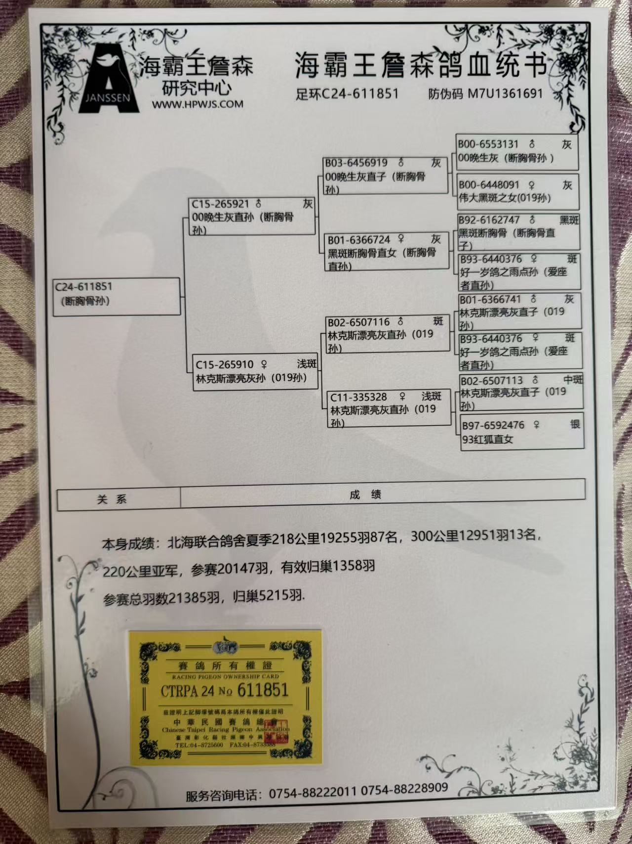 | 1615781 | 台湾强速鸽族传奇 ”詹森X芬妮卡血系“ | ¥0元 | 0次 |