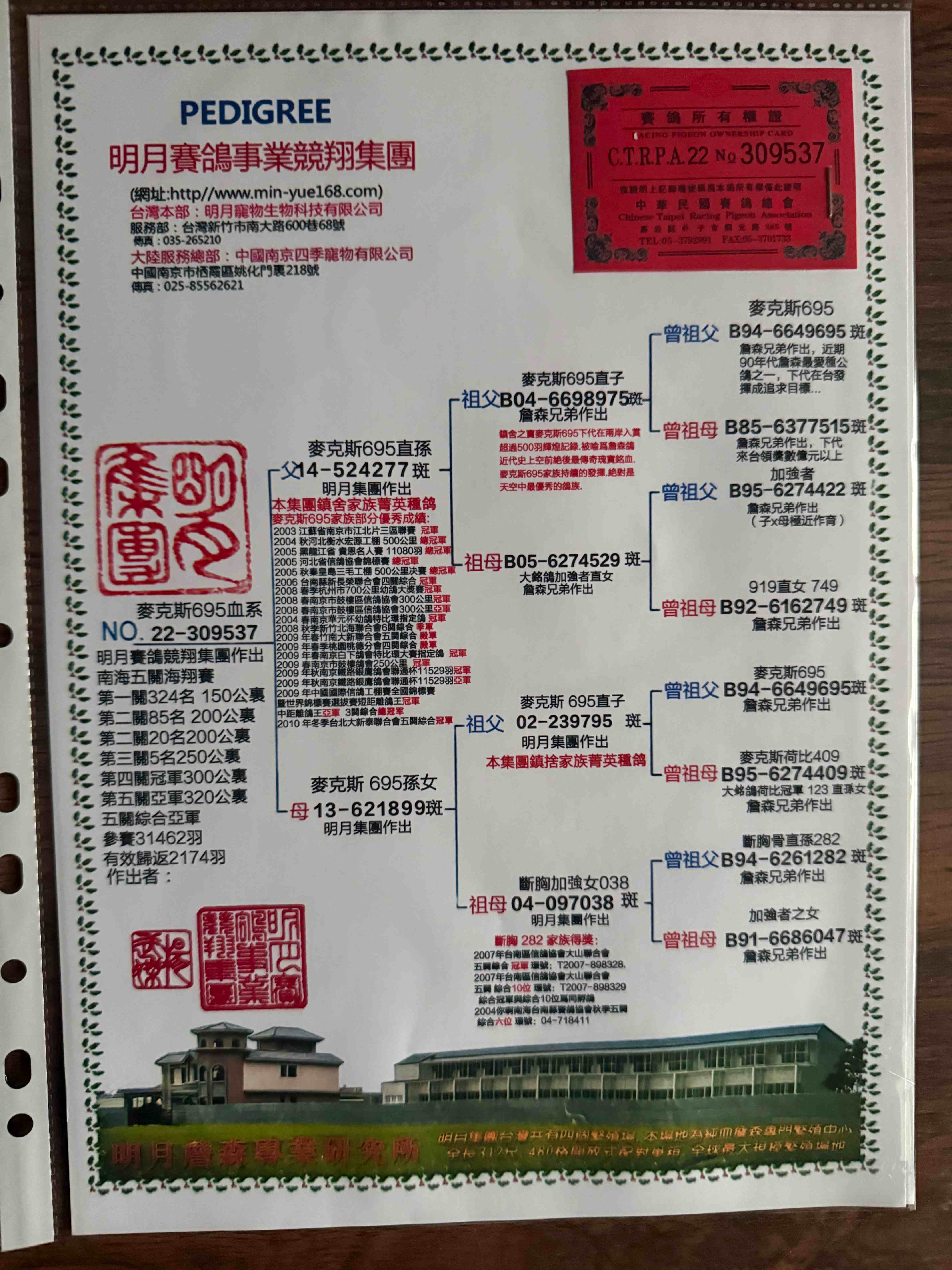 | 1615779 | 台湾明月赛鸽竞翔集团”麦克斯695血系“作出 | ¥0元 | 0次 |