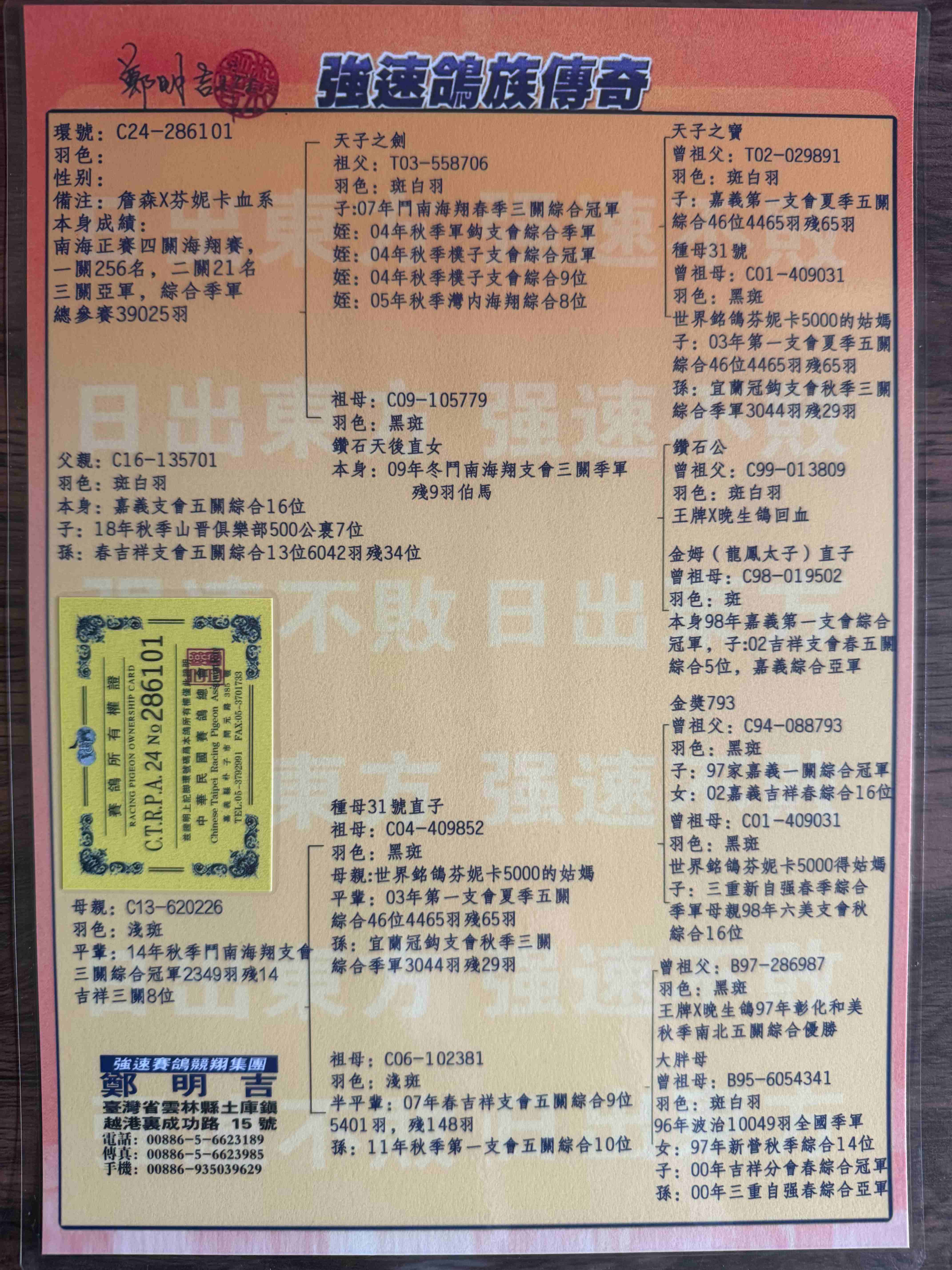 - 当前查看拍卖鸽:台湾强速鸽族传奇 ”詹森X芬妮卡血系“