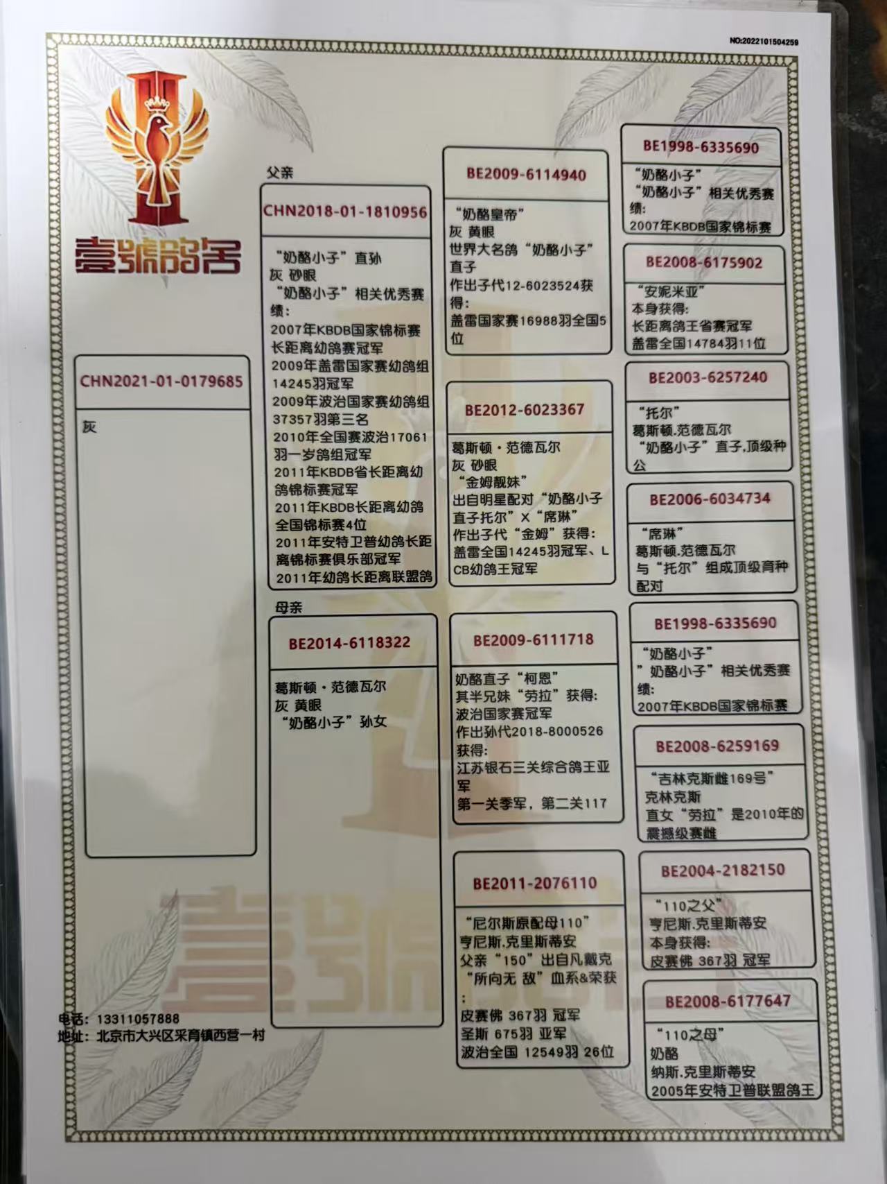 | 1615815 | 血统:”灰鸽王“曾孙代 长城鸽业作育 | ¥0元 | 0次 |