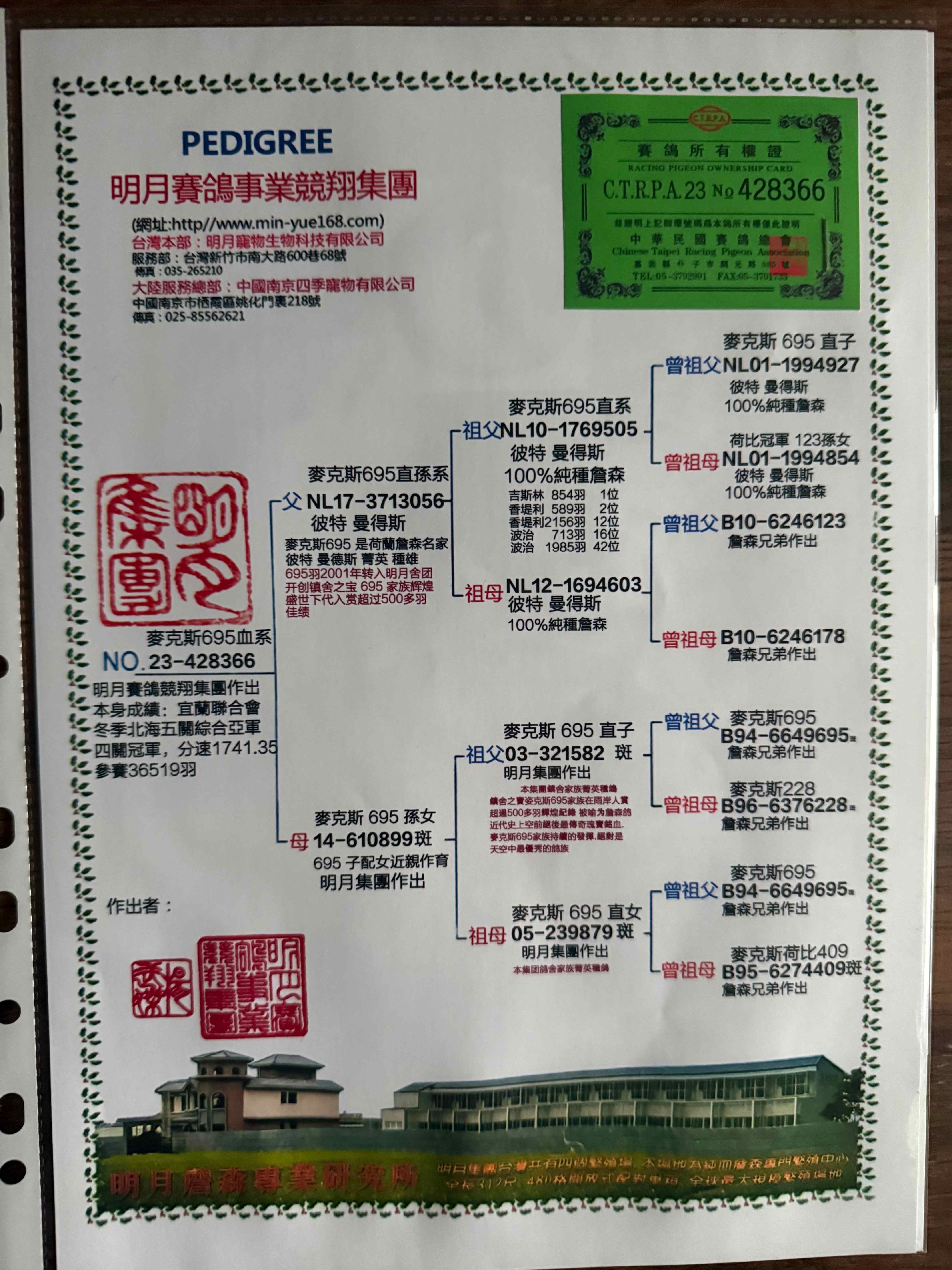 - 当前查看拍卖鸽:台湾明月赛鸽竞翔集团作出“麦克斯695血