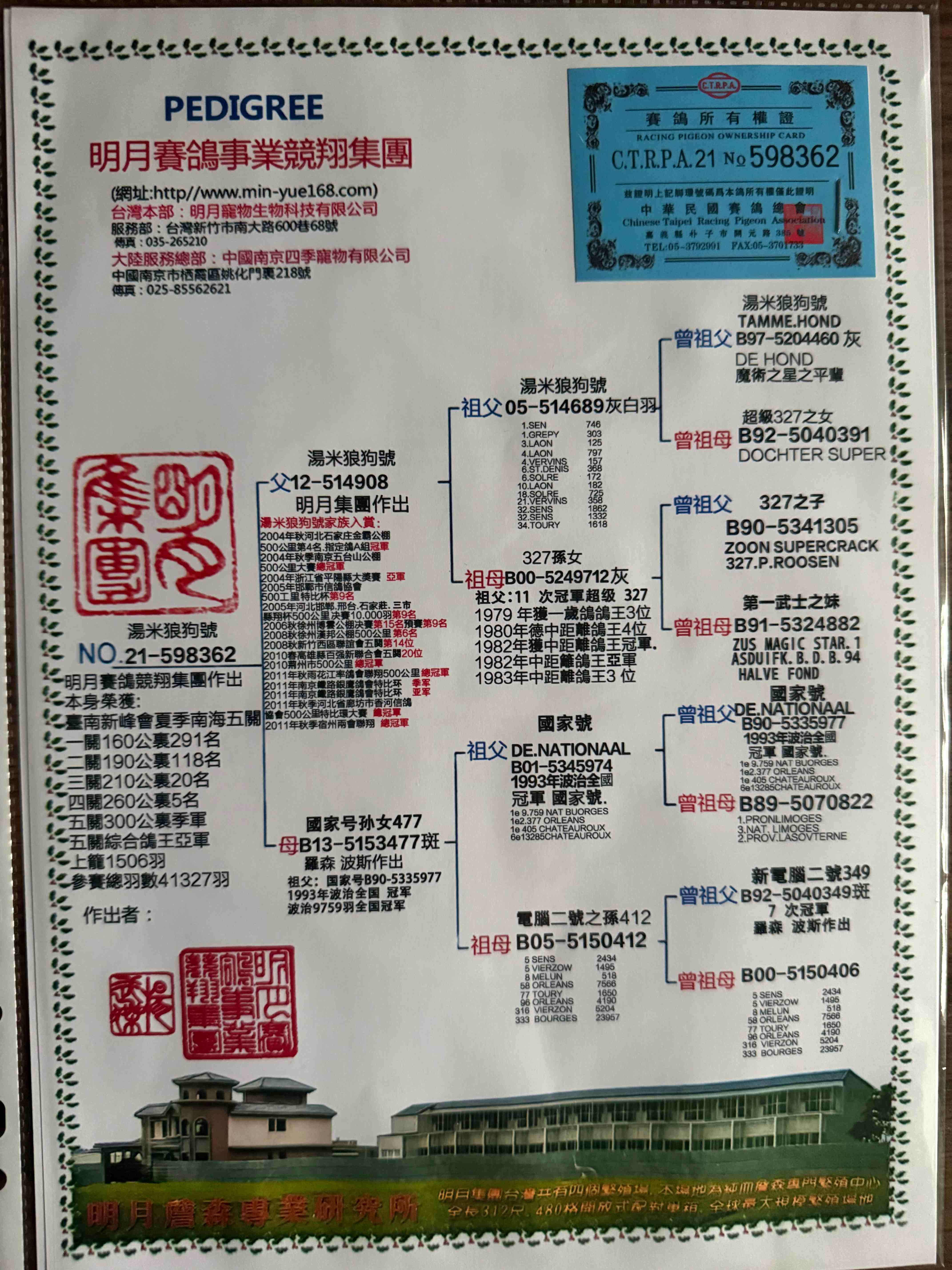- 当前查看拍卖鸽:台湾明月赛鸽作出血统”汤米狼狗号“