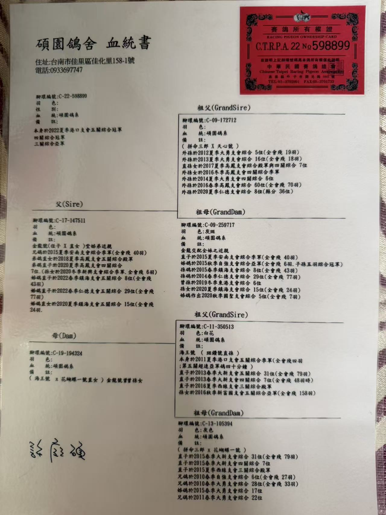 - 当前查看拍卖鸽:台湾硕园鸽舍作出 本身成绩五关综合冠军