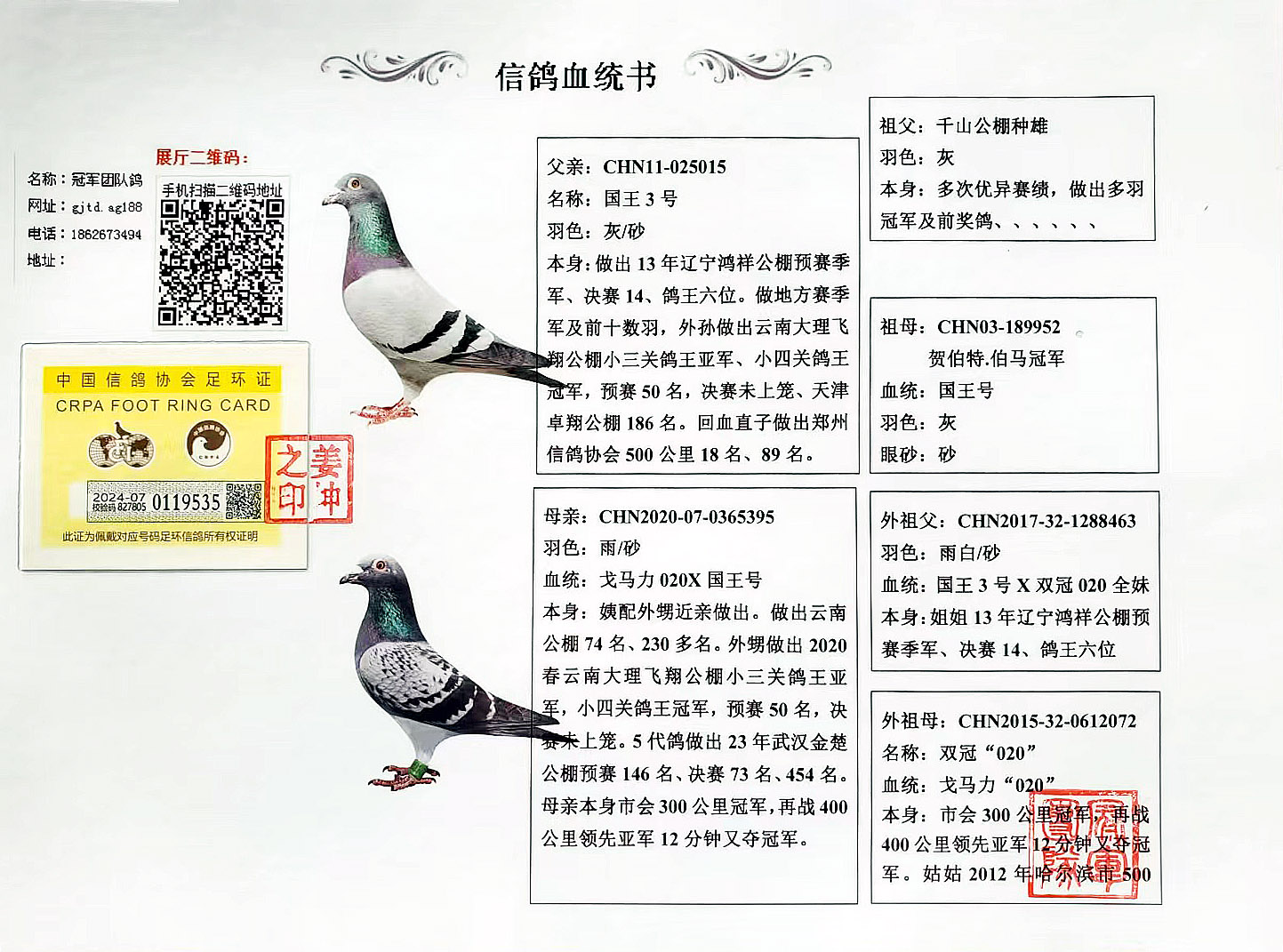 空间有限0元分享,假一赔百,拒卖百家鸽。机不可失。成绩、血统永久保真。血统书足环卡随鸽发出。