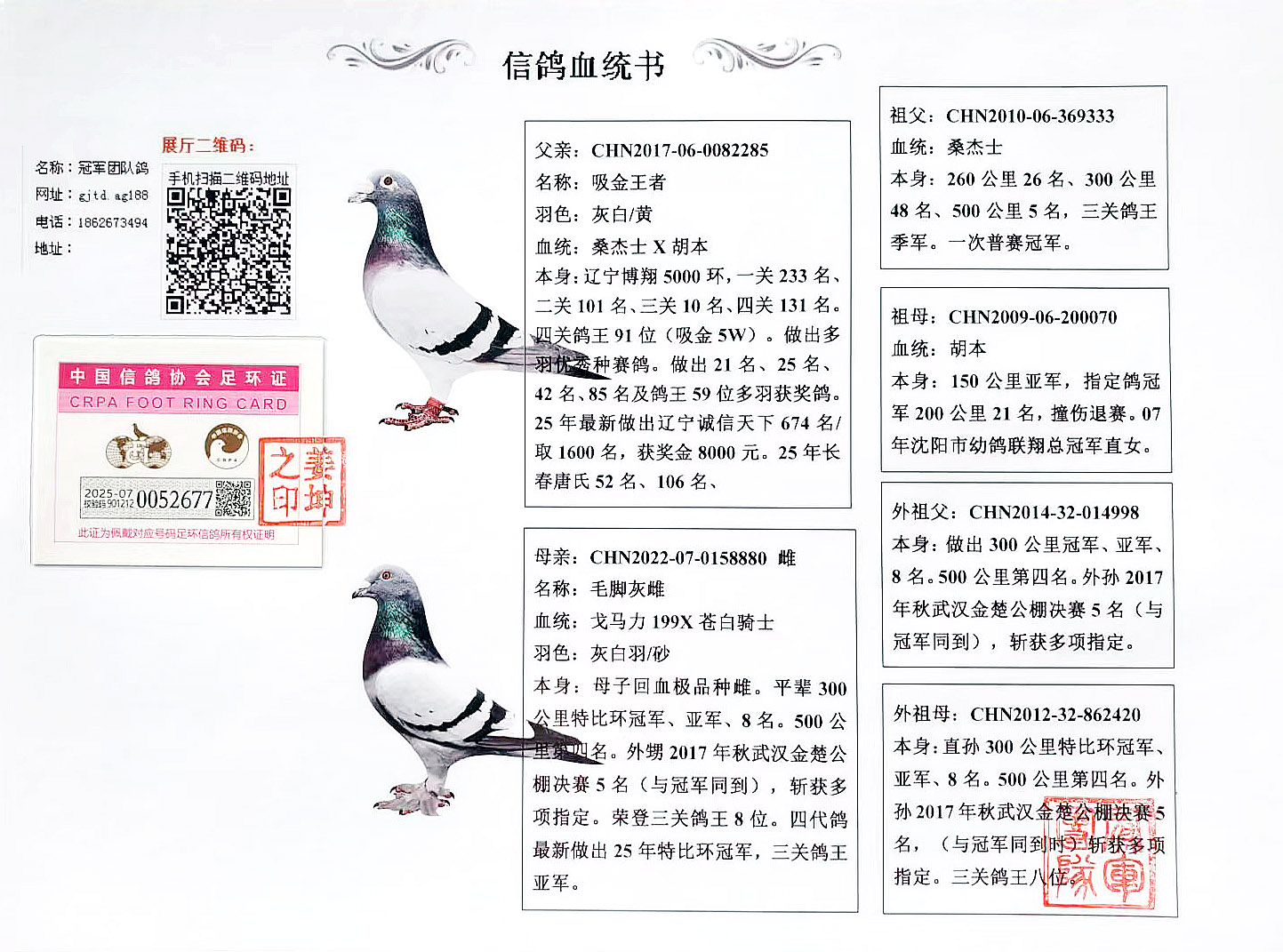 ***支援江西鸽友范先生用本舍国王号X戈马力大毛脚喜获25年特比环冠军、三关鸽王亚军的好成绩。
