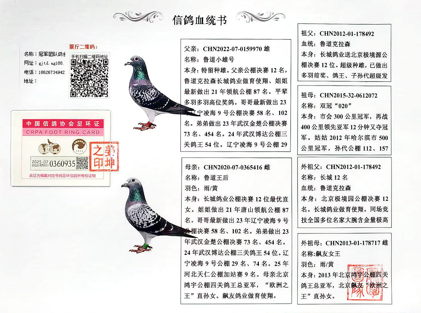 空间有限0元分享,假一赔百,拒卖百家鸽。机不可失。成绩、血统永久保真。血统书足环卡随鸽发出。