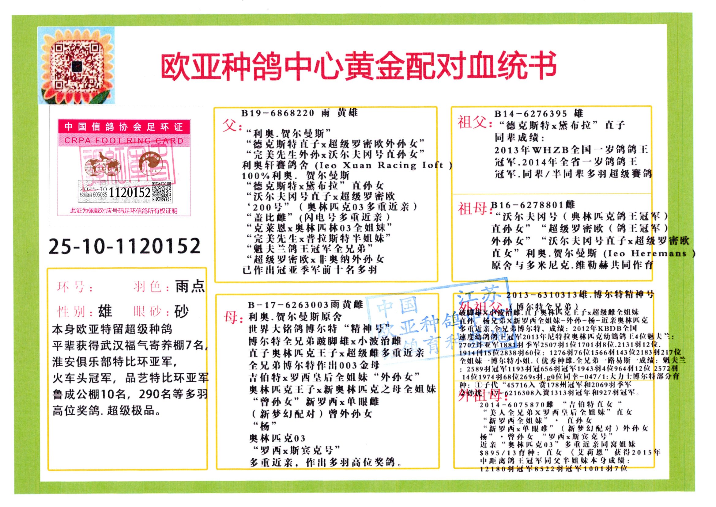 24年秋南京特比环欧亚荣获大团体冠军.小团体冠军551公里大特比13名.14名.16名.19名.20名.21名.24名.26名.27名.28名.42名.52名.54名.57名.65名.66名.68名.70名.71名.72名.74名.76名.80名.82名.83名.84名.85名.86名.90名.92名.110名.116名.121名.122名.128名.131名.158名.161名.164名.165名.166名.172名.174名.177名.182名.195名.196名.201名.205名.208名.210名.216名.253名.269名.275名.276名.294名.296名.299名,,24年秋云南天南铜都公棚决赛415名.天南铜都小棚决赛409名.云南玉活公棚决赛102名.490名.团体32名上笼二羽进二羽,天南铜都大棚506公里决赛445名。热烈祝贺河北省巨鹿县李兰生老师用欧亚泰山号血系连续十一年夺冠军,河北省国家赛冠军.全国季军等多次前十名高位,扬州王军王总用欧亚利奥24年春季获山东翔宇公棚决赛33名盖比53名。南京刘正龙刘总用欧亚盖比获得24年秋山东潍坊国际公棚决赛42名.精英赛30名.三关鸽王71名.决赛86名.加站赛16名.南京市特比环A组鸽王9名.B组鸽王5名.6名.C组鸽王5名.精英赛冠军4名.技能赛A组冠军4名.5名.秦淮区特比环荣获15名.46名.48名.87名。四川西昌徐亮徐总用欧亚利奥获得凉山州聚友决赛177名.第二关亚军双关鸽王19名.三关鸽王105名.云南豪庭公棚决赛603名。热烈祝贺24年四川重庆翔园鸽舍用欧亚泰山号荣获春季400公里冠军.秋季500公里冠军,河北王总用詹森X利奥获得千羽千翔公棚400公里冠军,广东蔡楷焕荣获24年秋爱好者 赛鸽俱乐部三关鸽王季军.一关420公里99名.二关450公里11名.三关520公里32名.单关季军.7名.12名,江西李卫兴荣获贵州红枫公棚8名.共翔俱乐部寄养棚四关综合鸽王30名.一关400公里78名.二关500公里55名.三关520公里37名.四关500公里57名.同父母获公棚18名.雷鸣获得武汉黄浦育翔中心冠军,四川陈文获得四川明鸿俱乐部300公里梦幻2名.3名.4名.9名.10名.13名.14名.15名.31名.34名.40名.41名.42名.43名.69名.71名.72名.73名.74名.94名.95名.97名.98名.99名.419公里决赛荣获总冠军7名.总共归巢9羽,四川徐亮获豪庭决赛603名,山西郑勇获得山西泰鑫公棚决赛255名詹森红狐,热烈祝贺马总获得开尔(飞跃队)决赛9名获奖金1310000万元.第一关52名,天津津福资赛180公里96名.获奖金429543万元,欧亚支持全国鸽友24年秋多人报喜 祝大家取得更好成绩,给欧亚报喜鸽友欧亚决定给每人赠送一羽超级种鸽。欧亚俱乐部特比环多关鸽王成绩:15年秋淮安特比环黑色星期一全会上笼9700多羽,当天无鸽归巢,第二天全会归巢357羽,本舍归巢158羽.前十名八羽.前一百名归巢57羽,16年春季获五关鸽王总冠军,总亚军四名.六名.七名.九名.十名.晶艺俱乐部520公里冠亚季军5名.6名.7名.9名.11名等,火车头冠军.季军6名.8名.9名.10名,16年秋晶艺俱乐部特比环520公里亚军.季军4名.6名.7名.9名,15年春南京白下特比环冠军.亚军.季军6名.7名.8名.9名.10名.指定鸽A B组获得冠军.亚军.季军4名.5名.,17年淮安特比环亚军.4名.5名.7名.8名.10名.六关鸽王总冠军.4名.6名.9名.10名,寄养棚宿迁刘总20羽特比环获冠军.季军.4名.7名.8名.9名等。18年荣获万羽特比环六关鸽王总冠军.总亚军.总季军.6名.8名.十名.单关四羽冠军.二羽亚军.四羽季军.前十名27羽。19年秋万羽特比环六关鸽王总亚军.总季军.5名.8名等,单关二羽冠军.三羽亚军.一羽季军前十名31羽。20年秋淮安市鸽会四关特比环大赛风雨无阻鸽王亚军.鸽王六名,金品俱乐部万羽特比环六关鸽王总冠军,总亚军.四名.五名.六名.七名.八名.十名.前二百名鸽王35羽,单关冠亚季军前十名四十多羽,火车头五关鸽王季军.六名.八名.前二百名鸽王十七羽。20年春荣获淮安五区一市四关鸽王总冠军.亚军.四名.八名.九名。21年秋荣获金品万羽特比环大赛六关鸽王总亚军.总季军.四名.七名.九名.十名.单关冠亚军季军前十名三十多羽。火车头协会鸽王六名.七名.十名.单关前十名十七羽。22年秋荣获鸽王总冠军.总亚军.5名.7名.8名.9名.11名.单关冠亚季军前十名三十多羽,第一关单关前二百名四十多羽,第二关前二百名三十多羽,第三关前二百名四十多羽,第四关前二百名四十多羽,第五关前一百名53羽。23年秋荣获鸽王季军.五名.八名.十名.13名.17名.20名.27名等多羽鸽王.单关前十名二十多羽。公棚.寄养棚部分成绩:16年秋宁夏黄河公棚总冠军电脑戈马力指定通炮冠军,17年送八羽参赛获得鸽王八名进奖四名,支持韩总荣获八名。支持鸽友荣获宁夏中卫公棚决赛总冠军.精英赛冠军,支持18年宁夏黄河公棚决赛冠军詹森X泰山。安徽鼎博寄养棚院内外四关鸽王总冠军.鸽王十七名.三十七名同窝,鸽王39名.42名.58名.67名。18年山东公棚预赛冠军.决赛65名.送八羽进奖五羽.指定获奔驰汽车一辆。支持鸽友获得云南蓝云公棚冠军.盖比X佛卡门。支持鸽友荣获云南银集公棚决赛冠军 詹森427X520血系 速度赛6700羽冠军。17年荣获金马俱乐部寄养棚四关鸽王总冠军.季军.六名.八名.第一关冠军.亚军.季军四名.七名.十一名.金牌教练奖。支持鸽友18年北京费翔公棚预赛九名电脑X桑杰士,支持鸽友荣获陕西威力公棚决赛11名.内蒙古临河寄养棚四关鸽王六名.詹森配泰山,支持河北王总用欧亚詹森427配胡本喜获20年秋开尔青年棚季军。云南东荣公棚16年预赛冠军.决赛77名.17年决赛12名.詹森红狐X泰山,17年平安公棚决赛4名 詹森427。欧亚获得21年金母寄养棚第一关四名.第二关5名.第三关5名.6名.7名.10名.三关鸽王总冠军,四关鸽王14名.十羽鸽王。支持河