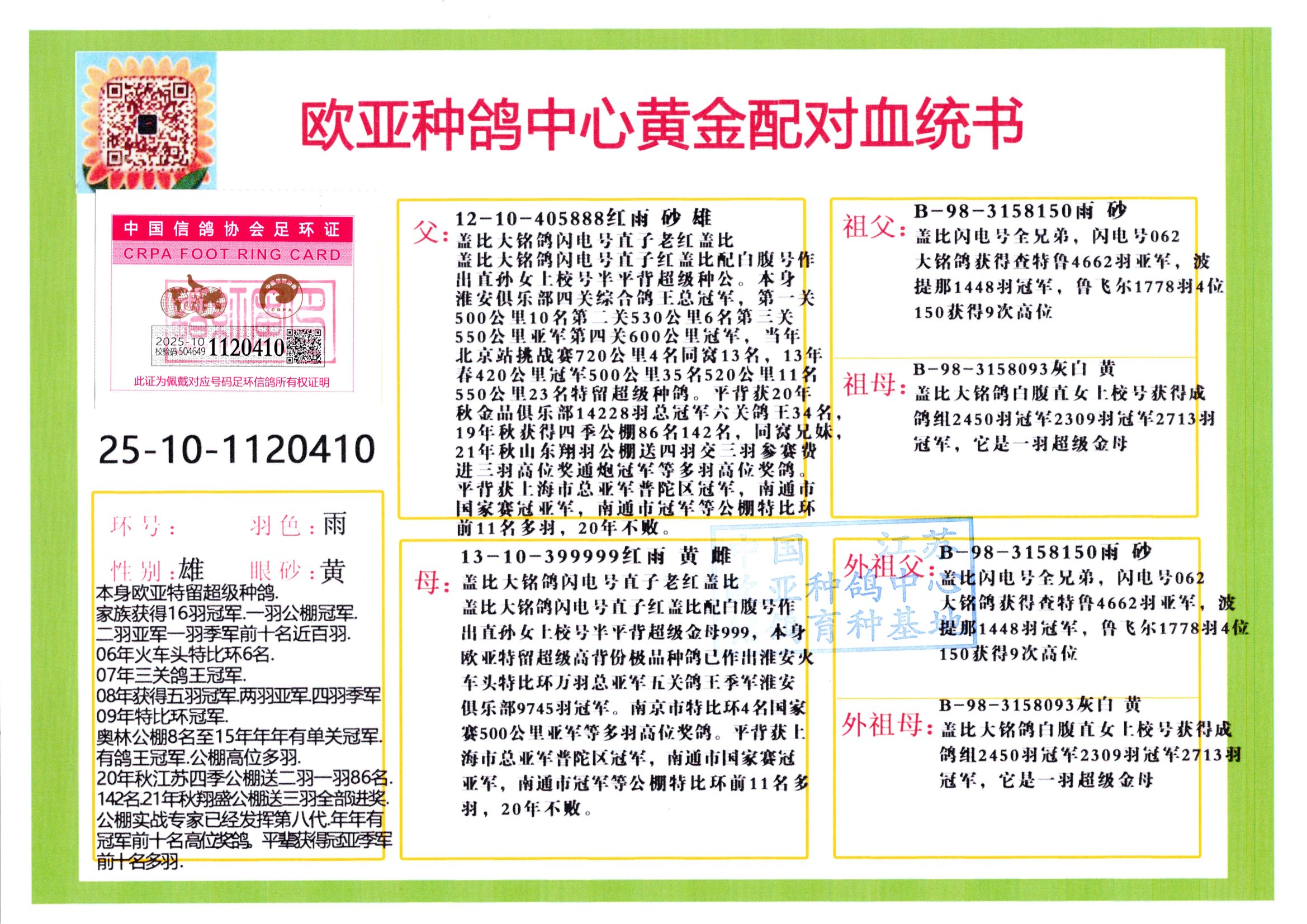 24年秋南京特比环欧亚荣获大团体冠军.小团体冠军551公里大特比13名.14名.16名.19名.20名.21名.24名.26名.27名.28名.42名.52名.54名.57名.65名.66名.68名.70名.71名.72名.74名.76名.80名.82名.83名.84名.85名.86名.90名.92名.110名.116名.121名.122名.128名.131名.158名.161名.164名.165名.166名.172名.174名.177名.182名.195名.196名.201名.205名.208名.210名.216名.253名.269名.275名.276名.294名.296名.299名,,24年秋云南天南铜都公棚决赛415名.天南铜都小棚决赛409名.云南玉活公棚决赛102名.490名.团体32名上笼二羽进二羽,天南铜都大棚506公里决赛445名。热烈祝贺河北省巨鹿县李兰生老师用欧亚泰山号血系连续十一年夺冠军,河北省国家赛冠军.全国季军等多次前十名高位,扬州王军王总用欧亚利奥24年春季获山东翔宇公棚决赛33名盖比53名。南京刘正龙刘总用欧亚盖比获得24年秋山东潍坊国际公棚决赛42名.精英赛30名.三关鸽王71名.决赛86名.加站赛16名.南京市特比环A组鸽王9名.B组鸽王5名.6名.C组鸽王5名.精英赛冠军4名.技能赛A组冠军4名.5名.秦淮区特比环荣获15名.46名.48名.87名。四川西昌徐亮徐总用欧亚利奥获得凉山州聚友决赛177名.第二关亚军双关鸽王19名.三关鸽王105名.云南豪庭公棚决赛603名。热烈祝贺24年四川重庆翔园鸽舍用欧亚泰山号荣获春季400公里冠军.秋季500公里冠军,河北王总用詹森X利奥获得千羽千翔公棚400公里冠军,广东蔡楷焕荣获24年秋爱好者 赛鸽俱乐部三关鸽王季军.一关420公里99名.二关450公里11名.三关520公里32名.单关季军.7名.12名,江西李卫兴荣获贵州红枫公棚8名.共翔俱乐部寄养棚四关综合鸽王30名.一关400公里78名.二关500公里55名.三关520公里37名.四关500公里57名.同父母获公棚18名.雷鸣获得武汉黄浦育翔中心冠军,四川陈文获得四川明鸿俱乐部300公里梦幻2名.3名.4名.9名.10名.13名.14名.15名.31名.34名.40名.41名.42名.43名.69名.71名.72名.73名.74名.94名.95名.97名.98名.99名.419公里决赛荣获总冠军7名.总共归巢9羽,四川徐亮获豪庭决赛603名,山西郑勇获得山西泰鑫公棚决赛255名詹森红狐,热烈祝贺马总获得开尔(飞跃队)决赛9名获奖金1310000万元.第一关52名,天津津福资赛180公里96名.获奖金429543万元,欧亚支持全国鸽友24年秋多人报喜 祝大家取得更好成绩,给欧亚报喜鸽友欧亚决定给每人赠送一羽超级种鸽。欧亚俱乐部特比环多关鸽王成绩:15年秋淮安特比环黑色星期一全会上笼9700多羽,当天无鸽归巢,第二天全会归巢357羽,本舍归巢158羽.前十名八羽.前一百名归巢57羽,16年春季获五关鸽王总冠军,总亚军四名.六名.七名.九名.十名.晶艺俱乐部520公里冠亚季军5名.6名.7名.9名.11名等,火车头冠军.季军6名.8名.9名.10名,16年秋晶艺俱乐部特比环520公里亚军.季军4名.6名.7名.9名,15年春南京白下特比环冠军.亚军.季军6名.7名.8名.9名.10名.指定鸽A B组获得冠军.亚军.季军4名.5名.,17年淮安特比环亚军.4名.5名.7名.8名.10名.六关鸽王总冠军.4名.6名.9名.10名,寄养棚宿迁刘总20羽特比环获冠军.季军.4名.7名.8名.9名等。18年荣获万羽特比环六关鸽王总冠军.总亚军.总季军.6名.8名.十名.单关四羽冠军.二羽亚军.四羽季军.前十名27羽。19年秋万羽特比环六关鸽王总亚军.总季军.5名.8名等,单关二羽冠军.三羽亚军.一羽季军前十名31羽。20年秋淮安市鸽会四关特比环大赛风雨无阻鸽王亚军.鸽王六名,金品俱乐部万羽特比环六关鸽王总冠军,总亚军.四名.五名.六名.七名.八名.十名.前二百名鸽王35羽,单关冠亚季军前十名四十多羽,火车头五关鸽王季军.六名.八名.前二百名鸽王十七羽。20年春荣获淮安五区一市四关鸽王总冠军.亚军.四名.八名.九名。21年秋荣获金品万羽特比环大赛六关鸽王总亚军.总季军.四名.七名.九名.十名.单关冠亚军季军前十名三十多羽。火车头协会鸽王六名.七名.十名.单关前十名十七羽。22年秋荣获鸽王总冠军.总亚军.5名.7名.8名.9名.11名.单关冠亚季军前十名三十多羽,第一关单关前二百名四十多羽,第二关前二百名三十多羽,第三关前二百名四十多羽,第四关前二百名四十多羽,第五关前一百名53羽。23年秋荣获鸽王季军.五名.八名.十名.13名.17名.20名.27名等多羽鸽王.单关前十名二十多羽。公棚.寄养棚部分成绩:16年秋宁夏黄河公棚总冠军电脑戈马力指定通炮冠军,17年送八羽参赛获得鸽王八名进奖四名,支持韩总荣获八名。支持鸽友荣获宁夏中卫公棚决赛总冠军.精英赛冠军,支持18年宁夏黄河公棚决赛冠军詹森X泰山。安徽鼎博寄养棚院内外四关鸽王总冠军.鸽王十七名.三十七名同窝,鸽王39名.42名.58名.67名。18年山东公棚预赛冠军.决赛65名.送八羽进奖五羽.指定获奔驰汽车一辆。支持鸽友获得云南蓝云公棚冠军.盖比X佛卡门。支持鸽友荣获云南银集公棚决赛冠军 詹森427X520血系 速度赛6700羽冠军。17年荣获金马俱乐部寄养棚四关鸽王总冠军.季军.六名.八名.第一关冠军.亚军.季军四名.七名.十一名.金牌教练奖。支持鸽友18年北京费翔公棚预赛九名电脑X桑杰士,支持鸽友荣获陕西威力公棚决赛11名.内蒙古临河寄养棚四关鸽王六名.詹森配泰山,支持河北王总用欧亚詹森427配胡本喜获20年秋开尔青年棚季军。云南东荣公棚16年预赛冠军.决赛77名.17年决赛12名.詹森红狐X泰山,17年平安公棚决赛4名 詹森427。欧亚获得21年金母寄养棚第一关四名.第二关5名.第三关5名.6名.7名.10名.三关鸽王总冠军,四关鸽王14名.十羽鸽王。支持河