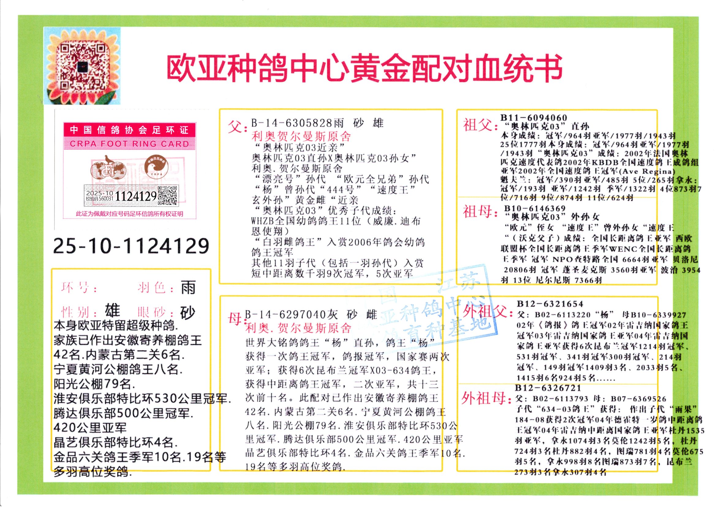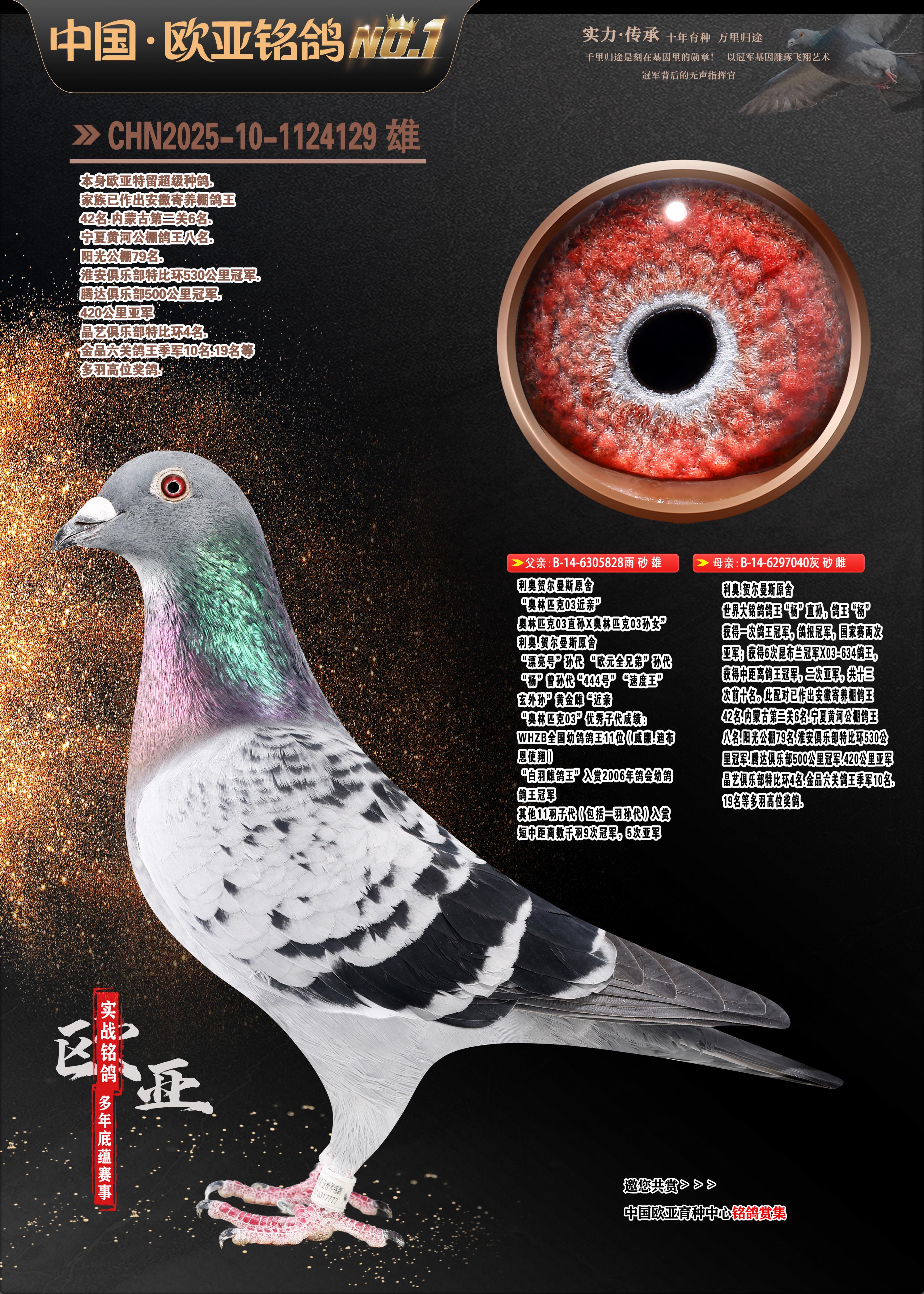 24年秋南京特比环欧亚荣获大团体冠军.小团体冠军551公里大特比13名.14名.16名.19名.20名.21名.24名.26名.27名.28名.42名.52名.54名.57名.65名.66名.68名.70名.71名.72名.74名.76名.80名.82名.83名.84名.85名.86名.90名.92名.110名.116名.121名.122名.128名.131名.158名.161名.164名.165名.166名.172名.174名.177名.182名.195名.196名.201名.205名.208名.210名.216名.253名.269名.275名.276名.294名.296名.299名,,24年秋云南天南铜都公棚决赛415名.天南铜都小棚决赛409名.云南玉活公棚决赛102名.490名.团体32名上笼二羽进二羽,天南铜都大棚506公里决赛445名。热烈祝贺河北省巨鹿县李兰生老师用欧亚泰山号血系连续十一年夺冠军,河北省国家赛冠军.全国季军等多次前十名高位,扬州王军王总用欧亚利奥24年春季获山东翔宇公棚决赛33名盖比53名。南京刘正龙刘总用欧亚盖比获得24年秋山东潍坊国际公棚决赛42名.精英赛30名.三关鸽王71名.决赛86名.加站赛16名.南京市特比环A组鸽王9名.B组鸽王5名.6名.C组鸽王5名.精英赛冠军4名.技能赛A组冠军4名.5名.秦淮区特比环荣获15名.46名.48名.87名。四川西昌徐亮徐总用欧亚利奥获得凉山州聚友决赛177名.第二关亚军双关鸽王19名.三关鸽王105名.云南豪庭公棚决赛603名。热烈祝贺24年四川重庆翔园鸽舍用欧亚泰山号荣获春季400公里冠军.秋季500公里冠军,河北王总用詹森X利奥获得千羽千翔公棚400公里冠军,广东蔡楷焕荣获24年秋爱好者 赛鸽俱乐部三关鸽王季军.一关420公里99名.二关450公里11名.三关520公里32名.单关季军.7名.12名,江西李卫兴荣获贵州红枫公棚8名.共翔俱乐部寄养棚四关综合鸽王30名.一关400公里78名.二关500公里55名.三关520公里37名.四关500公里57名.同父母获公棚18名.雷鸣获得武汉黄浦育翔中心冠军,四川陈文获得四川明鸿俱乐部300公里梦幻2名.3名.4名.9名.10名.13名.14名.15名.31名.34名.40名.41名.42名.43名.69名.71名.72名.73名.74名.94名.95名.97名.98名.99名.419公里决赛荣获总冠军7名.总共归巢9羽,四川徐亮获豪庭决赛603名,山西郑勇获得山西泰鑫公棚决赛255名詹森红狐,热烈祝贺马总获得开尔(飞跃队)决赛9名获奖金1310000万元.第一关52名,天津津福资赛180公里96名.获奖金429543万元,欧亚支持全国鸽友24年秋多人报喜 祝大家取得更好成绩,给欧亚报喜鸽友欧亚决定给每人赠送一羽超级种鸽。欧亚俱乐部特比环多关鸽王成绩:15年秋淮安特比环黑色星期一全会上笼9700多羽,当天无鸽归巢,第二天全会归巢357羽,本舍归巢158羽.前十名八羽.前一百名归巢57羽,16年春季获五关鸽王总冠军,总亚军四名.六名.七名.九名.十名.晶艺俱乐部520公里冠亚季军5名.6名.7名.9名.11名等,火车头冠军.季军6名.8名.9名.10名,16年秋晶艺俱乐部特比环520公里亚军.季军4名.6名.7名.9名,15年春南京白下特比环冠军.亚军.季军6名.7名.8名.9名.10名.指定鸽A B组获得冠军.亚军.季军4名.5名.,17年淮安特比环亚军.4名.5名.7名.8名.10名.六关鸽王总冠军.4名.6名.9名.10名,寄养棚宿迁刘总20羽特比环获冠军.季军.4名.7名.8名.9名等。18年荣获万羽特比环六关鸽王总冠军.总亚军.总季军.6名.8名.十名.单关四羽冠军.二羽亚军.四羽季军.前十名27羽。19年秋万羽特比环六关鸽王总亚军.总季军.5名.8名等,单关二羽冠军.三羽亚军.一羽季军前十名31羽。20年秋淮安市鸽会四关特比环大赛风雨无阻鸽王亚军.鸽王六名,金品俱乐部万羽特比环六关鸽王总冠军,总亚军.四名.五名.六名.七名.八名.十名.前二百名鸽王35羽,单关冠亚季军前十名四十多羽,火车头五关鸽王季军.六名.八名.前二百名鸽王十七羽。20年春荣获淮安五区一市四关鸽王总冠军.亚军.四名.八名.九名。21年秋荣获金品万羽特比环大赛六关鸽王总亚军.总季军.四名.七名.九名.十名.单关冠亚军季军前十名三十多羽。火车头协会鸽王六名.七名.十名.单关前十名十七羽。22年秋荣获鸽王总冠军.总亚军.5名.7名.8名.9名.11名.单关冠亚季军前十名三十多羽,第一关单关前二百名四十多羽,第二关前二百名三十多羽,第三关前二百名四十多羽,第四关前二百名四十多羽,第五关前一百名53羽。23年秋荣获鸽王季军.五名.八名.十名.13名.17名.20名.27名等多羽鸽王.单关前十名二十多羽。公棚.寄养棚部分成绩:16年秋宁夏黄河公棚总冠军电脑戈马力指定通炮冠军,17年送八羽参赛获得鸽王八名进奖四名,支持韩总荣获八名。支持鸽友荣获宁夏中卫公棚决赛总冠军.精英赛冠军,支持18年宁夏黄河公棚决赛冠军詹森X泰山。安徽鼎博寄养棚院内外四关鸽王总冠军.鸽王十七名.三十七名同窝,鸽王39名.42名.58名.67名。18年山东公棚预赛冠军.决赛65名.送八羽进奖五羽.指定获奔驰汽车一辆。支持鸽友获得云南蓝云公棚冠军.盖比X佛卡门。支持鸽友荣获云南银集公棚决赛冠军 詹森427X520血系 速度赛6700羽冠军。17年荣获金马俱乐部寄养棚四关鸽王总冠军.季军.六名.八名.第一关冠军.亚军.季军四名.七名.十一名.金牌教练奖。支持鸽友18年北京费翔公棚预赛九名电脑X桑杰士,支持鸽友荣获陕西威力公棚决赛11名.内蒙古临河寄养棚四关鸽王六名.詹森配泰山,支持河北王总用欧亚詹森427配胡本喜获20年秋开尔青年棚季军。云南东荣公棚16年预赛冠军.决赛77名.17年决赛12名.詹森红狐X泰山,17年平安公棚决赛4名 詹森427。欧亚获得21年金母寄养棚第一关四名.第二关5名.第三关5名.6名.7名.10名.三关鸽王总冠军,四关鸽王14名.十羽鸽王。支持河