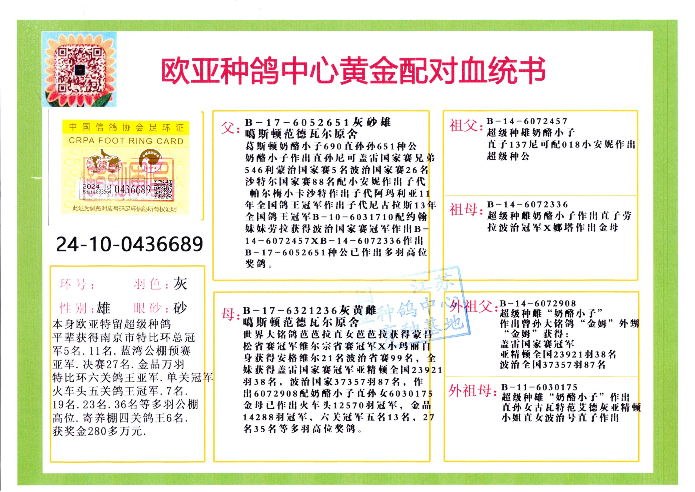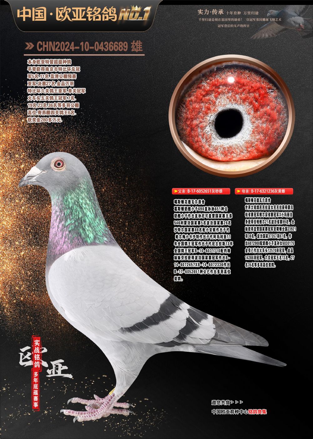 24年秋南京特比环欧亚荣获大团体冠军.小团体冠军551公里大特比13名.14名.16名.19名.20名.21名.24名.26名.27名.28名.42名.52名.54名.57名.65名.66名.68名.70名.71名.72名.74名.76名.80名.82名.83名.84名.85名.86名.90名.92名.110名.116名.121名.122名.128名.131名.158名.161名.164名.165名.166名.172名.174名.177名.182名.195名.196名.201名.205名.208名.210名.216名.253名.269名.275名.276名.294名.296名.299名,,24年秋云南天南铜都公棚决赛415名.天南铜都小棚决赛409名.云南玉活公棚决赛102名.490名.团体32名上笼二羽进二羽,天南铜都大棚506公里决赛445名。热烈祝贺河北省巨鹿县李兰生老师用欧亚泰山号血系连续十一年夺冠军,河北省国家赛冠军.全国季军等多次前十名高位,扬州王军王总用欧亚利奥24年春季获山东翔宇公棚决赛33名盖比53名。南京刘正龙刘总用欧亚盖比获得24年秋山东潍坊国际公棚决赛42名.精英赛30名.三关鸽王71名.决赛86名.加站赛16名.南京市特比环A组鸽王9名.B组鸽王5名.6名.C组鸽王5名.精英赛冠军4名.技能赛A组冠军4名.5名.秦淮区特比环荣获15名.46名.48名.87名。四川西昌徐亮徐总用欧亚利奥获得凉山州聚友决赛177名.第二关亚军双关鸽王19名.三关鸽王105名.云南豪庭公棚决赛603名。热烈祝贺24年四川重庆翔园鸽舍用欧亚泰山号荣获春季400公里冠军.秋季500公里冠军,河北王总用詹森X利奥获得千羽千翔公棚400公里冠军,广东蔡楷焕荣获24年秋爱好者 赛鸽俱乐部三关鸽王季军.一关420公里99名.二关450公里11名.三关520公里32名.单关季军.7名.12名,江西李卫兴荣获贵州红枫公棚8名.共翔俱乐部寄养棚四关综合鸽王30名.一关400公里78名.二关500公里55名.三关520公里37名.四关500公里57名.同父母获公棚18名.雷鸣获得武汉黄浦育翔中心冠军,四川陈文获得四川明鸿俱乐部300公里梦幻2名.3名.4名.9名.10名.13名.14名.15名.31名.34名.40名.41名.42名.43名.69名.71名.72名.73名.74名.94名.95名.97名.98名.99名.419公里决赛荣获总冠军7名.总共归巢9羽,四川徐亮获豪庭决赛603名,山西郑勇获得山西泰鑫公棚决赛255名詹森红狐,热烈祝贺马总获得开尔(飞跃队)决赛9名获奖金1310000万元.第一关52名,天津津福资赛180公里96名.获奖金429543万元,欧亚支持全国鸽友24年秋多人报喜 祝大家取得更好成绩,给欧亚报喜鸽友欧亚决定给每人赠送一羽超级种鸽。欧亚俱乐部特比环多关鸽王成绩:15年秋淮安特比环黑色星期一全会上笼9700多羽,当天无鸽归巢,第二天全会归巢357羽,本舍归巢158羽.前十名八羽.前一百名归巢57羽,16年春季获五关鸽王总冠军,总亚军四名.六名.七名.九名.十名.晶艺俱乐部520公里冠亚季军5名.6名.7名.9名.11名等,火车头冠军.季军6名.8名.9名.10名,16年秋晶艺俱乐部特比环520公里亚军.季军4名.6名.7名.9名,15年春南京白下特比环冠军.亚军.季军6名.7名.8名.9名.10名.指定鸽A B组获得冠军.亚军.季军4名.5名.,17年淮安特比环亚军.4名.5名.7名.8名.10名.六关鸽王总冠军.4名.6名.9名.10名,寄养棚宿迁刘总20羽特比环获冠军.季军.4名.7名.8名.9名等。18年荣获万羽特比环六关鸽王总冠军.总亚军.总季军.6名.8名.十名.单关四羽冠军.二羽亚军.四羽季军.前十名27羽。19年秋万羽特比环六关鸽王总亚军.总季军.5名.8名等,单关二羽冠军.三羽亚军.一羽季军前十名31羽。20年秋淮安市鸽会四关特比环大赛风雨无阻鸽王亚军.鸽王六名,金品俱乐部万羽特比环六关鸽王总冠军,总亚军.四名.五名.六名.七名.八名.十名.前二百名鸽王35羽,单关冠亚季军前十名四十多羽,火车头五关鸽王季军.六名.八名.前二百名鸽王十七羽。20年春荣获淮安五区一市四关鸽王总冠军.亚军.四名.八名.九名。21年秋荣获金品万羽特比环大赛六关鸽王总亚军.总季军.四名.七名.九名.十名.单关冠亚军季军前十名三十多羽。火车头协会鸽王六名.七名.十名.单关前十名十七羽。22年秋荣获鸽王总冠军.总亚军.5名.7名.8名.9名.11名.单关冠亚季军前十名三十多羽,第一关单关前二百名四十多羽,第二关前二百名三十多羽,第三关前二百名四十多羽,第四关前二百名四十多羽,第五关前一百名53羽。23年秋荣获鸽王季军.五名.八名.十名.13名.17名.20名.27名等多羽鸽王.单关前十名二十多羽。公棚.寄养棚部分成绩:16年秋宁夏黄河公棚总冠军电脑戈马力指定通炮冠军,17年送八羽参赛获得鸽王八名进奖四名,支持韩总荣获八名。支持鸽友荣获宁夏中卫公棚决赛总冠军.精英赛冠军,支持18年宁夏黄河公棚决赛冠军詹森X泰山。安徽鼎博寄养棚院内外四关鸽王总冠军.鸽王十七名.三十七名同窝,鸽王39名.42名.58名.67名。18年山东公棚预赛冠军.决赛65名.送八羽进奖五羽.指定获奔驰汽车一辆。支持鸽友获得云南蓝云公棚冠军.盖比X佛卡门。支持鸽友荣获云南银集公棚决赛冠军 詹森427X520血系 速度赛6700羽冠军。17年荣获金马俱乐部寄养棚四关鸽王总冠军.季军.六名.八名.第一关冠军.亚军.季军四名.七名.十一名.金牌教练奖。支持鸽友18年北京费翔公棚预赛九名电脑X桑杰士,支持鸽友荣获陕西威力公棚决赛11名.内蒙古临河寄养棚四关鸽王六名.詹森配泰山,支持河北王总用欧亚詹森427配胡本喜获20年秋开尔青年棚季军。云南东荣公棚16年预赛冠军.决赛77名.17年决赛12名.詹森红狐X泰山,17年平安公棚决赛4名 詹森427。欧亚获得21年金母寄养棚第一关四名.第二关5名.第三关5名.6名.7名.10名.三关鸽王总冠军,四关鸽王14名.十羽鸽王。支持河