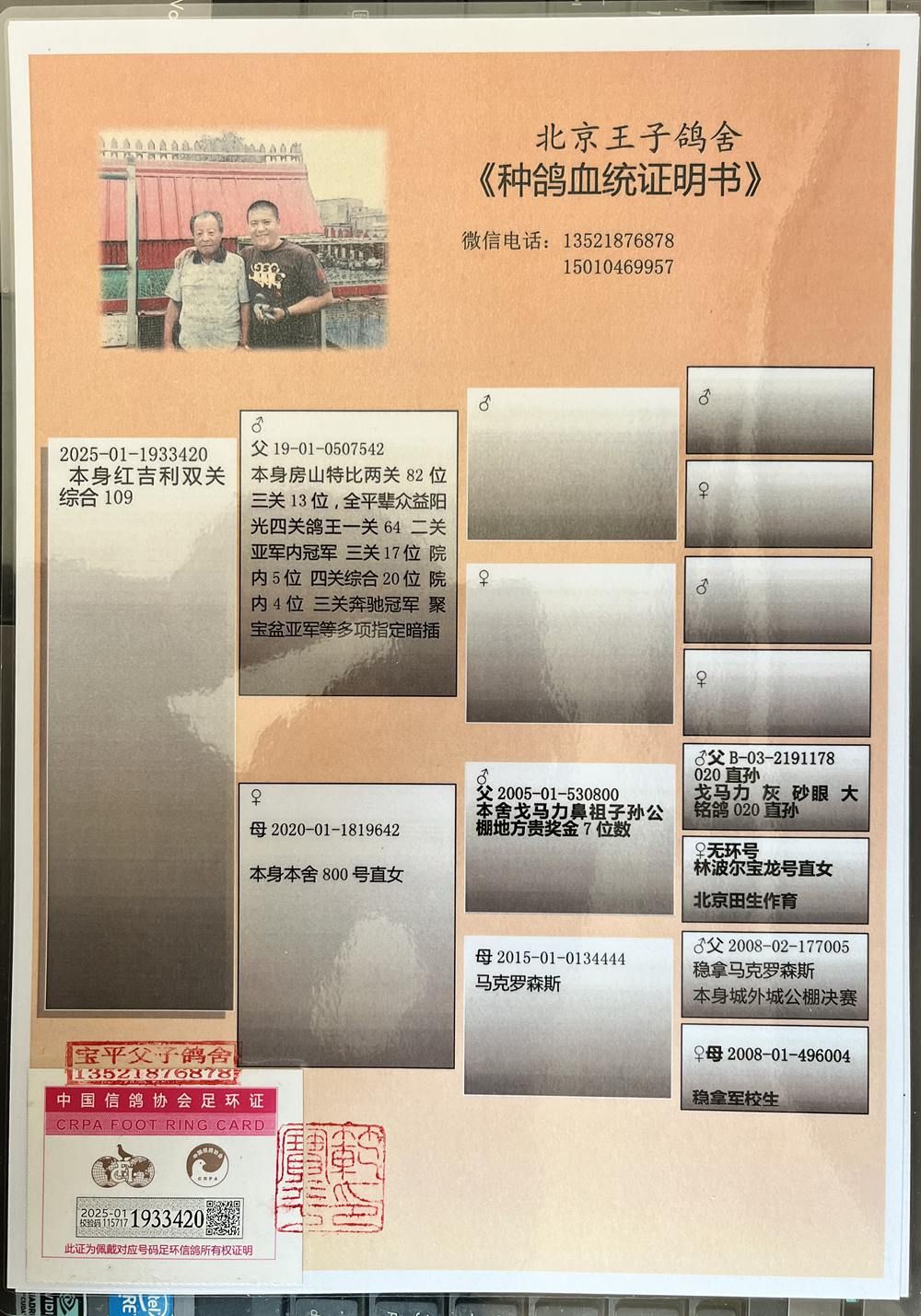 父:19-01-0507542 本身房山特比两关82位,三关13位,全平辈众益阳光四关鸽王一关64,二关亚军,院内冠军,三关17位,院内5位,四关综合20位,院内4位,三关奔驰冠军,聚宝盆亚军等多项指定暗插
