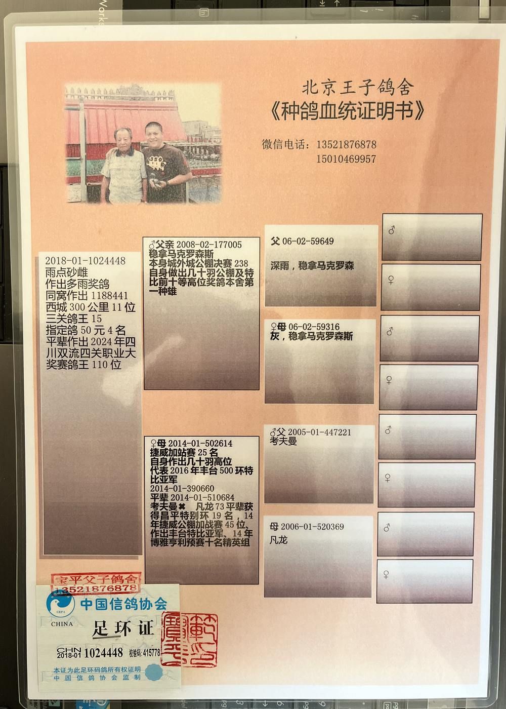 作出多羽奖鸽,同窝作出1188441西城300公里11位,三关鸽王15,
