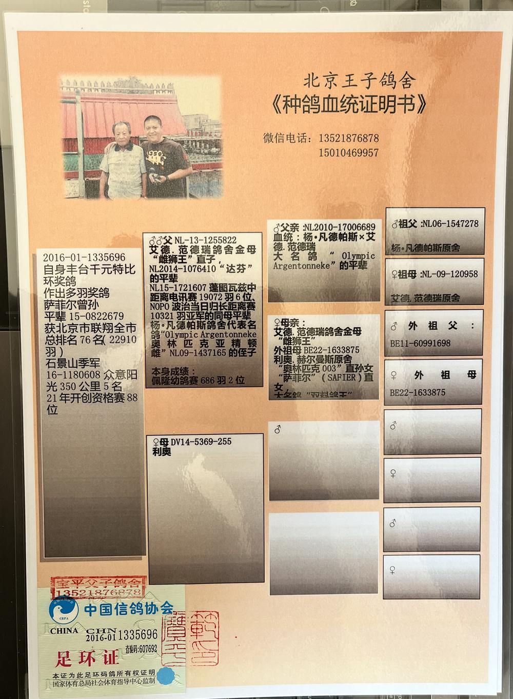 父:NL-13-1255822 艾德.范德瑞鸽舍金母“雌狮子”直子
