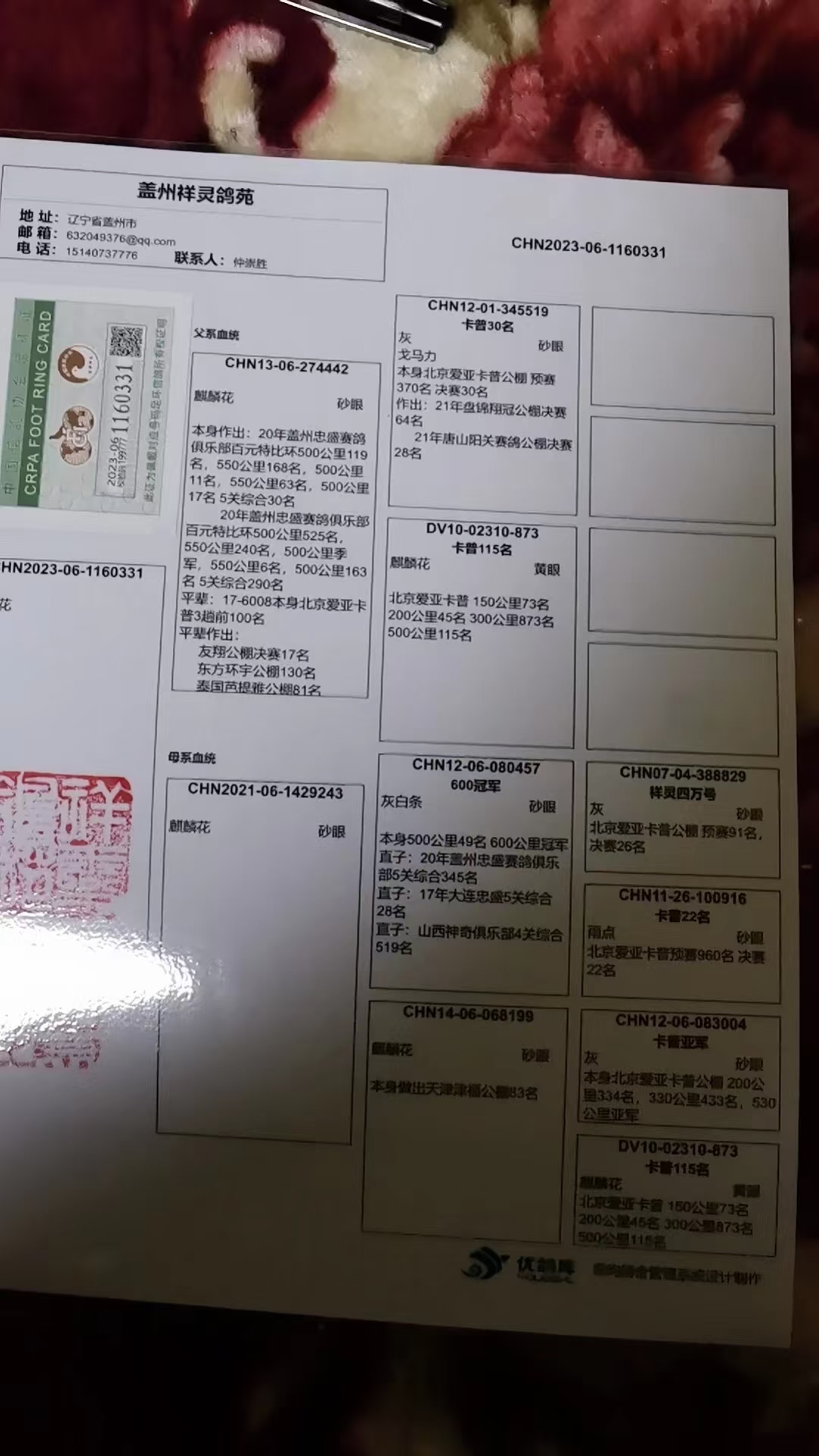 鸽主本人引进辽宁盖州祥灵鸽苑祥灵花作出的成绩:
