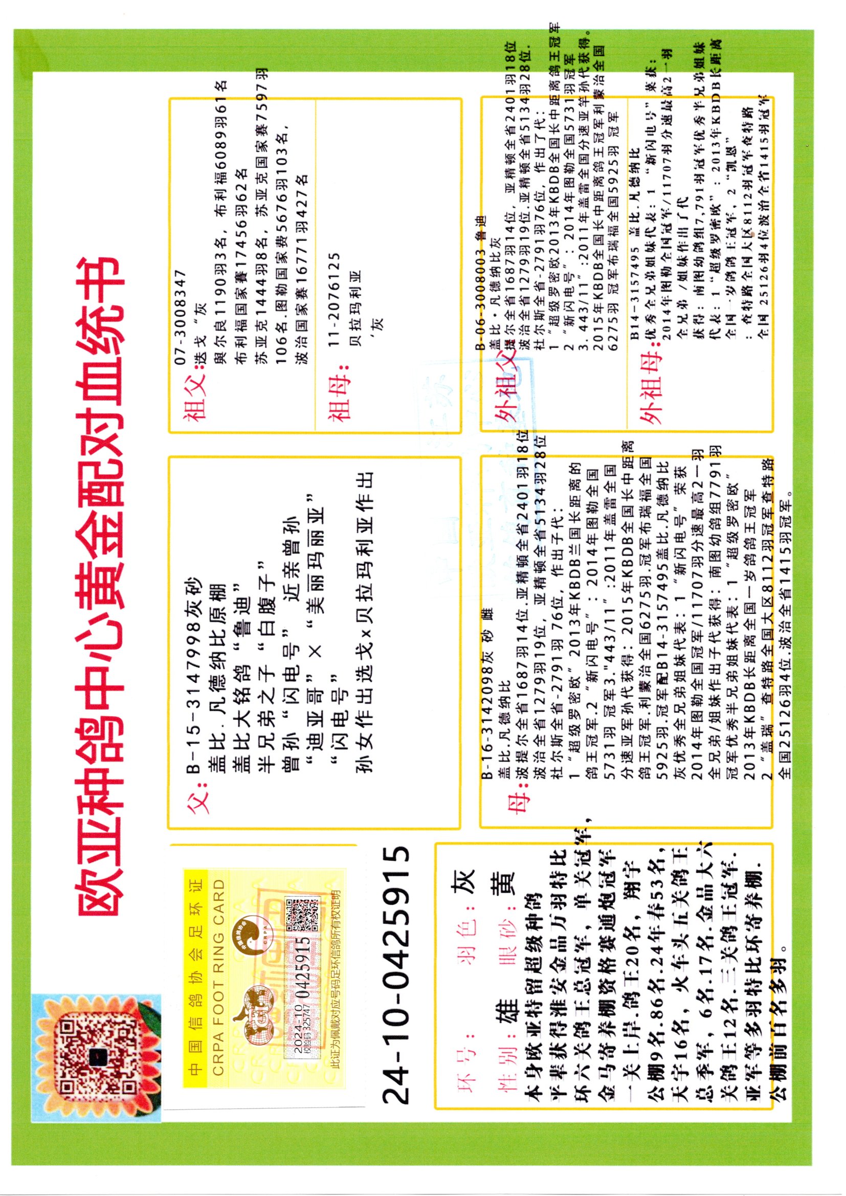 24年秋南京特比环欧亚荣获大团体冠军.小团体冠军551公里大特比13名.14名.16名.19名.20名.21名.24名.26名.27名.28名.42名.52名.54名.57名.65名.66名.68名.70名.71名.72名.74名.76名.80名.82名.83名.84名.85名.86名.90名.92名.110名.116名.121名.122名.128名.131名.158名.161名.164名.165名.166名.172名.174名.177名.182名.195名.196名.201名.205名.208名.210名.216名.253名.269名.275名.276名.294名.296名.299名,,24年秋云南天南铜都公棚决赛415名.天南铜都小棚决赛409名.云南玉活公棚决赛102名.490名.团体32名上笼二羽进二羽,天南铜都大棚506公里决赛445名。热烈祝贺河北省巨鹿县李兰生老师用欧亚泰山号血系连续十一年夺冠军,河北省国家赛冠军.全国季军等多次前十名高位,扬州王军王总用欧亚利奥24年春季获山东翔宇公棚决赛33名盖比53名。南京刘正龙刘总用欧亚盖比获得24年秋山东潍坊国际公棚决赛42名.精英赛30名.三关鸽王71名.决赛86名.加站赛16名.南京市特比环A组鸽王9名.B组鸽王5名.6名.C组鸽王5名.精英赛冠军4名.技能赛A组冠军4名.5名.秦淮区特比环荣获15名.46名.48名.87名。四川西昌徐亮徐总用欧亚利奥获得凉山州聚友决赛177名.第二关亚军双关鸽王19名.三关鸽王105名.云南豪庭公棚决赛603名。热烈祝贺24年四川重庆翔园鸽舍用欧亚泰山号荣获春季400公里冠军.秋季500公里冠军,河北王总用詹森X利奥获得千羽千翔公棚400公里冠军,广东蔡楷焕荣获24年秋爱好者 赛鸽俱乐部三关鸽王季军.一关420公里99名.二关450公里11名.三关520公里32名.单关季军.7名.12名,江西李卫兴荣获贵州红枫公棚8名.共翔俱乐部寄养棚四关综合鸽王30名.一关400公里78名.二关500公里55名.三关520公里37名.四关500公里57名.同父母获公棚18名.雷鸣获得武汉黄浦育翔中心冠军,四川陈文获得四川明鸿俱乐部300公里梦幻2名.3名.4名.9名.10名.13名.14名.15名.31名.34名.40名.41名.42名.43名.69名.71名.72名.73名.74名.94名.95名.97名.98名.99名.419公里决赛荣获总冠军7名.总共归巢9羽,四川徐亮获豪庭决赛603名,山西郑勇获得山西泰鑫公棚决赛255名詹森红狐,热烈祝贺马总获得开尔(飞跃队)决赛9名获奖金1310000万元.第一关52名,天津津福资赛180公里96名.获奖金429543万元,欧亚支持全国鸽友24年秋多人报喜 祝大家取得更好成绩,给欧亚报喜鸽友欧亚决定给每人赠送一羽超级种鸽。欧亚俱乐部特比环多关鸽王成绩:15年秋淮安特比环黑色星期一全会上笼9700多羽,当天无鸽归巢,第二天全会归巢357羽,本舍归巢158羽.前十名八羽.前一百名归巢57羽,16年春季获五关鸽王总冠军,总亚军四名.六名.七名.九名.十名.晶艺俱乐部520公里冠亚季军5名.6名.7名.9名.11名等,火车头冠军.季军6名.8名.9名.10名,16年秋晶艺俱乐部特比环520公里亚军.季军4名.6名.7名.9名,15年春南京白下特比环冠军.亚军.季军6名.7名.8名.9名.10名.指定鸽A B组获得冠军.亚军.季军4名.5名.,17年淮安特比环亚军.4名.5名.7名.8名.10名.六关鸽王总冠军.4名.6名.9名.10名,寄养棚宿迁刘总20羽特比环获冠军.季军.4名.7名.8名.9名等。18年荣获万羽特比环六关鸽王总冠军.总亚军.总季军.6名.8名.十名.单关四羽冠军.二羽亚军.四羽季军.前十名27羽。19年秋万羽特比环六关鸽王总亚军.总季军.5名.8名等,单关二羽冠军.三羽亚军.一羽季军前十名31羽。20年秋淮安市鸽会四关特比环大赛风雨无阻鸽王亚军.鸽王六名,金品俱乐部万羽特比环六关鸽王总冠军,总亚军.四名.五名.六名.七名.八名.十名.前二百名鸽王35羽,单关冠亚季军前十名四十多羽,火车头五关鸽王季军.六名.八名.前二百名鸽王十七羽。20年春荣获淮安五区一市四关鸽王总冠军.亚军.四名.八名.九名。21年秋荣获金品万羽特比环大赛六关鸽王总亚军.总季军.四名.七名.九名.十名.单关冠亚军季军前十名三十多羽。火车头协会鸽王六名.七名.十名.单关前十名十七羽。22年秋荣获鸽王总冠军.总亚军.5名.7名.8名.9名.11名.单关冠亚季军前十名三十多羽,第一关单关前二百名四十多羽,第二关前二百名三十多羽,第三关前二百名四十多羽,第四关前二百名四十多羽,第五关前一百名53羽。23年秋荣获鸽王季军.五名.八名.十名.13名.17名.20名.27名等多羽鸽王.单关前十名二十多羽。公棚.寄养棚部分成绩:16年秋宁夏黄河公棚总冠军电脑戈马力指定通炮冠军,17年送八羽参赛获得鸽王八名进奖四名,支持韩总荣获八名。支持鸽友荣获宁夏中卫公棚决赛总冠军.精英赛冠军,支持18年宁夏黄河公棚决赛冠军詹森X泰山。安徽鼎博寄养棚院内外四关鸽王总冠军.鸽王十七名.三十七名同窝,鸽王39名.42名.58名.67名。18年山东公棚预赛冠军.决赛65名.送八羽进奖五羽.指定获奔驰汽车一辆。支持鸽友获得云南蓝云公棚冠军.盖比X佛卡门。支持鸽友荣获云南银集公棚决赛冠军 詹森427X520血系 速度赛6700羽冠军。17年荣获金马俱乐部寄养棚四关鸽王总冠军.季军.六名.八名.第一关冠军.亚军.季军四名.七名.十一名.金牌教练奖。支持鸽友18年北京费翔公棚预赛九名电脑X桑杰士,支持鸽友荣获陕西威力公棚决赛11名.内蒙古临河寄养棚四关鸽王六名.詹森配泰山,支持河北王总用欧亚詹森427配胡本喜获20年秋开尔青年棚季军。云南东荣公棚16年预赛冠军.决赛77名.17年决赛12名.詹森红狐X泰山,17年平安公棚决赛4名 詹森427。欧亚获得21年金母寄养棚第一关四名.第二关5名.第三关5名.6名.7名.10名.三关鸽王总冠军,四关鸽王14名.十羽鸽王。支持河