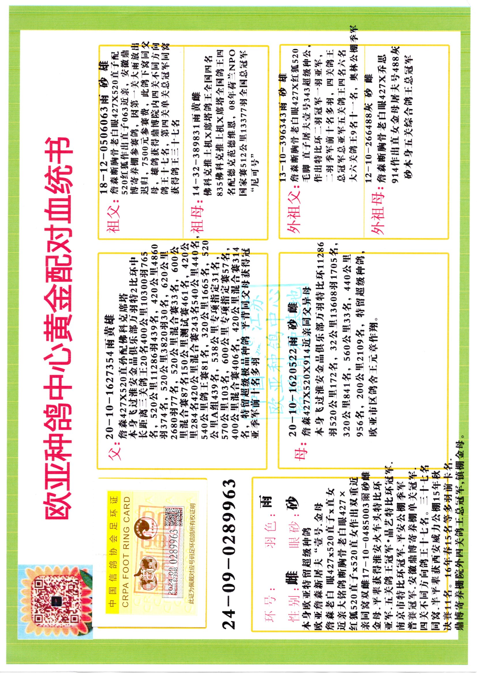 24年秋南京特比环欧亚荣获大团体冠军.小团体冠军551公里大特比13名.14名.16名.19名.20名.21名.24名.26名.27名.28名.42名.52名.54名.57名.65名.66名.68名.70名.71名.72名.74名.76名.80名.82名.83名.84名.85名.86名.90名.92名.110名.116名.121名.122名.128名.131名.158名.161名.164名.165名.166名.172名.174名.177名.182名.195名.196名.201名.205名.208名.210名.216名.253名.269名.275名.276名.294名.296名.299名,,24年秋云南天南铜都公棚决赛415名.天南铜都小棚决赛409名.云南玉活公棚决赛102名.490名.团体32名上笼二羽进二羽,天南铜都大棚506公里决赛445名。热烈祝贺河北省巨鹿县李兰生老师用欧亚泰山号血系连续十一年夺冠军,河北省国家赛冠军.全国季军等多次前十名高位,扬州王军王总用欧亚利奥24年春季获山东翔宇公棚决赛33名盖比53名。南京刘正龙刘总用欧亚盖比获得24年秋山东潍坊国际公棚决赛42名.精英赛30名.三关鸽王71名.决赛86名.加站赛16名.南京市特比环A组鸽王9名.B组鸽王5名.6名.C组鸽王5名.精英赛冠军4名.技能赛A组冠军4名.5名.秦淮区特比环荣获15名.46名.48名.87名。四川西昌徐亮徐总用欧亚利奥获得凉山州聚友决赛177名.第二关亚军双关鸽王19名.三关鸽王105名.云南豪庭公棚决赛603名。热烈祝贺24年四川重庆翔园鸽舍用欧亚泰山号荣获春季400公里冠军.秋季500公里冠军,河北王总用詹森X利奥获得千羽千翔公棚400公里冠军,广东蔡楷焕荣获24年秋爱好者 赛鸽俱乐部三关鸽王季军.一关420公里99名.二关450公里11名.三关520公里32名.单关季军.7名.12名,江西李卫兴荣获贵州红枫公棚8名.共翔俱乐部寄养棚四关综合鸽王30名.一关400公里78名.二关500公里55名.三关520公里37名.四关500公里57名.同父母获公棚18名.雷鸣获得武汉黄浦育翔中心冠军,四川陈文获得四川明鸿俱乐部300公里梦幻2名.3名.4名.9名.10名.13名.14名.15名.31名.34名.40名.41名.42名.43名.69名.71名.72名.73名.74名.94名.95名.97名.98名.99名.419公里决赛荣获总冠军7名.总共归巢9羽,四川徐亮获豪庭决赛603名,山西郑勇获得山西泰鑫公棚决赛255名詹森红狐,热烈祝贺马总获得开尔(飞跃队)决赛9名获奖金1310000万元.第一关52名,天津津福资赛180公里96名.获奖金429543万元,欧亚支持全国鸽友24年秋多人报喜 祝大家取得更好成绩,给欧亚报喜鸽友欧亚决定给每人赠送一羽超级种鸽。欧亚俱乐部特比环多关鸽王成绩:15年秋淮安特比环黑色星期一全会上笼9700多羽,当天无鸽归巢,第二天全会归巢357羽,本舍归巢158羽.前十名八羽.前一百名归巢57羽,16年春季获五关鸽王总冠军,总亚军四名.六名.七名.九名.十名.晶艺俱乐部520公里冠亚季军5名.6名.7名.9名.11名等,火车头冠军.季军6名.8名.9名.10名,16年秋晶艺俱乐部特比环520公里亚军.季军4名.6名.7名.9名,15年春南京白下特比环冠军.亚军.季军6名.7名.8名.9名.10名.指定鸽A B组获得冠军.亚军.季军4名.5名.,17年淮安特比环亚军.4名.5名.7名.8名.10名.六关鸽王总冠军.4名.6名.9名.10名,寄养棚宿迁刘总20羽特比环获冠军.季军.4名.7名.8名.9名等。18年荣获万羽特比环六关鸽王总冠军.总亚军.总季军.6名.8名.十名.单关四羽冠军.二羽亚军.四羽季军.前十名27羽。19年秋万羽特比环六关鸽王总亚军.总季军.5名.8名等,单关二羽冠军.三羽亚军.一羽季军前十名31羽。20年秋淮安市鸽会四关特比环大赛风雨无阻鸽王亚军.鸽王六名,金品俱乐部万羽特比环六关鸽王总冠军,总亚军.四名.五名.六名.七名.八名.十名.前二百名鸽王35羽,单关冠亚季军前十名四十多羽,火车头五关鸽王季军.六名.八名.前二百名鸽王十七羽。20年春荣获淮安五区一市四关鸽王总冠军.亚军.四名.八名.九名。21年秋荣获金品万羽特比环大赛六关鸽王总亚军.总季军.四名.七名.九名.十名.单关冠亚军季军前十名三十多羽。火车头协会鸽王六名.七名.十名.单关前十名十七羽。22年秋荣获鸽王总冠军.总亚军.5名.7名.8名.9名.11名.单关冠亚季军前十名三十多羽,第一关单关前二百名四十多羽,第二关前二百名三十多羽,第三关前二百名四十多羽,第四关前二百名四十多羽,第五关前一百名53羽。23年秋荣获鸽王季军.五名.八名.十名.13名.17名.20名.27名等多羽鸽王.单关前十名二十多羽。公棚.寄养棚部分成绩:16年秋宁夏黄河公棚总冠军电脑戈马力指定通炮冠军,17年送八羽参赛获得鸽王八名进奖四名,支持韩总荣获八名。支持鸽友荣获宁夏中卫公棚决赛总冠军.精英赛冠军,支持18年宁夏黄河公棚决赛冠军詹森X泰山。安徽鼎博寄养棚院内外四关鸽王总冠军.鸽王十七名.三十七名同窝,鸽王39名.42名.58名.67名。18年山东公棚预赛冠军.决赛65名.送八羽进奖五羽.指定获奔驰汽车一辆。支持鸽友获得云南蓝云公棚冠军.盖比X佛卡门。支持鸽友荣获云南银集公棚决赛冠军 詹森427X520血系 速度赛6700羽冠军。17年荣获金马俱乐部寄养棚四关鸽王总冠军.季军.六名.八名.第一关冠军.亚军.季军四名.七名.十一名.金牌教练奖。支持鸽友18年北京费翔公棚预赛九名电脑X桑杰士,支持鸽友荣获陕西威力公棚决赛11名.内蒙古临河寄养棚四关鸽王六名.詹森配泰山,支持河北王总用欧亚詹森427配胡本喜获20年秋开尔青年棚季军。云南东荣公棚16年预赛冠军.决赛77名.17年决赛12名.詹森红狐X泰山,17年平安公棚决赛4名 詹森427。欧亚获得21年金母寄养棚第一关四名.第二关5名.第三关5名.6名.7名.10名.三关鸽王总冠军,四关鸽王14名.十羽鸽王。支持河