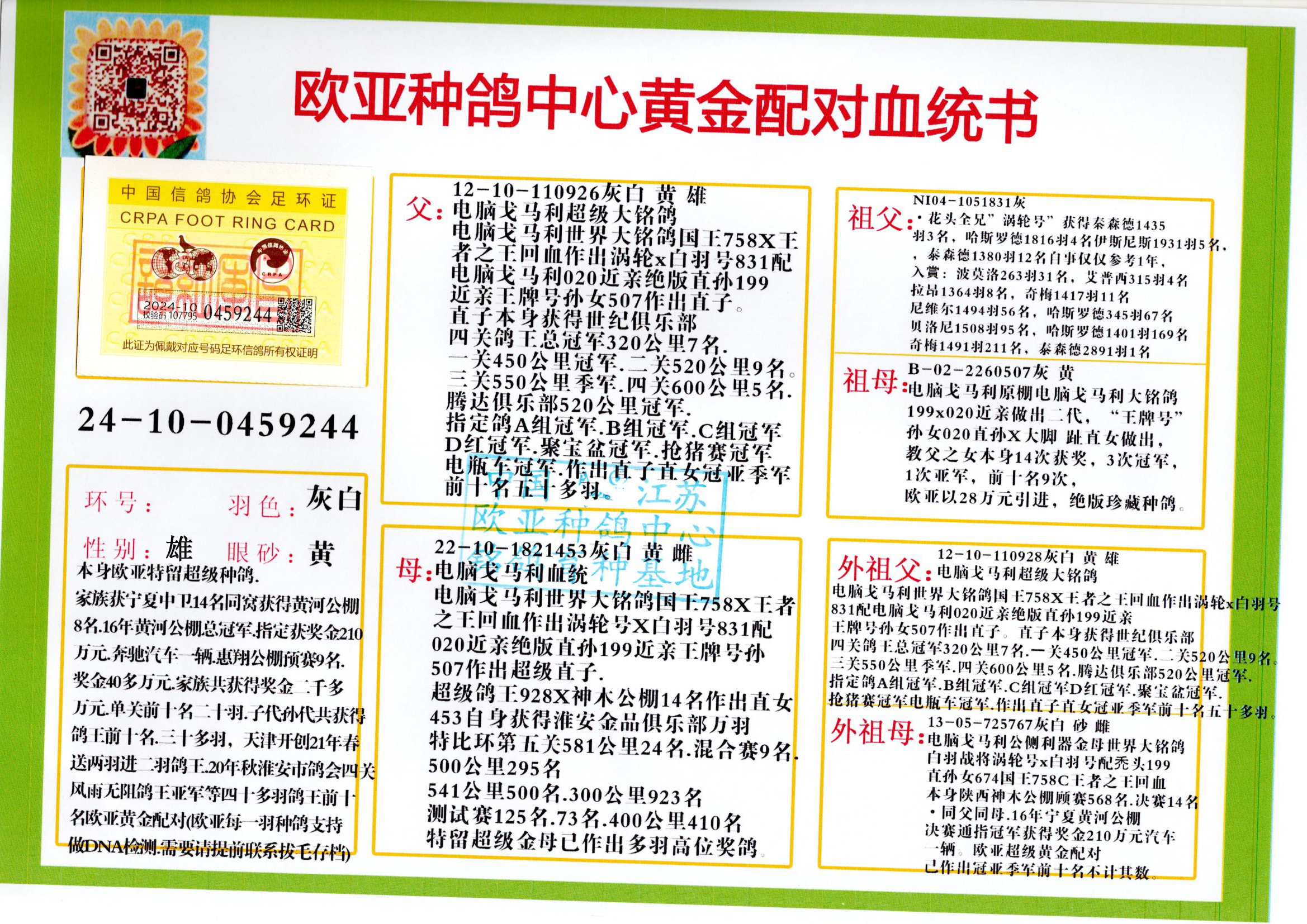 24年秋南京特比环欧亚荣获大团体冠军.小团体冠军551公里大特比13名.14名.16名.19名.20名.21名.24名.26名.27名.28名.42名.52名.54名.57名.65名.66名.68名.70名.71名.72名.74名.76名.80名.82名.83名.84名.85名.86名.90名.92名.110名.116名.121名.122名.128名.131名.158名.161名.164名.165名.166名.172名.174名.177名.182名.195名.196名.201名.205名.208名.210名.216名.253名.269名.275名.276名.294名.296名.299名,,24年秋云南天南铜都公棚决赛415名.天南铜都小棚决赛409名.云南玉活公棚决赛102名.490名.团体32名上笼二羽进二羽,天南铜都大棚506公里决赛445名。热烈祝贺河北省巨鹿县李兰生老师用欧亚泰山号血系连续十一年夺冠军,河北省国家赛冠军.全国季军等多次前十名高位,扬州王军王总用欧亚利奥24年春季获山东翔宇公棚决赛33名盖比53名。南京刘正龙刘总用欧亚盖比获得24年秋山东潍坊国际公棚决赛42名.精英赛30名.三关鸽王71名.决赛86名.加站赛16名.南京市特比环A组鸽王9名.B组鸽王5名.6名.C组鸽王5名.精英赛冠军4名.技能赛A组冠军4名.5名.秦淮区特比环荣获15名.46名.48名.87名。四川西昌徐亮徐总用欧亚利奥获得凉山州聚友决赛177名.第二关亚军双关鸽王19名.三关鸽王105名.云南豪庭公棚决赛603名。热烈祝贺24年四川重庆翔园鸽舍用欧亚泰山号荣获春季400公里冠军.秋季500公里冠军,河北王总用詹森X利奥获得千羽千翔公棚400公里冠军,广东蔡楷焕荣获24年秋爱好者 赛鸽俱乐部三关鸽王季军.一关420公里99名.二关450公里11名.三关520公里32名.单关季军.7名.12名,江西李卫兴荣获贵州红枫公棚8名.共翔俱乐部寄养棚四关综合鸽王30名.一关400公里78名.二关500公里55名.三关520公里37名.四关500公里57名.同父母获公棚18名.雷鸣获得武汉黄浦育翔中心冠军,四川陈文获得四川明鸿俱乐部300公里梦幻2名.3名.4名.9名.10名.13名.14名.15名.31名.34名.40名.41名.42名.43名.69名.71名.72名.73名.74名.94名.95名.97名.98名.99名.419公里决赛荣获总冠军7名.总共归巢9羽,四川徐亮获豪庭决赛603名,山西郑勇获得山西泰鑫公棚决赛255名詹森红狐,热烈祝贺马总获得开尔(飞跃队)决赛9名获奖金1310000万元.第一关52名,天津津福资赛180公里96名.获奖金429543万元,欧亚支持全国鸽友24年秋多人报喜 祝大家取得更好成绩,给欧亚报喜鸽友欧亚决定给每人赠送一羽超级种鸽。欧亚俱乐部特比环多关鸽王成绩:15年秋淮安特比环黑色星期一全会上笼9700多羽,当天无鸽归巢,第二天全会归巢357羽,本舍归巢158羽.前十名八羽.前一百名归巢57羽,16年春季获五关鸽王总冠军,总亚军四名.六名.七名.九名.十名.晶艺俱乐部520公里冠亚季军5名.6名.7名.9名.11名等,火车头冠军.季军6名.8名.9名.10名,16年秋晶艺俱乐部特比环520公里亚军.季军4名.6名.7名.9名,15年春南京白下特比环冠军.亚军.季军6名.7名.8名.9名.10名.指定鸽A B组获得冠军.亚军.季军4名.5名.,17年淮安特比环亚军.4名.5名.7名.8名.10名.六关鸽王总冠军.4名.6名.9名.10名,寄养棚宿迁刘总20羽特比环获冠军.季军.4名.7名.8名.9名等。18年荣获万羽特比环六关鸽王总冠军.总亚军.总季军.6名.8名.十名.单关四羽冠军.二羽亚军.四羽季军.前十名27羽。19年秋万羽特比环六关鸽王总亚军.总季军.5名.8名等,单关二羽冠军.三羽亚军.一羽季军前十名31羽。20年秋淮安市鸽会四关特比环大赛风雨无阻鸽王亚军.鸽王六名,金品俱乐部万羽特比环六关鸽王总冠军,总亚军.四名.五名.六名.七名.八名.十名.前二百名鸽王35羽,单关冠亚季军前十名四十多羽,火车头五关鸽王季军.六名.八名.前二百名鸽王十七羽。20年春荣获淮安五区一市四关鸽王总冠军.亚军.四名.八名.九名。21年秋荣获金品万羽特比环大赛六关鸽王总亚军.总季军.四名.七名.九名.十名.单关冠亚军季军前十名三十多羽。火车头协会鸽王六名.七名.十名.单关前十名十七羽。22年秋荣获鸽王总冠军.总亚军.5名.7名.8名.9名.11名.单关冠亚季军前十名三十多羽,第一关单关前二百名四十多羽,第二关前二百名三十多羽,第三关前二百名四十多羽,第四关前二百名四十多羽,第五关前一百名53羽。23年秋荣获鸽王季军.五名.八名.十名.13名.17名.20名.27名等多羽鸽王.单关前十名二十多羽。公棚.寄养棚部分成绩:16年秋宁夏黄河公棚总冠军电脑戈马力指定通炮冠军,17年送八羽参赛获得鸽王八名进奖四名,支持韩总荣获八名。支持鸽友荣获宁夏中卫公棚决赛总冠军.精英赛冠军,支持18年宁夏黄河公棚决赛冠军詹森X泰山。安徽鼎博寄养棚院内外四关鸽王总冠军.鸽王十七名.三十七名同窝,鸽王39名.42名.58名.67名。18年山东公棚预赛冠军.决赛65名.送八羽进奖五羽.指定获奔驰汽车一辆。支持鸽友获得云南蓝云公棚冠军.盖比X佛卡门。支持鸽友荣获云南银集公棚决赛冠军 詹森427X520血系 速度赛6700羽冠军。17年荣获金马俱乐部寄养棚四关鸽王总冠军.季军.六名.八名.第一关冠军.亚军.季军四名.七名.十一名.金牌教练奖。支持鸽友18年北京费翔公棚预赛九名电脑X桑杰士,支持鸽友荣获陕西威力公棚决赛11名.内蒙古临河寄养棚四关鸽王六名.詹森配泰山,支持河北王总用欧亚詹森427配胡本喜获20年秋开尔青年棚季军。云南东荣公棚16年预赛冠军.决赛77名.17年决赛12名.詹森红狐X泰山,17年平安公棚决赛4名 詹森427。欧亚获得21年金母寄养棚第一关四名.第二关5名.第三关5名.6名.7名.10名.三关鸽王总冠军,四关鸽王14名.十羽鸽王。支持河