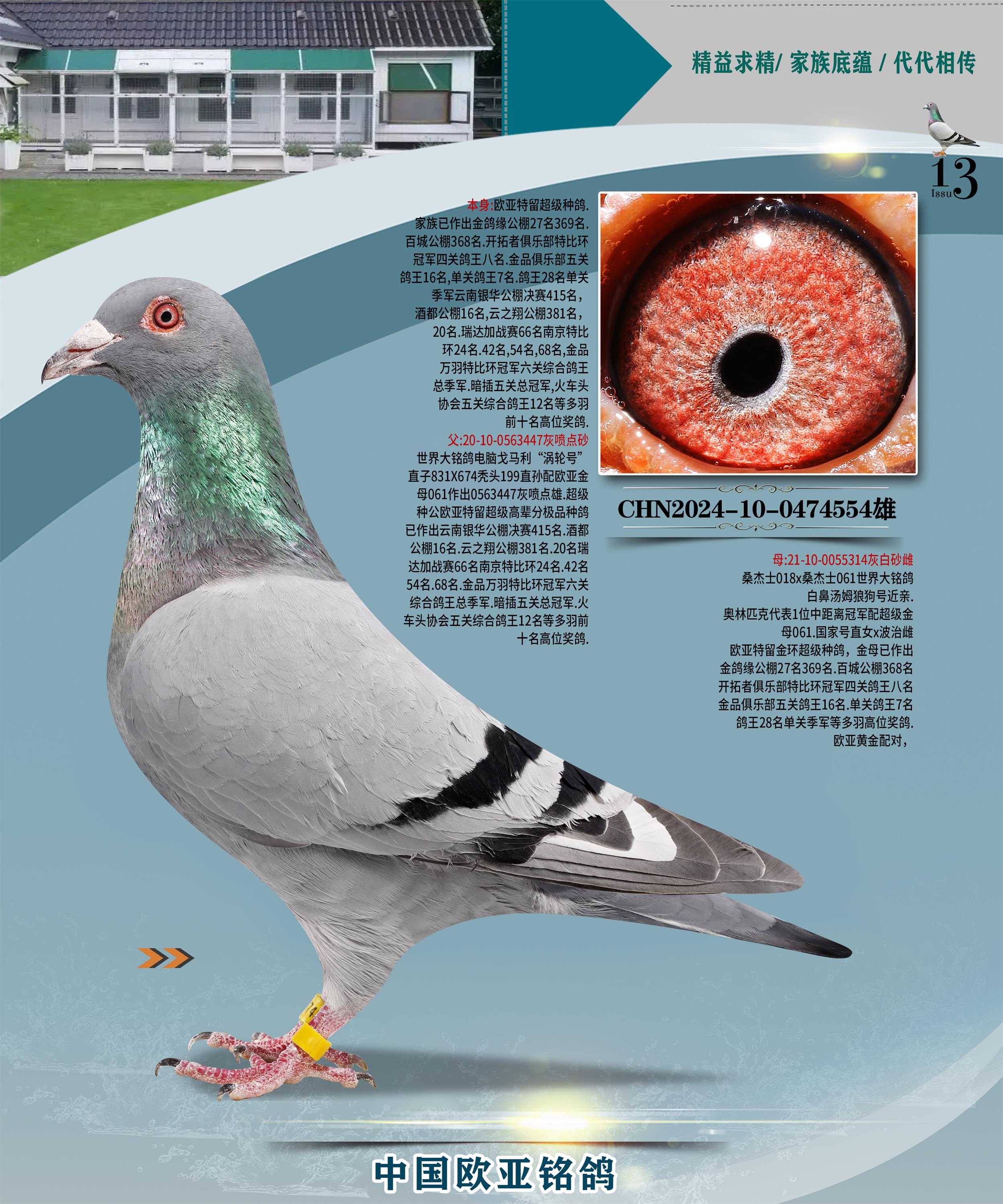 24年秋南京特比环欧亚荣获大团体冠军.小团体冠军551公里大特比13名.14名.16名.19名.20名.21名.24名.26名.27名.28名.42名.52名.54名.57名.65名.66名.68名.70名.71名.72名.74名.76名.80名.82名.83名.84名.85名.86名.90名.92名.110名.116名.121名.122名.128名.131名.158名.161名.164名.165名.166名.172名.174名.177名.182名.195名.196名.201名.205名.208名.210名.216名.253名.269名.275名.276名.294名.296名.299名,,24年秋云南天南铜都公棚决赛415名.天南铜都小棚决赛409名.云南玉活公棚决赛102名.490名.团体32名上笼二羽进二羽,天南铜都大棚506公里决赛445名。热烈祝贺河北省巨鹿县李兰生老师用欧亚泰山号血系连续十一年夺冠军,河北省国家赛冠军.全国季军等多次前十名高位,扬州王军王总用欧亚利奥24年春季获山东翔宇公棚决赛33名盖比53名。南京刘正龙刘总用欧亚盖比获得24年秋山东潍坊国际公棚决赛42名.精英赛30名.三关鸽王71名.决赛86名.加站赛16名.南京市特比环A组鸽王9名.B组鸽王5名.6名.C组鸽王5名.精英赛冠军4名.技能赛A组冠军4名.5名.秦淮区特比环荣获15名.46名.48名.87名。四川西昌徐亮徐总用欧亚利奥获得凉山州聚友决赛177名.第二关亚军双关鸽王19名.三关鸽王105名.云南豪庭公棚决赛603名。热烈祝贺24年四川重庆翔园鸽舍用欧亚泰山号荣获春季400公里冠军.秋季500公里冠军,河北王总用詹森X利奥获得千羽千翔公棚400公里冠军,广东蔡楷焕荣获24年秋爱好者 赛鸽俱乐部三关鸽王季军.一关420公里99名.二关450公里11名.三关520公里32名.单关季军.7名.12名,江西李卫兴荣获贵州红枫公棚8名.共翔俱乐部寄养棚四关综合鸽王30名.一关400公里78名.二关500公里55名.三关520公里37名.四关500公里57名.同父母获公棚18名.雷鸣获得武汉黄浦育翔中心冠军,四川陈文获得四川明鸿俱乐部300公里梦幻2名.3名.4名.9名.10名.13名.14名.15名.31名.34名.40名.41名.42名.43名.69名.71名.72名.73名.74名.94名.95名.97名.98名.99名.419公里决赛荣获总冠军7名.总共归巢9羽,四川徐亮获豪庭决赛603名,山西郑勇获得山西泰鑫公棚决赛255名詹森红狐,热烈祝贺马总获得开尔(飞跃队)决赛9名获奖金1310000万元.第一关52名,天津津福资赛180公里96名.获奖金429543万元,欧亚支持全国鸽友24年秋多人报喜 祝大家取得更好成绩,给欧亚报喜鸽友欧亚决定给每人赠送一羽超级种鸽。欧亚俱乐部特比环多关鸽王成绩:15年秋淮安特比环黑色星期一全会上笼9700多羽,当天无鸽归巢,第二天全会归巢357羽,本舍归巢158羽.前十名八羽.前一百名归巢57羽,16年春季获五关鸽王总冠军,总亚军四名.六名.七名.九名.十名.晶艺俱乐部520公里冠亚季军5名.6名.7名.9名.11名等,火车头冠军.季军6名.8名.9名.10名,16年秋晶艺俱乐部特比环520公里亚军.季军4名.6名.7名.9名,15年春南京白下特比环冠军.亚军.季军6名.7名.8名.9名.10名.指定鸽A B组获得冠军.亚军.季军4名.5名.,17年淮安特比环亚军.4名.5名.7名.8名.10名.六关鸽王总冠军.4名.6名.9名.10名,寄养棚宿迁刘总20羽特比环获冠军.季军.4名.7名.8名.9名等。18年荣获万羽特比环六关鸽王总冠军.总亚军.总季军.6名.8名.十名.单关四羽冠军.二羽亚军.四羽季军.前十名27羽。19年秋万羽特比环六关鸽王总亚军.总季军.5名.8名等,单关二羽冠军.三羽亚军.一羽季军前十名31羽。20年秋淮安市鸽会四关特比环大赛风雨无阻鸽王亚军.鸽王六名,金品俱乐部万羽特比环六关鸽王总冠军,总亚军.四名.五名.六名.七名.八名.十名.前二百名鸽王35羽,单关冠亚季军前十名四十多羽,火车头五关鸽王季军.六名.八名.前二百名鸽王十七羽。20年春荣获淮安五区一市四关鸽王总冠军.亚军.四名.八名.九名。21年秋荣获金品万羽特比环大赛六关鸽王总亚军.总季军.四名.七名.九名.十名.单关冠亚军季军前十名三十多羽。火车头协会鸽王六名.七名.十名.单关前十名十七羽。22年秋荣获鸽王总冠军.总亚军.5名.7名.8名.9名.11名.单关冠亚季军前十名三十多羽,第一关单关前二百名四十多羽,第二关前二百名三十多羽,第三关前二百名四十多羽,第四关前二百名四十多羽,第五关前一百名53羽。23年秋荣获鸽王季军.五名.八名.十名.13名.17名.20名.27名等多羽鸽王.单关前十名二十多羽。公棚.寄养棚部分成绩:16年秋宁夏黄河公棚总冠军电脑戈马力指定通炮冠军,17年送八羽参赛获得鸽王八名进奖四名,支持韩总荣获八名。支持鸽友荣获宁夏中卫公棚决赛总冠军.精英赛冠军,支持18年宁夏黄河公棚决赛冠军詹森X泰山。安徽鼎博寄养棚院内外四关鸽王总冠军.鸽王十七名.三十七名同窝,鸽王39名.42名.58名.67名。18年山东公棚预赛冠军.决赛65名.送八羽进奖五羽.指定获奔驰汽车一辆。支持鸽友获得云南蓝云公棚冠军.盖比X佛卡门。支持鸽友荣获云南银集公棚决赛冠军 詹森427X520血系 速度赛6700羽冠军。17年荣获金马俱乐部寄养棚四关鸽王总冠军.季军.六名.八名.第一关冠军.亚军.季军四名.七名.十一名.金牌教练奖。支持鸽友18年北京费翔公棚预赛九名电脑X桑杰士,支持鸽友荣获陕西威力公棚决赛11名.内蒙古临河寄养棚四关鸽王六名.詹森配泰山,支持河北王总用欧亚詹森427配胡本喜获20年秋开尔青年棚季军。云南东荣公棚16年预赛冠军.决赛77名.17年决赛12名.詹森红狐X泰山,17年平安公棚决赛4名 詹森427。欧亚获得21年金母寄养棚第一关四名.第二关5名.第三关5名.6名.7名.10名.三关鸽王总冠军,四关鸽王14名.十羽鸽王。支持河