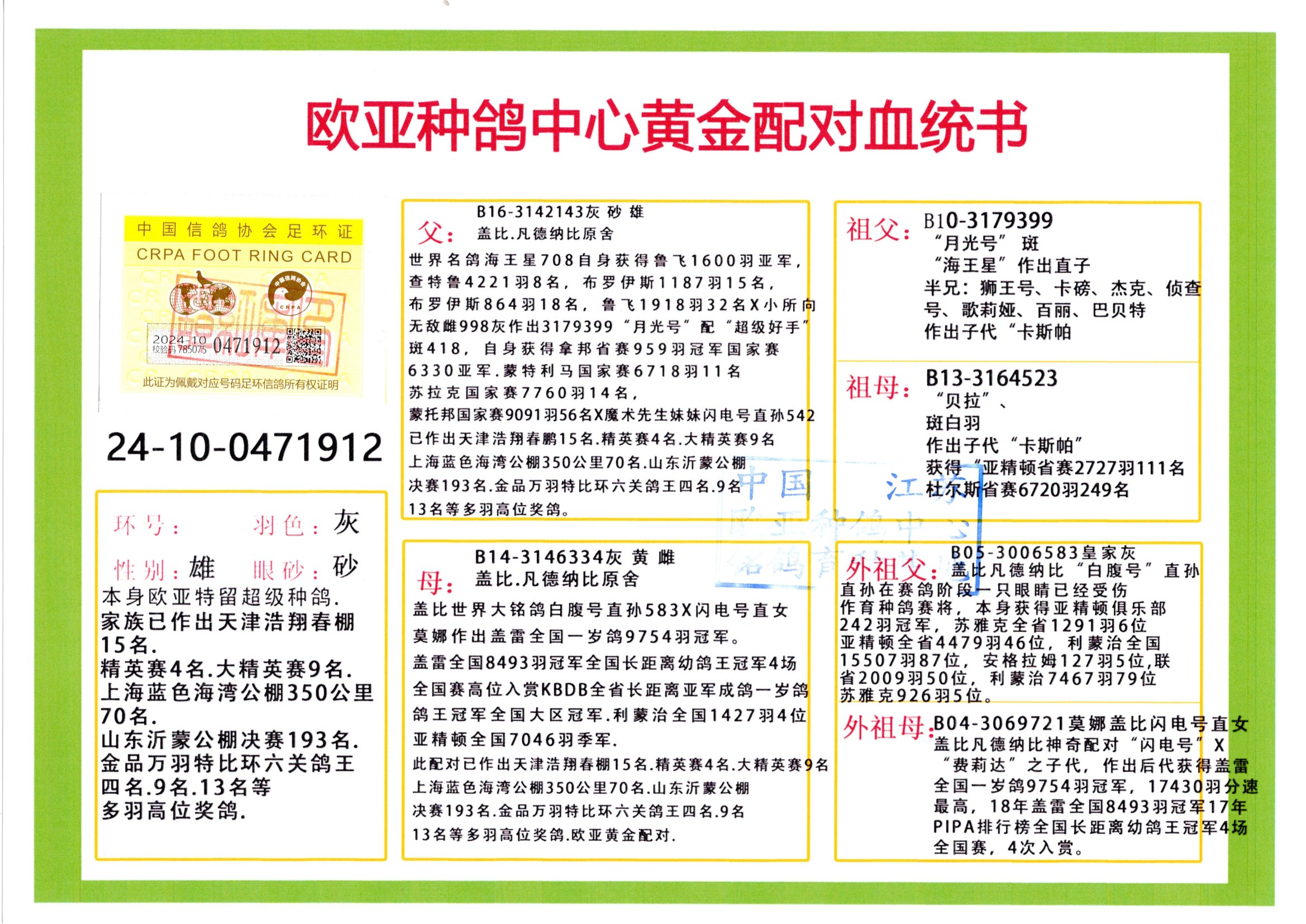 24年秋南京特比环欧亚荣获大团体冠军.小团体冠军551公里大特比13名.14名.16名.19名.20名.21名.24名.26名.27名.28名.42名.52名.54名.57名.65名.66名.68名.70名.71名.72名.74名.76名.80名.82名.83名.84名.85名.86名.90名.92名.110名.116名.121名.122名.128名.131名.158名.161名.164名.165名.166名.172名.174名.177名.182名.195名.196名.201名.205名.208名.210名.216名.253名.269名.275名.276名.294名.296名.299名,,24年秋云南天南铜都公棚决赛415名.天南铜都小棚决赛409名.云南玉活公棚决赛102名.490名.团体32名上笼二羽进二羽,天南铜都大棚506公里决赛445名。热烈祝贺河北省巨鹿县李兰生老师用欧亚泰山号血系连续十一年夺冠军,河北省国家赛冠军.全国季军等多次前十名高位,扬州王军王总用欧亚利奥24年春季获山东翔宇公棚决赛33名盖比53名。南京刘正龙刘总用欧亚盖比获得24年秋山东潍坊国际公棚决赛42名.精英赛30名.三关鸽王71名.决赛86名.加站赛16名.南京市特比环A组鸽王9名.B组鸽王5名.6名.C组鸽王5名.精英赛冠军4名.技能赛A组冠军4名.5名.秦淮区特比环荣获15名.46名.48名.87名。四川西昌徐亮徐总用欧亚利奥获得凉山州聚友决赛177名.第二关亚军双关鸽王19名.三关鸽王105名.云南豪庭公棚决赛603名。热烈祝贺24年四川重庆翔园鸽舍用欧亚泰山号荣获春季400公里冠军.秋季500公里冠军,河北王总用詹森X利奥获得千羽千翔公棚400公里冠军,广东蔡楷焕荣获24年秋爱好者 赛鸽俱乐部三关鸽王季军.一关420公里99名.二关450公里11名.三关520公里32名.单关季军.7名.12名,江西李卫兴荣获贵州红枫公棚8名.共翔俱乐部寄养棚四关综合鸽王30名.一关400公里78名.二关500公里55名.三关520公里37名.四关500公里57名.同父母获公棚18名.雷鸣获得武汉黄浦育翔中心冠军,四川陈文获得四川明鸿俱乐部300公里梦幻2名.3名.4名.9名.10名.13名.14名.15名.31名.34名.40名.41名.42名.43名.69名.71名.72名.73名.74名.94名.95名.97名.98名.99名.419公里决赛荣获总冠军7名.总共归巢9羽,四川徐亮获豪庭决赛603名,山西郑勇获得山西泰鑫公棚决赛255名詹森红狐,热烈祝贺马总获得开尔(飞跃队)决赛9名获奖金1310000万元.第一关52名,天津津福资赛180公里96名.获奖金429543万元,欧亚支持全国鸽友24年秋多人报喜 祝大家取得更好成绩,给欧亚报喜鸽友欧亚决定给每人赠送一羽超级种鸽。欧亚俱乐部特比环多关鸽王成绩:15年秋淮安特比环黑色星期一全会上笼9700多羽,当天无鸽归巢,第二天全会归巢357羽,本舍归巢158羽.前十名八羽.前一百名归巢57羽,16年春季获五关鸽王总冠军,总亚军四名.六名.七名.九名.十名.晶艺俱乐部520公里冠亚季军5名.6名.7名.9名.11名等,火车头冠军.季军6名.8名.9名.10名,16年秋晶艺俱乐部特比环520公里亚军.季军4名.6名.7名.9名,15年春南京白下特比环冠军.亚军.季军6名.7名.8名.9名.10名.指定鸽A B组获得冠军.亚军.季军4名.5名.,17年淮安特比环亚军.4名.5名.7名.8名.10名.六关鸽王总冠军.4名.6名.9名.10名,寄养棚宿迁刘总20羽特比环获冠军.季军.4名.7名.8名.9名等。18年荣获万羽特比环六关鸽王总冠军.总亚军.总季军.6名.8名.十名.单关四羽冠军.二羽亚军.四羽季军.前十名27羽。19年秋万羽特比环六关鸽王总亚军.总季军.5名.8名等,单关二羽冠军.三羽亚军.一羽季军前十名31羽。20年秋淮安市鸽会四关特比环大赛风雨无阻鸽王亚军.鸽王六名,金品俱乐部万羽特比环六关鸽王总冠军,总亚军.四名.五名.六名.七名.八名.十名.前二百名鸽王35羽,单关冠亚季军前十名四十多羽,火车头五关鸽王季军.六名.八名.前二百名鸽王十七羽。20年春荣获淮安五区一市四关鸽王总冠军.亚军.四名.八名.九名。21年秋荣获金品万羽特比环大赛六关鸽王总亚军.总季军.四名.七名.九名.十名.单关冠亚军季军前十名三十多羽。火车头协会鸽王六名.七名.十名.单关前十名十七羽。22年秋荣获鸽王总冠军.总亚军.5名.7名.8名.9名.11名.单关冠亚季军前十名三十多羽,第一关单关前二百名四十多羽,第二关前二百名三十多羽,第三关前二百名四十多羽,第四关前二百名四十多羽,第五关前一百名53羽。23年秋荣获鸽王季军.五名.八名.十名.13名.17名.20名.27名等多羽鸽王.单关前十名二十多羽。公棚.寄养棚部分成绩:16年秋宁夏黄河公棚总冠军电脑戈马力指定通炮冠军,17年送八羽参赛获得鸽王八名进奖四名,支持韩总荣获八名。支持鸽友荣获宁夏中卫公棚决赛总冠军.精英赛冠军,支持18年宁夏黄河公棚决赛冠军詹森X泰山。安徽鼎博寄养棚院内外四关鸽王总冠军.鸽王十七名.三十七名同窝,鸽王39名.42名.58名.67名。18年山东公棚预赛冠军.决赛65名.送八羽进奖五羽.指定获奔驰汽车一辆。支持鸽友获得云南蓝云公棚冠军.盖比X佛卡门。支持鸽友荣获云南银集公棚决赛冠军 詹森427X520血系 速度赛6700羽冠军。17年荣获金马俱乐部寄养棚四关鸽王总冠军.季军.六名.八名.第一关冠军.亚军.季军四名.七名.十一名.金牌教练奖。支持鸽友18年北京费翔公棚预赛九名电脑X桑杰士,支持鸽友荣获陕西威力公棚决赛11名.内蒙古临河寄养棚四关鸽王六名.詹森配泰山,支持河北王总用欧亚詹森427配胡本喜获20年秋开尔青年棚季军。云南东荣公棚16年预赛冠军.决赛77名.17年决赛12名.詹森红狐X泰山,17年平安公棚决赛4名 詹森427。欧亚获得21年金母寄养棚第一关四名.第二关5名.第三关5名.6名.7名.10名.三关鸽王总冠军,四关鸽王14名.十羽鸽王。支持河
