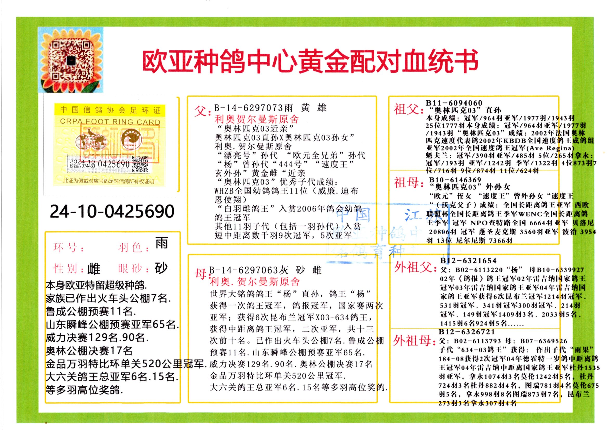 24年秋南京特比环欧亚荣获大团体冠军.小团体冠军551公里大特比13名.14名.16名.19名.20名.21名.24名.26名.27名.28名.42名.52名.54名.57名.65名.66名.68名.70名.71名.72名.74名.76名.80名.82名.83名.84名.85名.86名.90名.92名.110名.116名.121名.122名.128名.131名.158名.161名.164名.165名.166名.172名.174名.177名.182名.195名.196名.201名.205名.208名.210名.216名.253名.269名.275名.276名.294名.296名.299名,,24年秋云南天南铜都公棚决赛415名.天南铜都小棚决赛409名.云南玉活公棚决赛102名.490名.团体32名上笼二羽进二羽,天南铜都大棚506公里决赛445名。热烈祝贺河北省巨鹿县李兰生老师用欧亚泰山号血系连续十一年夺冠军,河北省国家赛冠军.全国季军等多次前十名高位,扬州王军王总用欧亚利奥24年春季获山东翔宇公棚决赛33名盖比53名。南京刘正龙刘总用欧亚盖比获得24年秋山东潍坊国际公棚决赛42名.精英赛30名.三关鸽王71名.决赛86名.加站赛16名.南京市特比环A组鸽王9名.B组鸽王5名.6名.C组鸽王5名.精英赛冠军4名.技能赛A组冠军4名.5名.秦淮区特比环荣获15名.46名.48名.87名。四川西昌徐亮徐总用欧亚利奥获得凉山州聚友决赛177名.第二关亚军双关鸽王19名.三关鸽王105名.云南豪庭公棚决赛603名。热烈祝贺24年四川重庆翔园鸽舍用欧亚泰山号荣获春季400公里冠军.秋季500公里冠军,河北王总用詹森X利奥获得千羽千翔公棚400公里冠军,广东蔡楷焕荣获24年秋爱好者 赛鸽俱乐部三关鸽王季军.一关420公里99名.二关450公里11名.三关520公里32名.单关季军.7名.12名,江西李卫兴荣获贵州红枫公棚8名.共翔俱乐部寄养棚四关综合鸽王30名.一关400公里78名.二关500公里55名.三关520公里37名.四关500公里57名.同父母获公棚18名.雷鸣获得武汉黄浦育翔中心冠军,四川陈文获得四川明鸿俱乐部300公里梦幻2名.3名.4名.9名.10名.13名.14名.15名.31名.34名.40名.41名.42名.43名.69名.71名.72名.73名.74名.94名.95名.97名.98名.99名.419公里决赛荣获总冠军7名.总共归巢9羽,四川徐亮获豪庭决赛603名,山西郑勇获得山西泰鑫公棚决赛255名詹森红狐,热烈祝贺马总获得开尔(飞跃队)决赛9名获奖金1310000万元.第一关52名,天津津福资赛180公里96名.获奖金429543万元,欧亚支持全国鸽友24年秋多人报喜 祝大家取得更好成绩,给欧亚报喜鸽友欧亚决定给每人赠送一羽超级种鸽。欧亚俱乐部特比环多关鸽王成绩:15年秋淮安特比环黑色星期一全会上笼9700多羽,当天无鸽归巢,第二天全会归巢357羽,本舍归巢158羽.前十名八羽.前一百名归巢57羽,16年春季获五关鸽王总冠军,总亚军四名.六名.七名.九名.十名.晶艺俱乐部520公里冠亚季军5名.6名.7名.9名.11名等,火车头冠军.季军6名.8名.9名.10名,16年秋晶艺俱乐部特比环520公里亚军.季军4名.6名.7名.9名,15年春南京白下特比环冠军.亚军.季军6名.7名.8名.9名.10名.指定鸽A B组获得冠军.亚军.季军4名.5名.,17年淮安特比环亚军.4名.5名.7名.8名.10名.六关鸽王总冠军.4名.6名.9名.10名,寄养棚宿迁刘总20羽特比环获冠军.季军.4名.7名.8名.9名等。18年荣获万羽特比环六关鸽王总冠军.总亚军.总季军.6名.8名.十名.单关四羽冠军.二羽亚军.四羽季军.前十名27羽。19年秋万羽特比环六关鸽王总亚军.总季军.5名.8名等,单关二羽冠军.三羽亚军.一羽季军前十名31羽。20年秋淮安市鸽会四关特比环大赛风雨无阻鸽王亚军.鸽王六名,金品俱乐部万羽特比环六关鸽王总冠军,总亚军.四名.五名.六名.七名.八名.十名.前二百名鸽王35羽,单关冠亚季军前十名四十多羽,火车头五关鸽王季军.六名.八名.前二百名鸽王十七羽。20年春荣获淮安五区一市四关鸽王总冠军.亚军.四名.八名.九名。21年秋荣获金品万羽特比环大赛六关鸽王总亚军.总季军.四名.七名.九名.十名.单关冠亚军季军前十名三十多羽。火车头协会鸽王六名.七名.十名.单关前十名十七羽。22年秋荣获鸽王总冠军.总亚军.5名.7名.8名.9名.11名.单关冠亚季军前十名三十多羽,第一关单关前二百名四十多羽,第二关前二百名三十多羽,第三关前二百名四十多羽,第四关前二百名四十多羽,第五关前一百名53羽。23年秋荣获鸽王季军.五名.八名.十名.13名.17名.20名.27名等多羽鸽王.单关前十名二十多羽。公棚.寄养棚部分成绩:16年秋宁夏黄河公棚总冠军电脑戈马力指定通炮冠军,17年送八羽参赛获得鸽王八名进奖四名,支持韩总荣获八名。支持鸽友荣获宁夏中卫公棚决赛总冠军.精英赛冠军,支持18年宁夏黄河公棚决赛冠军詹森X泰山。安徽鼎博寄养棚院内外四关鸽王总冠军.鸽王十七名.三十七名同窝,鸽王39名.42名.58名.67名。18年山东公棚预赛冠军.决赛65名.送八羽进奖五羽.指定获奔驰汽车一辆。支持鸽友获得云南蓝云公棚冠军.盖比X佛卡门。支持鸽友荣获云南银集公棚决赛冠军 詹森427X520血系 速度赛6700羽冠军。17年荣获金马俱乐部寄养棚四关鸽王总冠军.季军.六名.八名.第一关冠军.亚军.季军四名.七名.十一名.金牌教练奖。支持鸽友18年北京费翔公棚预赛九名电脑X桑杰士,支持鸽友荣获陕西威力公棚决赛11名.内蒙古临河寄养棚四关鸽王六名.詹森配泰山,支持河北王总用欧亚詹森427配胡本喜获20年秋开尔青年棚季军。云南东荣公棚16年预赛冠军.决赛77名.17年决赛12名.詹森红狐X泰山,17年平安公棚决赛4名 詹森427。欧亚获得21年金母寄养棚第一关四名.第二关5名.第三关5名.6名.7名.10名.三关鸽王总冠军,四关鸽王14名.十羽鸽王。支持河