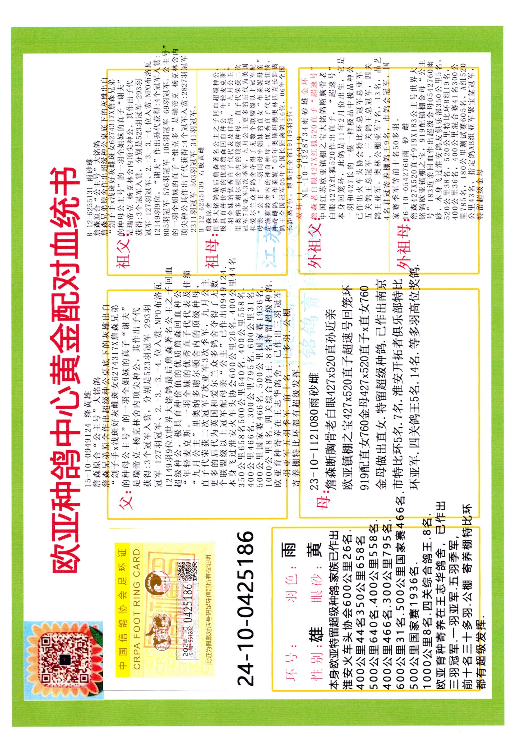 24年秋南京特比环欧亚荣获大团体冠军.小团体冠军551公里大特比13名.14名.16名.19名.20名.21名.24名.26名.27名.28名.42名.52名.54名.57名.65名.66名.68名.70名.71名.72名.74名.76名.80名.82名.83名.84名.85名.86名.90名.92名.110名.116名.121名.122名.128名.131名.158名.161名.164名.165名.166名.172名.174名.177名.182名.195名.196名.201名.205名.208名.210名.216名.253名.269名.275名.276名.294名.296名.299名,,24年秋云南天南铜都公棚决赛415名.天南铜都小棚决赛409名.云南玉活公棚决赛102名.490名.团体32名上笼二羽进二羽,天南铜都大棚506公里决赛445名。热烈祝贺河北省巨鹿县李兰生老师用欧亚泰山号血系连续十一年夺冠军,河北省国家赛冠军.全国季军等多次前十名高位,扬州王军王总用欧亚利奥24年春季获山东翔宇公棚决赛33名盖比53名。南京刘正龙刘总用欧亚盖比获得24年秋山东潍坊国际公棚决赛42名.精英赛30名.三关鸽王71名.决赛86名.加站赛16名.南京市特比环A组鸽王9名.B组鸽王5名.6名.C组鸽王5名.精英赛冠军4名.技能赛A组冠军4名.5名.秦淮区特比环荣获15名.46名.48名.87名。四川西昌徐亮徐总用欧亚利奥获得凉山州聚友决赛177名.第二关亚军双关鸽王19名.三关鸽王105名.云南豪庭公棚决赛603名。热烈祝贺24年四川重庆翔园鸽舍用欧亚泰山号荣获春季400公里冠军.秋季500公里冠军,河北王总用詹森X利奥获得千羽千翔公棚400公里冠军,广东蔡楷焕荣获24年秋爱好者 赛鸽俱乐部三关鸽王季军.一关420公里99名.二关450公里11名.三关520公里32名.单关季军.7名.12名,江西李卫兴荣获贵州红枫公棚8名.共翔俱乐部寄养棚四关综合鸽王30名.一关400公里78名.二关500公里55名.三关520公里37名.四关500公里57名.同父母获公棚18名.雷鸣获得武汉黄浦育翔中心冠军,四川陈文获得四川明鸿俱乐部300公里梦幻2名.3名.4名.9名.10名.13名.14名.15名.31名.34名.40名.41名.42名.43名.69名.71名.72名.73名.74名.94名.95名.97名.98名.99名.419公里决赛荣获总冠军7名.总共归巢9羽,四川徐亮获豪庭决赛603名,山西郑勇获得山西泰鑫公棚决赛255名詹森红狐,热烈祝贺马总获得开尔(飞跃队)决赛9名获奖金1310000万元.第一关52名,天津津福资赛180公里96名.获奖金429543万元,欧亚支持全国鸽友24年秋多人报喜 祝大家取得更好成绩,给欧亚报喜鸽友欧亚决定给每人赠送一羽超级种鸽。欧亚俱乐部特比环多关鸽王成绩:15年秋淮安特比环黑色星期一全会上笼9700多羽,当天无鸽归巢,第二天全会归巢357羽,本舍归巢158羽.前十名八羽.前一百名归巢57羽,16年春季获五关鸽王总冠军,总亚军四名.六名.七名.九名.十名.晶艺俱乐部520公里冠亚季军5名.6名.7名.9名.11名等,火车头冠军.季军6名.8名.9名.10名,16年秋晶艺俱乐部特比环520公里亚军.季军4名.6名.7名.9名,15年春南京白下特比环冠军.亚军.季军6名.7名.8名.9名.10名.指定鸽A B组获得冠军.亚军.季军4名.5名.,17年淮安特比环亚军.4名.5名.7名.8名.10名.六关鸽王总冠军.4名.6名.9名.10名,寄养棚宿迁刘总20羽特比环获冠军.季军.4名.7名.8名.9名等。18年荣获万羽特比环六关鸽王总冠军.总亚军.总季军.6名.8名.十名.单关四羽冠军.二羽亚军.四羽季军.前十名27羽。19年秋万羽特比环六关鸽王总亚军.总季军.5名.8名等,单关二羽冠军.三羽亚军.一羽季军前十名31羽。20年秋淮安市鸽会四关特比环大赛风雨无阻鸽王亚军.鸽王六名,金品俱乐部万羽特比环六关鸽王总冠军,总亚军.四名.五名.六名.七名.八名.十名.前二百名鸽王35羽,单关冠亚季军前十名四十多羽,火车头五关鸽王季军.六名.八名.前二百名鸽王十七羽。20年春荣获淮安五区一市四关鸽王总冠军.亚军.四名.八名.九名。21年秋荣获金品万羽特比环大赛六关鸽王总亚军.总季军.四名.七名.九名.十名.单关冠亚军季军前十名三十多羽。火车头协会鸽王六名.七名.十名.单关前十名十七羽。22年秋荣获鸽王总冠军.总亚军.5名.7名.8名.9名.11名.单关冠亚季军前十名三十多羽,第一关单关前二百名四十多羽,第二关前二百名三十多羽,第三关前二百名四十多羽,第四关前二百名四十多羽,第五关前一百名53羽。23年秋荣获鸽王季军.五名.八名.十名.13名.17名.20名.27名等多羽鸽王.单关前十名二十多羽。公棚.寄养棚部分成绩:16年秋宁夏黄河公棚总冠军电脑戈马力指定通炮冠军,17年送八羽参赛获得鸽王八名进奖四名,支持韩总荣获八名。支持鸽友荣获宁夏中卫公棚决赛总冠军.精英赛冠军,支持18年宁夏黄河公棚决赛冠军詹森X泰山。安徽鼎博寄养棚院内外四关鸽王总冠军.鸽王十七名.三十七名同窝,鸽王39名.42名.58名.67名。18年山东公棚预赛冠军.决赛65名.送八羽进奖五羽.指定获奔驰汽车一辆。支持鸽友获得云南蓝云公棚冠军.盖比X佛卡门。支持鸽友荣获云南银集公棚决赛冠军 詹森427X520血系 速度赛6700羽冠军。17年荣获金马俱乐部寄养棚四关鸽王总冠军.季军.六名.八名.第一关冠军.亚军.季军四名.七名.十一名.金牌教练奖。支持鸽友18年北京费翔公棚预赛九名电脑X桑杰士,支持鸽友荣获陕西威力公棚决赛11名.内蒙古临河寄养棚四关鸽王六名.詹森配泰山,支持河北王总用欧亚詹森427配胡本喜获20年秋开尔青年棚季军。云南东荣公棚16年预赛冠军.决赛77名.17年决赛12名.詹森红狐X泰山,17年平安公棚决赛4名 詹森427。欧亚获得21年金母寄养棚第一关四名.第二关5名.第三关5名.6名.7名.10名.三关鸽王总冠军,四关鸽王14名.十羽鸽王。支持河