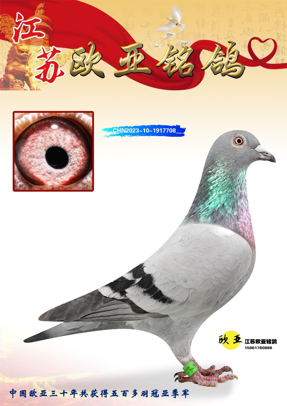 24年秋南京特比环欧亚荣获大团体冠军.小团体冠军551公里大特比13名.14名.16名.19名.20名.21名.24名.26名.27名.28名.42名.52名.54名.57名.65名.66名.68名.70名.71名.72名.74名.76名.80名.82名.83名.84名.85名.86名.90名.92名.110名.116名.121名.122名.128名.131名.158名.161名.164名.165名.166名.172名.174名.177名.182名.195名.196名.201名.205名.208名.210名.216名.253名.269名.275名.276名.294名.296名.299名,,24年秋云南天南铜都公棚决赛415名.天南铜都小棚决赛409名.云南玉活公棚决赛102名.490名.团体32名上笼二羽进二羽,天南铜都大棚506公里决赛445名。热烈祝贺河北省巨鹿县李兰生老师用欧亚泰山号血系连续十一年夺冠军,河北省国家赛冠军.全国季军等多次前十名高位,扬州王军王总用欧亚利奥24年春季获山东翔宇公棚决赛33名盖比53名。南京刘正龙刘总用欧亚盖比获得24年秋山东潍坊国际公棚决赛42名.精英赛30名.三关鸽王71名.决赛86名.加站赛16名.南京市特比环A组鸽王9名.B组鸽王5名.6名.C组鸽王5名.精英赛冠军4名.技能赛A组冠军4名.5名.秦淮区特比环荣获15名.46名.48名.87名。四川西昌徐亮徐总用欧亚利奥获得凉山州聚友决赛177名.第二关亚军双关鸽王19名.三关鸽王105名.云南豪庭公棚决赛603名。热烈祝贺24年四川重庆翔园鸽舍用欧亚泰山号荣获春季400公里冠军.秋季500公里冠军,河北王总用詹森X利奥获得千羽千翔公棚400公里冠军,广东蔡楷焕荣获24年秋爱好者 赛鸽俱乐部三关鸽王季军.一关420公里99名.二关450公里11名.三关520公里32名.单关季军.7名.12名,江西李卫兴荣获贵州红枫公棚8名.共翔俱乐部寄养棚四关综合鸽王30名.一关400公里78名.二关500公里55名.三关520公里37名.四关500公里57名.同父母获公棚18名.雷鸣获得武汉黄浦育翔中心冠军,四川陈文获得四川明鸿俱乐部300公里梦幻2名.3名.4名.9名.10名.13名.14名.15名.31名.34名.40名.41名.42名.43名.69名.71名.72名.73名.74名.94名.95名.97名.98名.99名.419公里决赛荣获总冠军7名.总共归巢9羽,四川徐亮获豪庭决赛603名,山西郑勇获得山西泰鑫公棚决赛255名詹森红狐,热烈祝贺马总获得开尔(飞跃队)决赛9名获奖金1310000万元.第一关52名,天津津福资赛180公里96名.获奖金429543万元,欧亚支持全国鸽友24年秋多人报喜 祝大家取得更好成绩,给欧亚报喜鸽友欧亚决定给每人赠送一羽超级种鸽。欧亚俱乐部特比环多关鸽王成绩:15年秋淮安特比环黑色星期一全会上笼9700多羽,当天无鸽归巢,第二天全会归巢357羽,本舍归巢158羽.前十名八羽.前一百名归巢57羽,16年春季获五关鸽王总冠军,总亚军四名.六名.七名.九名.十名.晶艺俱乐部520公里冠亚季军5名.6名.7名.9名.11名等,火车头冠军.季军6名.8名.9名.10名,16年秋晶艺俱乐部特比环520公里亚军.季军4名.6名.7名.9名,15年春南京白下特比环冠军.亚军.季军6名.7名.8名.9名.10名.指定鸽A B组获得冠军.亚军.季军4名.5名.,17年淮安特比环亚军.4名.5名.7名.8名.10名.六关鸽王总冠军.4名.6名.9名.10名,寄养棚宿迁刘总20羽特比环获冠军.季军.4名.7名.8名.9名等。18年荣获万羽特比环六关鸽王总冠军.总亚军.总季军.6名.8名.十名.单关四羽冠军.二羽亚军.四羽季军.前十名27羽。19年秋万羽特比环六关鸽王总亚军.总季军.5名.8名等,单关二羽冠军.三羽亚军.一羽季军前十名31羽。20年秋淮安市鸽会四关特比环大赛风雨无阻鸽王亚军.鸽王六名,金品俱乐部万羽特比环六关鸽王总冠军,总亚军.四名.五名.六名.七名.八名.十名.前二百名鸽王35羽,单关冠亚季军前十名四十多羽,火车头五关鸽王季军.六名.八名.前二百名鸽王十七羽。20年春荣获淮安五区一市四关鸽王总冠军.亚军.四名.八名.九名。21年秋荣获金品万羽特比环大赛六关鸽王总亚军.总季军.四名.七名.九名.十名.单关冠亚军季军前十名三十多羽。火车头协会鸽王六名.七名.十名.单关前十名十七羽。22年秋荣获鸽王总冠军.总亚军.5名.7名.8名.9名.11名.单关冠亚季军前十名三十多羽,第一关单关前二百名四十多羽,第二关前二百名三十多羽,第三关前二百名四十多羽,第四关前二百名四十多羽,第五关前一百名53羽。23年秋荣获鸽王季军.五名.八名.十名.13名.17名.20名.27名等多羽鸽王.单关前十名二十多羽。公棚.寄养棚部分成绩:16年秋宁夏黄河公棚总冠军电脑戈马力指定通炮冠军,17年送八羽参赛获得鸽王八名进奖四名,支持韩总荣获八名。支持鸽友荣获宁夏中卫公棚决赛总冠军.精英赛冠军,支持18年宁夏黄河公棚决赛冠军詹森X泰山。安徽鼎博寄养棚院内外四关鸽王总冠军.鸽王十七名.三十七名同窝,鸽王39名.42名.58名.67名。18年山东公棚预赛冠军.决赛65名.送八羽进奖五羽.指定获奔驰汽车一辆。支持鸽友获得云南蓝云公棚冠军.盖比X佛卡门。支持鸽友荣获云南银集公棚决赛冠军 詹森427X520血系 速度赛6700羽冠军。17年荣获金马俱乐部寄养棚四关鸽王总冠军.季军.六名.八名.第一关冠军.亚军.季军四名.七名.十一名.金牌教练奖。支持鸽友18年北京费翔公棚预赛九名电脑X桑杰士,支持鸽友荣获陕西威力公棚决赛11名.内蒙古临河寄养棚四关鸽王六名.詹森配泰山,支持河北王总用欧亚詹森427配胡本喜获20年秋开尔青年棚季军。云南东荣公棚16年预赛冠军.决赛77名.17年决赛12名.詹森红狐X泰山,17年平安公棚决赛4名 詹森427。欧亚获得21年金母寄养棚第一关四名.第二关5名.第三关5名.6名.7名.10名.三关鸽王总冠军,四关鸽王14名.十羽鸽王。支持河