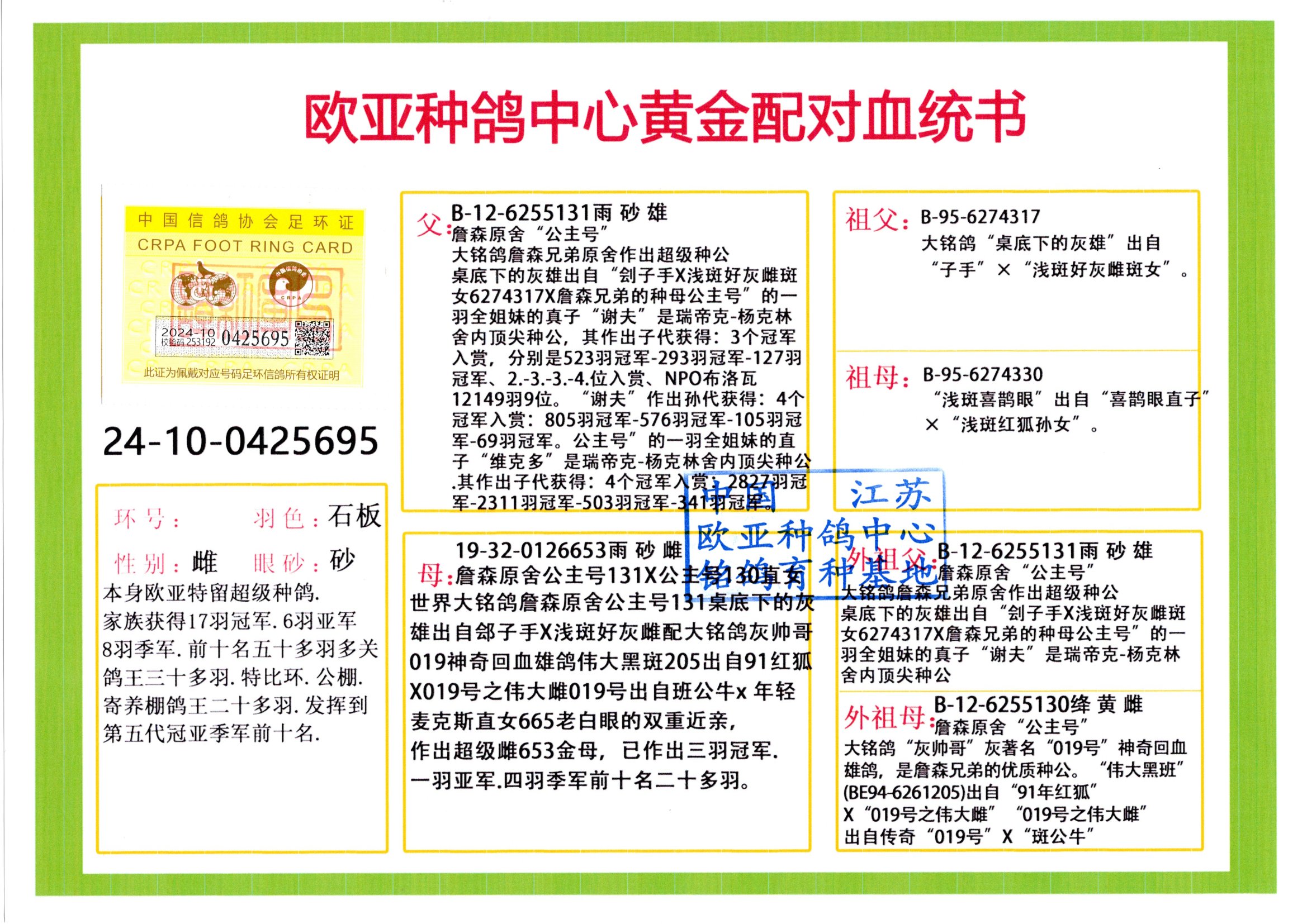 24年秋南京特比环欧亚荣获大团体冠军.小团体冠军551公里大特比13名.14名.16名.19名.20名.21名.24名.26名.27名.28名.42名.52名.54名.57名.65名.66名.68名.70名.71名.72名.74名.76名.80名.82名.83名.84名.85名.86名.90名.92名.110名.116名.121名.122名.128名.131名.158名.161名.164名.165名.166名.172名.174名.177名.182名.195名.196名.201名.205名.208名.210名.216名.253名.269名.275名.276名.294名.296名.299名,,24年秋云南天南铜都公棚决赛415名.天南铜都小棚决赛409名.云南玉活公棚决赛102名.490名.团体32名上笼二羽进二羽,天南铜都大棚506公里决赛445名。热烈祝贺河北省巨鹿县李兰生老师用欧亚泰山号血系连续十一年夺冠军,河北省国家赛冠军.全国季军等多次前十名高位,扬州王军王总用欧亚利奥24年春季获山东翔宇公棚决赛33名盖比53名。南京刘正龙刘总用欧亚盖比获得24年秋山东潍坊国际公棚决赛42名.精英赛30名.三关鸽王71名.决赛86名.加站赛16名.南京市特比环A组鸽王9名.B组鸽王5名.6名.C组鸽王5名.精英赛冠军4名.技能赛A组冠军4名.5名.秦淮区特比环荣获15名.46名.48名.87名。四川西昌徐亮徐总用欧亚利奥获得凉山州聚友决赛177名.第二关亚军双关鸽王19名.三关鸽王105名.云南豪庭公棚决赛603名。热烈祝贺24年四川重庆翔园鸽舍用欧亚泰山号荣获春季400公里冠军.秋季500公里冠军,河北王总用詹森X利奥获得千羽千翔公棚400公里冠军,广东蔡楷焕荣获24年秋爱好者 赛鸽俱乐部三关鸽王季军.一关420公里99名.二关450公里11名.三关520公里32名.单关季军.7名.12名,江西李卫兴荣获贵州红枫公棚8名.共翔俱乐部寄养棚四关综合鸽王30名.一关400公里78名.二关500公里55名.三关520公里37名.四关500公里57名.同父母获公棚18名.雷鸣获得武汉黄浦育翔中心冠军,四川陈文获得四川明鸿俱乐部300公里梦幻2名.3名.4名.9名.10名.13名.14名.15名.31名.34名.40名.41名.42名.43名.69名.71名.72名.73名.74名.94名.95名.97名.98名.99名.419公里决赛荣获总冠军7名.总共归巢9羽,四川徐亮获豪庭决赛603名,山西郑勇获得山西泰鑫公棚决赛255名詹森红狐,热烈祝贺马总获得开尔(飞跃队)决赛9名获奖金1310000万元.第一关52名,天津津福资赛180公里96名.获奖金429543万元,欧亚支持全国鸽友24年秋多人报喜 祝大家取得更好成绩,给欧亚报喜鸽友欧亚决定给每人赠送一羽超级种鸽。欧亚俱乐部特比环多关鸽王成绩:15年秋淮安特比环黑色星期一全会上笼9700多羽,当天无鸽归巢,第二天全会归巢357羽,本舍归巢158羽.前十名八羽.前一百名归巢57羽,16年春季获五关鸽王总冠军,总亚军四名.六名.七名.九名.十名.晶艺俱乐部520公里冠亚季军5名.6名.7名.9名.11名等,火车头冠军.季军6名.8名.9名.10名,16年秋晶艺俱乐部特比环520公里亚军.季军4名.6名.7名.9名,15年春南京白下特比环冠军.亚军.季军6名.7名.8名.9名.10名.指定鸽A B组获得冠军.亚军.季军4名.5名.,17年淮安特比环亚军.4名.5名.7名.8名.10名.六关鸽王总冠军.4名.6名.9名.10名,寄养棚宿迁刘总20羽特比环获冠军.季军.4名.7名.8名.9名等。18年荣获万羽特比环六关鸽王总冠军.总亚军.总季军.6名.8名.十名.单关四羽冠军.二羽亚军.四羽季军.前十名27羽。19年秋万羽特比环六关鸽王总亚军.总季军.5名.8名等,单关二羽冠军.三羽亚军.一羽季军前十名31羽。20年秋淮安市鸽会四关特比环大赛风雨无阻鸽王亚军.鸽王六名,金品俱乐部万羽特比环六关鸽王总冠军,总亚军.四名.五名.六名.七名.八名.十名.前二百名鸽王35羽,单关冠亚季军前十名四十多羽,火车头五关鸽王季军.六名.八名.前二百名鸽王十七羽。20年春荣获淮安五区一市四关鸽王总冠军.亚军.四名.八名.九名。21年秋荣获金品万羽特比环大赛六关鸽王总亚军.总季军.四名.七名.九名.十名.单关冠亚军季军前十名三十多羽。火车头协会鸽王六名.七名.十名.单关前十名十七羽。22年秋荣获鸽王总冠军.总亚军.5名.7名.8名.9名.11名.单关冠亚季军前十名三十多羽,第一关单关前二百名四十多羽,第二关前二百名三十多羽,第三关前二百名四十多羽,第四关前二百名四十多羽,第五关前一百名53羽。23年秋荣获鸽王季军.五名.八名.十名.13名.17名.20名.27名等多羽鸽王.单关前十名二十多羽。公棚.寄养棚部分成绩:16年秋宁夏黄河公棚总冠军电脑戈马力指定通炮冠军,17年送八羽参赛获得鸽王八名进奖四名,支持韩总荣获八名。支持鸽友荣获宁夏中卫公棚决赛总冠军.精英赛冠军,支持18年宁夏黄河公棚决赛冠军詹森X泰山。安徽鼎博寄养棚院内外四关鸽王总冠军.鸽王十七名.三十七名同窝,鸽王39名.42名.58名.67名。18年山东公棚预赛冠军.决赛65名.送八羽进奖五羽.指定获奔驰汽车一辆。支持鸽友获得云南蓝云公棚冠军.盖比X佛卡门。支持鸽友荣获云南银集公棚决赛冠军 詹森427X520血系 速度赛6700羽冠军。17年荣获金马俱乐部寄养棚四关鸽王总冠军.季军.六名.八名.第一关冠军.亚军.季军四名.七名.十一名.金牌教练奖。支持鸽友18年北京费翔公棚预赛九名电脑X桑杰士,支持鸽友荣获陕西威力公棚决赛11名.内蒙古临河寄养棚四关鸽王六名.詹森配泰山,支持河北王总用欧亚詹森427配胡本喜获20年秋开尔青年棚季军。云南东荣公棚16年预赛冠军.决赛77名.17年决赛12名.詹森红狐X泰山,17年平安公棚决赛4名 詹森427。欧亚获得21年金母寄养棚第一关四名.第二关5名.第三关5名.6名.7名.10名.三关鸽王总冠军,四关鸽王14名.十羽鸽王。支持河