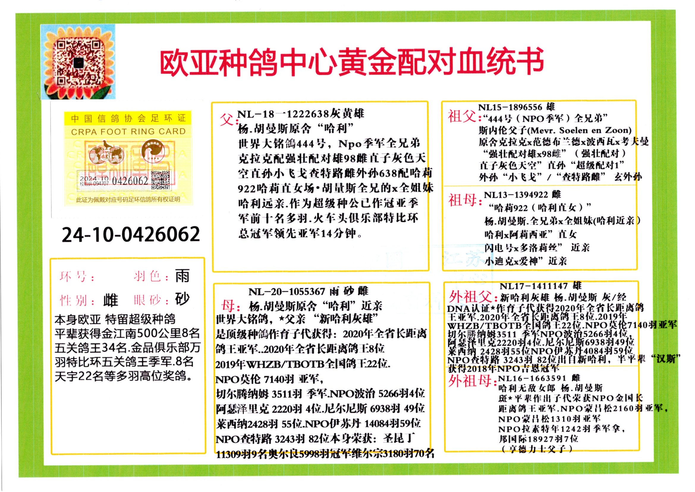 24年秋南京特比环欧亚荣获大团体冠军.小团体冠军551公里大特比13名.14名.16名.19名.20名.21名.24名.26名.27名.28名.42名.52名.54名.57名.65名.66名.68名.70名.71名.72名.74名.76名.80名.82名.83名.84名.85名.86名.90名.92名.110名.116名.121名.122名.128名.131名.158名.161名.164名.165名.166名.172名.174名.177名.182名.195名.196名.201名.205名.208名.210名.216名.253名.269名.275名.276名.294名.296名.299名,,24年秋云南天南铜都公棚决赛415名.天南铜都小棚决赛409名.云南玉活公棚决赛102名.490名.团体32名上笼二羽进二羽,天南铜都大棚506公里决赛445名。热烈祝贺河北省巨鹿县李兰生老师用欧亚泰山号血系连续十一年夺冠军,河北省国家赛冠军.全国季军等多次前十名高位,扬州王军王总用欧亚利奥24年春季获山东翔宇公棚决赛33名盖比53名。南京刘正龙刘总用欧亚盖比获得24年秋山东潍坊国际公棚决赛42名.精英赛30名.三关鸽王71名.决赛86名.加站赛16名.南京市特比环A组鸽王9名.B组鸽王5名.6名.C组鸽王5名.精英赛冠军4名.技能赛A组冠军4名.5名.秦淮区特比环荣获15名.46名.48名.87名。四川西昌徐亮徐总用欧亚利奥获得凉山州聚友决赛177名.第二关亚军双关鸽王19名.三关鸽王105名.云南豪庭公棚决赛603名。热烈祝贺24年四川重庆翔园鸽舍用欧亚泰山号荣获春季400公里冠军.秋季500公里冠军,河北王总用詹森X利奥获得千羽千翔公棚400公里冠军,广东蔡楷焕荣获24年秋爱好者 赛鸽俱乐部三关鸽王季军.一关420公里99名.二关450公里11名.三关520公里32名.单关季军.7名.12名,江西李卫兴荣获贵州红枫公棚8名.共翔俱乐部寄养棚四关综合鸽王30名.一关400公里78名.二关500公里55名.三关520公里37名.四关500公里57名.同父母获公棚18名.雷鸣获得武汉黄浦育翔中心冠军,四川陈文获得四川明鸿俱乐部300公里梦幻2名.3名.4名.9名.10名.13名.14名.15名.31名.34名.40名.41名.42名.43名.69名.71名.72名.73名.74名.94名.95名.97名.98名.99名.419公里决赛荣获总冠军7名.总共归巢9羽,四川徐亮获豪庭决赛603名,山西郑勇获得山西泰鑫公棚决赛255名詹森红狐,热烈祝贺马总获得开尔(飞跃队)决赛9名获奖金1310000万元.第一关52名,天津津福资赛180公里96名.获奖金429543万元,欧亚支持全国鸽友24年秋多人报喜 祝大家取得更好成绩,给欧亚报喜鸽友欧亚决定给每人赠送一羽超级种鸽。欧亚俱乐部特比环多关鸽王成绩:15年秋淮安特比环黑色星期一全会上笼9700多羽,当天无鸽归巢,第二天全会归巢357羽,本舍归巢158羽.前十名八羽.前一百名归巢57羽,16年春季获五关鸽王总冠军,总亚军四名.六名.七名.九名.十名.晶艺俱乐部520公里冠亚季军5名.6名.7名.9名.11名等,火车头冠军.季军6名.8名.9名.10名,16年秋晶艺俱乐部特比环520公里亚军.季军4名.6名.7名.9名,15年春南京白下特比环冠军.亚军.季军6名.7名.8名.9名.10名.指定鸽A B组获得冠军.亚军.季军4名.5名.,17年淮安特比环亚军.4名.5名.7名.8名.10名.六关鸽王总冠军.4名.6名.9名.10名,寄养棚宿迁刘总20羽特比环获冠军.季军.4名.7名.8名.9名等。18年荣获万羽特比环六关鸽王总冠军.总亚军.总季军.6名.8名.十名.单关四羽冠军.二羽亚军.四羽季军.前十名27羽。19年秋万羽特比环六关鸽王总亚军.总季军.5名.8名等,单关二羽冠军.三羽亚军.一羽季军前十名31羽。20年秋淮安市鸽会四关特比环大赛风雨无阻鸽王亚军.鸽王六名,金品俱乐部万羽特比环六关鸽王总冠军,总亚军.四名.五名.六名.七名.八名.十名.前二百名鸽王35羽,单关冠亚季军前十名四十多羽,火车头五关鸽王季军.六名.八名.前二百名鸽王十七羽。20年春荣获淮安五区一市四关鸽王总冠军.亚军.四名.八名.九名。21年秋荣获金品万羽特比环大赛六关鸽王总亚军.总季军.四名.七名.九名.十名.单关冠亚军季军前十名三十多羽。火车头协会鸽王六名.七名.十名.单关前十名十七羽。22年秋荣获鸽王总冠军.总亚军.5名.7名.8名.9名.11名.单关冠亚季军前十名三十多羽,第一关单关前二百名四十多羽,第二关前二百名三十多羽,第三关前二百名四十多羽,第四关前二百名四十多羽,第五关前一百名53羽。23年秋荣获鸽王季军.五名.八名.十名.13名.17名.20名.27名等多羽鸽王.单关前十名二十多羽。公棚.寄养棚部分成绩:16年秋宁夏黄河公棚总冠军电脑戈马力指定通炮冠军,17年送八羽参赛获得鸽王八名进奖四名,支持韩总荣获八名。支持鸽友荣获宁夏中卫公棚决赛总冠军.精英赛冠军,支持18年宁夏黄河公棚决赛冠军詹森X泰山。安徽鼎博寄养棚院内外四关鸽王总冠军.鸽王十七名.三十七名同窝,鸽王39名.42名.58名.67名。18年山东公棚预赛冠军.决赛65名.送八羽进奖五羽.指定获奔驰汽车一辆。支持鸽友获得云南蓝云公棚冠军.盖比X佛卡门。支持鸽友荣获云南银集公棚决赛冠军 詹森427X520血系 速度赛6700羽冠军。17年荣获金马俱乐部寄养棚四关鸽王总冠军.季军.六名.八名.第一关冠军.亚军.季军四名.七名.十一名.金牌教练奖。支持鸽友18年北京费翔公棚预赛九名电脑X桑杰士,支持鸽友荣获陕西威力公棚决赛11名.内蒙古临河寄养棚四关鸽王六名.詹森配泰山,支持河北王总用欧亚詹森427配胡本喜获20年秋开尔青年棚季军。云南东荣公棚16年预赛冠军.决赛77名.17年决赛12名.詹森红狐X泰山,17年平安公棚决赛4名 詹森427。欧亚获得21年金母寄养棚第一关四名.第二关5名.第三关5名.6名.7名.10名.三关鸽王总冠军,四关鸽王14名.十羽鸽王。支持河