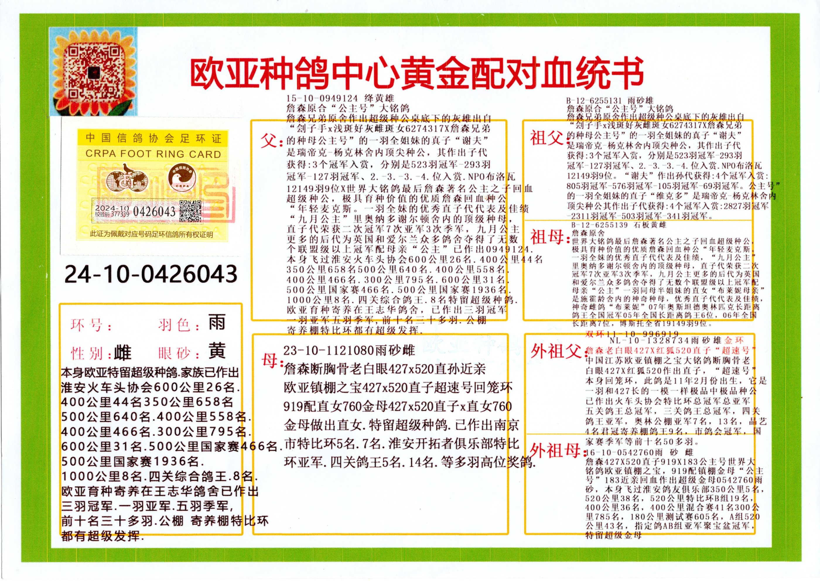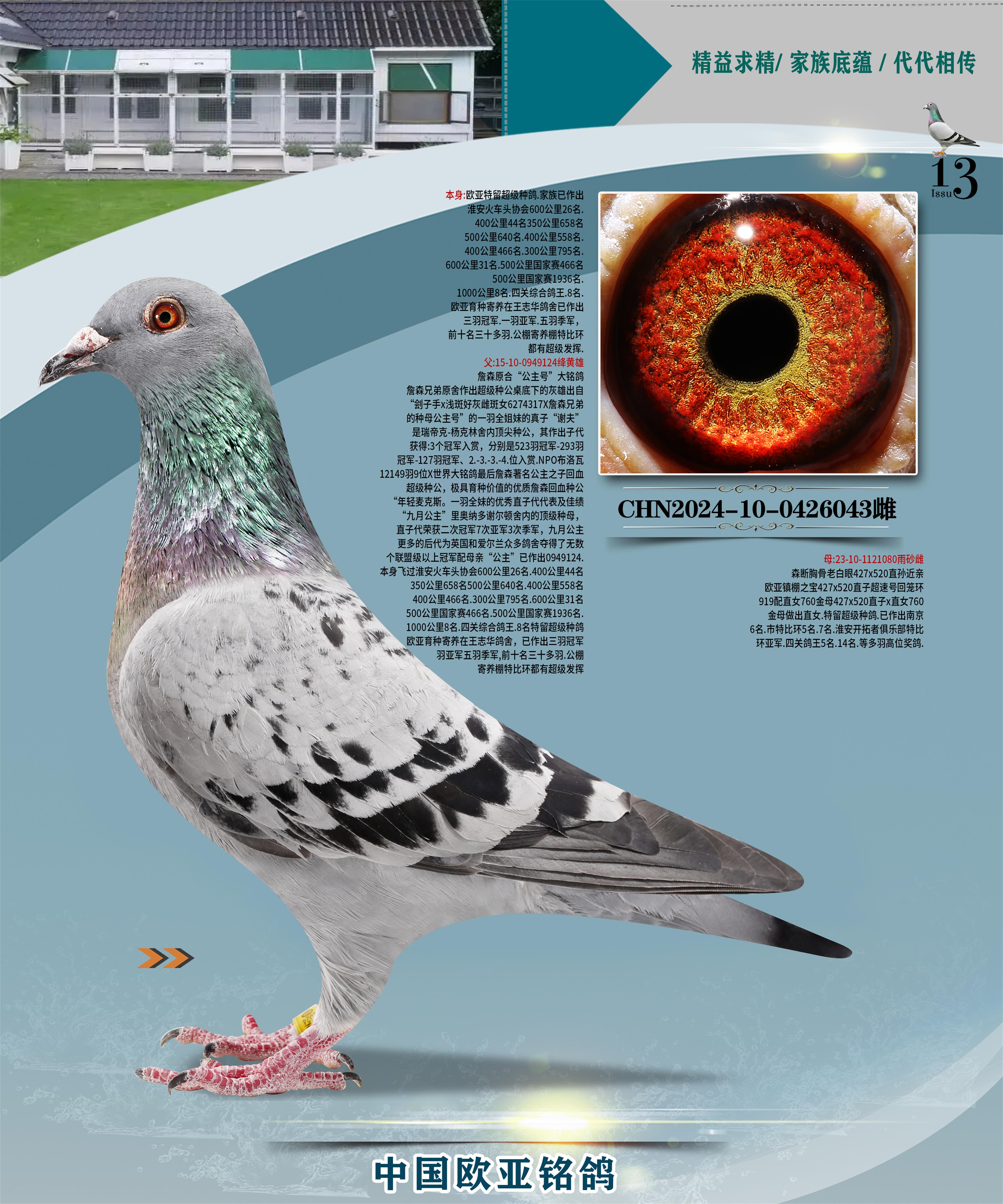24年秋南京特比环欧亚荣获大团体冠军.小团体冠军551公里大特比13名.14名.16名.19名.20名.21名.24名.26名.27名.28名.42名.52名.54名.57名.65名.66名.68名.70名.71名.72名.74名.76名.80名.82名.83名.84名.85名.86名.90名.92名.110名.116名.121名.122名.128名.131名.158名.161名.164名.165名.166名.172名.174名.177名.182名.195名.196名.201名.205名.208名.210名.216名.253名.269名.275名.276名.294名.296名.299名,,24年秋云南天南铜都公棚决赛415名.天南铜都小棚决赛409名.云南玉活公棚决赛102名.490名.团体32名上笼二羽进二羽,天南铜都大棚506公里决赛445名。热烈祝贺河北省巨鹿县李兰生老师用欧亚泰山号血系连续十一年夺冠军,河北省国家赛冠军.全国季军等多次前十名高位,扬州王军王总用欧亚利奥24年春季获山东翔宇公棚决赛33名盖比53名。南京刘正龙刘总用欧亚盖比获得24年秋山东潍坊国际公棚决赛42名.精英赛30名.三关鸽王71名.决赛86名.加站赛16名.南京市特比环A组鸽王9名.B组鸽王5名.6名.C组鸽王5名.精英赛冠军4名.技能赛A组冠军4名.5名.秦淮区特比环荣获15名.46名.48名.87名。四川西昌徐亮徐总用欧亚利奥获得凉山州聚友决赛177名.第二关亚军双关鸽王19名.三关鸽王105名.云南豪庭公棚决赛603名。热烈祝贺24年四川重庆翔园鸽舍用欧亚泰山号荣获春季400公里冠军.秋季500公里冠军,河北王总用詹森X利奥获得千羽千翔公棚400公里冠军,广东蔡楷焕荣获24年秋爱好者 赛鸽俱乐部三关鸽王季军.一关420公里99名.二关450公里11名.三关520公里32名.单关季军.7名.12名,江西李卫兴荣获贵州红枫公棚8名.共翔俱乐部寄养棚四关综合鸽王30名.一关400公里78名.二关500公里55名.三关520公里37名.四关500公里57名.同父母获公棚18名.雷鸣获得武汉黄浦育翔中心冠军,四川陈文获得四川明鸿俱乐部300公里梦幻2名.3名.4名.9名.10名.13名.14名.15名.31名.34名.40名.41名.42名.43名.69名.71名.72名.73名.74名.94名.95名.97名.98名.99名.419公里决赛荣获总冠军7名.总共归巢9羽,四川徐亮获豪庭决赛603名,山西郑勇获得山西泰鑫公棚决赛255名詹森红狐,热烈祝贺马总获得开尔(飞跃队)决赛9名获奖金1310000万元.第一关52名,天津津福资赛180公里96名.获奖金429543万元,欧亚支持全国鸽友24年秋多人报喜 祝大家取得更好成绩,给欧亚报喜鸽友欧亚决定给每人赠送一羽超级种鸽。欧亚俱乐部特比环多关鸽王成绩:15年秋淮安特比环黑色星期一全会上笼9700多羽,当天无鸽归巢,第二天全会归巢357羽,本舍归巢158羽.前十名八羽.前一百名归巢57羽,16年春季获五关鸽王总冠军,总亚军四名.六名.七名.九名.十名.晶艺俱乐部520公里冠亚季军5名.6名.7名.9名.11名等,火车头冠军.季军6名.8名.9名.10名,16年秋晶艺俱乐部特比环520公里亚军.季军4名.6名.7名.9名,15年春南京白下特比环冠军.亚军.季军6名.7名.8名.9名.10名.指定鸽A B组获得冠军.亚军.季军4名.5名.,17年淮安特比环亚军.4名.5名.7名.8名.10名.六关鸽王总冠军.4名.6名.9名.10名,寄养棚宿迁刘总20羽特比环获冠军.季军.4名.7名.8名.9名等。18年荣获万羽特比环六关鸽王总冠军.总亚军.总季军.6名.8名.十名.单关四羽冠军.二羽亚军.四羽季军.前十名27羽。19年秋万羽特比环六关鸽王总亚军.总季军.5名.8名等,单关二羽冠军.三羽亚军.一羽季军前十名31羽。20年秋淮安市鸽会四关特比环大赛风雨无阻鸽王亚军.鸽王六名,金品俱乐部万羽特比环六关鸽王总冠军,总亚军.四名.五名.六名.七名.八名.十名.前二百名鸽王35羽,单关冠亚季军前十名四十多羽,火车头五关鸽王季军.六名.八名.前二百名鸽王十七羽。20年春荣获淮安五区一市四关鸽王总冠军.亚军.四名.八名.九名。21年秋荣获金品万羽特比环大赛六关鸽王总亚军.总季军.四名.七名.九名.十名.单关冠亚军季军前十名三十多羽。火车头协会鸽王六名.七名.十名.单关前十名十七羽。22年秋荣获鸽王总冠军.总亚军.5名.7名.8名.9名.11名.单关冠亚季军前十名三十多羽,第一关单关前二百名四十多羽,第二关前二百名三十多羽,第三关前二百名四十多羽,第四关前二百名四十多羽,第五关前一百名53羽。23年秋荣获鸽王季军.五名.八名.十名.13名.17名.20名.27名等多羽鸽王.单关前十名二十多羽。公棚.寄养棚部分成绩:16年秋宁夏黄河公棚总冠军电脑戈马力指定通炮冠军,17年送八羽参赛获得鸽王八名进奖四名,支持韩总荣获八名。支持鸽友荣获宁夏中卫公棚决赛总冠军.精英赛冠军,支持18年宁夏黄河公棚决赛冠军詹森X泰山。安徽鼎博寄养棚院内外四关鸽王总冠军.鸽王十七名.三十七名同窝,鸽王39名.42名.58名.67名。18年山东公棚预赛冠军.决赛65名.送八羽进奖五羽.指定获奔驰汽车一辆。支持鸽友获得云南蓝云公棚冠军.盖比X佛卡门。支持鸽友荣获云南银集公棚决赛冠军 詹森427X520血系 速度赛6700羽冠军。17年荣获金马俱乐部寄养棚四关鸽王总冠军.季军.六名.八名.第一关冠军.亚军.季军四名.七名.十一名.金牌教练奖。支持鸽友18年北京费翔公棚预赛九名电脑X桑杰士,支持鸽友荣获陕西威力公棚决赛11名.内蒙古临河寄养棚四关鸽王六名.詹森配泰山,支持河北王总用欧亚詹森427配胡本喜获20年秋开尔青年棚季军。云南东荣公棚16年预赛冠军.决赛77名.17年决赛12名.詹森红狐X泰山,17年平安公棚决赛4名 詹森427。欧亚获得21年金母寄养棚第一关四名.第二关5名.第三关5名.6名.7名.10名.三关鸽王总冠军,四关鸽王14名.十羽鸽王。支持河