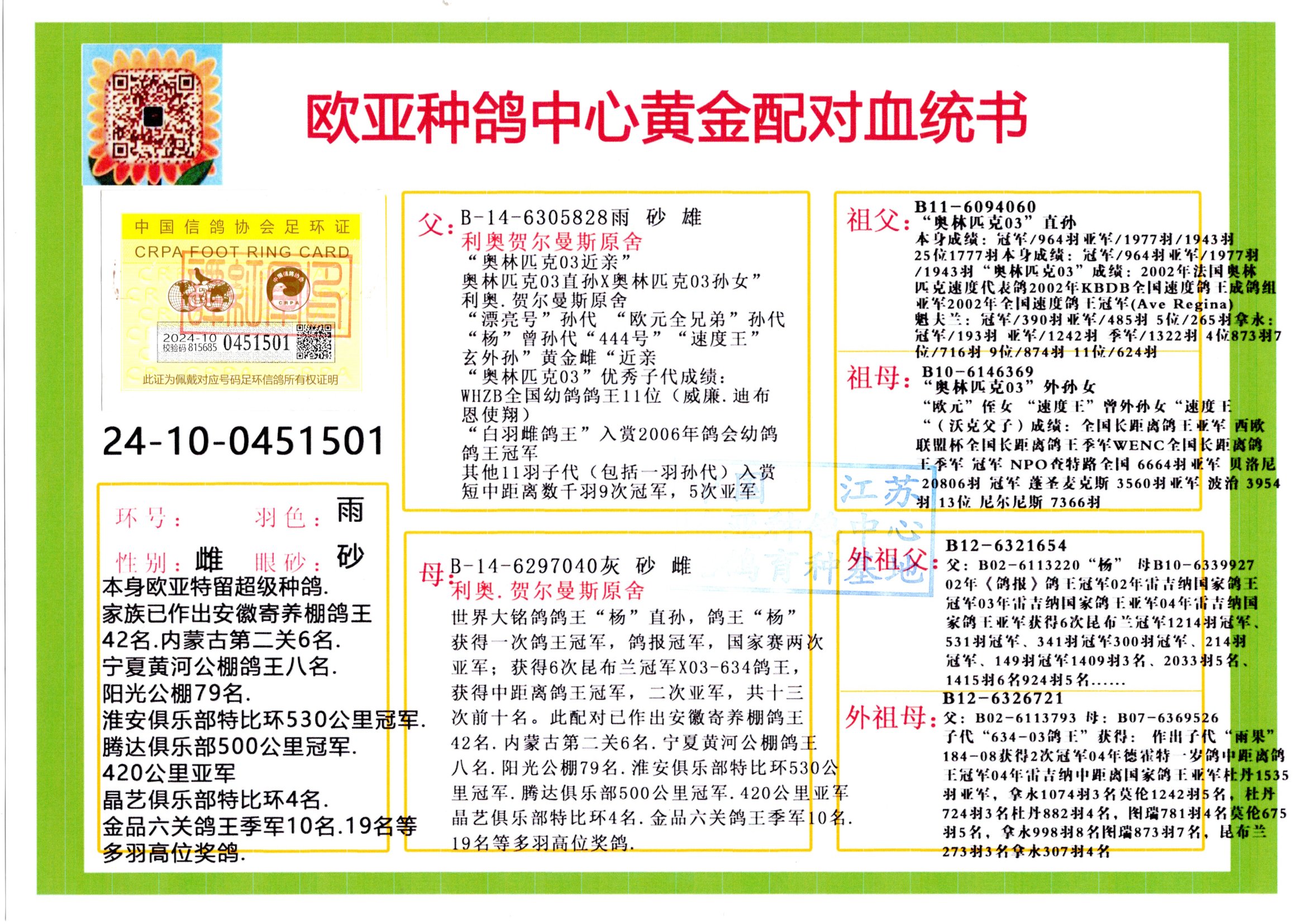 24年秋南京特比环欧亚荣获大团体冠军.小团体冠军551公里大特比13名.14名.16名.19名.20名.21名.24名.26名.27名.28名.42名.52名.54名.57名.65名.66名.68名.70名.71名.72名.74名.76名.80名.82名.83名.84名.85名.86名.90名.92名.110名.116名.121名.122名.128名.131名.158名.161名.164名.165名.166名.172名.174名.177名.182名.195名.196名.201名.205名.208名.210名.216名.253名.269名.275名.276名.294名.296名.299名,,24年秋云南天南铜都公棚决赛415名.天南铜都小棚决赛409名.云南玉活公棚决赛102名.490名.团体32名上笼二羽进二羽,天南铜都大棚506公里决赛445名。热烈祝贺河北省巨鹿县李兰生老师用欧亚泰山号血系连续十一年夺冠军,河北省国家赛冠军.全国季军等多次前十名高位,扬州王军王总用欧亚利奥24年春季获山东翔宇公棚决赛33名盖比53名。南京刘正龙刘总用欧亚盖比获得24年秋山东潍坊国际公棚决赛42名.精英赛30名.三关鸽王71名.决赛86名.加站赛16名.南京市特比环A组鸽王9名.B组鸽王5名.6名.C组鸽王5名.精英赛冠军4名.技能赛A组冠军4名.5名.秦淮区特比环荣获15名.46名.48名.87名。四川西昌徐亮徐总用欧亚利奥获得凉山州聚友决赛177名.第二关亚军双关鸽王19名.三关鸽王105名.云南豪庭公棚决赛603名。热烈祝贺24年四川重庆翔园鸽舍用欧亚泰山号荣获春季400公里冠军.秋季500公里冠军,河北王总用詹森X利奥获得千羽千翔公棚400公里冠军,广东蔡楷焕荣获24年秋爱好者 赛鸽俱乐部三关鸽王季军.一关420公里99名.二关450公里11名.三关520公里32名.单关季军.7名.12名,江西李卫兴荣获贵州红枫公棚8名.共翔俱乐部寄养棚四关综合鸽王30名.一关400公里78名.二关500公里55名.三关520公里37名.四关500公里57名.同父母获公棚18名.雷鸣获得武汉黄浦育翔中心冠军,四川陈文获得四川明鸿俱乐部300公里梦幻2名.3名.4名.9名.10名.13名.14名.15名.31名.34名.40名.41名.42名.43名.69名.71名.72名.73名.74名.94名.95名.97名.98名.99名.419公里决赛荣获总冠军7名.总共归巢9羽,四川徐亮获豪庭决赛603名,山西郑勇获得山西泰鑫公棚决赛255名詹森红狐,热烈祝贺马总获得开尔(飞跃队)决赛9名获奖金1310000万元.第一关52名,天津津福资赛180公里96名.获奖金429543万元,欧亚支持全国鸽友24年秋多人报喜 祝大家取得更好成绩,给欧亚报喜鸽友欧亚决定给每人赠送一羽超级种鸽。欧亚俱乐部特比环多关鸽王成绩:15年秋淮安特比环黑色星期一全会上笼9700多羽,当天无鸽归巢,第二天全会归巢357羽,本舍归巢158羽.前十名八羽.前一百名归巢57羽,16年春季获五关鸽王总冠军,总亚军四名.六名.七名.九名.十名.晶艺俱乐部520公里冠亚季军5名.6名.7名.9名.11名等,火车头冠军.季军6名.8名.9名.10名,16年秋晶艺俱乐部特比环520公里亚军.季军4名.6名.7名.9名,15年春南京白下特比环冠军.亚军.季军6名.7名.8名.9名.10名.指定鸽A B组获得冠军.亚军.季军4名.5名.,17年淮安特比环亚军.4名.5名.7名.8名.10名.六关鸽王总冠军.4名.6名.9名.10名,寄养棚宿迁刘总20羽特比环获冠军.季军.4名.7名.8名.9名等。18年荣获万羽特比环六关鸽王总冠军.总亚军.总季军.6名.8名.十名.单关四羽冠军.二羽亚军.四羽季军.前十名27羽。19年秋万羽特比环六关鸽王总亚军.总季军.5名.8名等,单关二羽冠军.三羽亚军.一羽季军前十名31羽。20年秋淮安市鸽会四关特比环大赛风雨无阻鸽王亚军.鸽王六名,金品俱乐部万羽特比环六关鸽王总冠军,总亚军.四名.五名.六名.七名.八名.十名.前二百名鸽王35羽,单关冠亚季军前十名四十多羽,火车头五关鸽王季军.六名.八名.前二百名鸽王十七羽。20年春荣获淮安五区一市四关鸽王总冠军.亚军.四名.八名.九名。21年秋荣获金品万羽特比环大赛六关鸽王总亚军.总季军.四名.七名.九名.十名.单关冠亚军季军前十名三十多羽。火车头协会鸽王六名.七名.十名.单关前十名十七羽。22年秋荣获鸽王总冠军.总亚军.5名.7名.8名.9名.11名.单关冠亚季军前十名三十多羽,第一关单关前二百名四十多羽,第二关前二百名三十多羽,第三关前二百名四十多羽,第四关前二百名四十多羽,第五关前一百名53羽。23年秋荣获鸽王季军.五名.八名.十名.13名.17名.20名.27名等多羽鸽王.单关前十名二十多羽。公棚.寄养棚部分成绩:16年秋宁夏黄河公棚总冠军电脑戈马力指定通炮冠军,17年送八羽参赛获得鸽王八名进奖四名,支持韩总荣获八名。支持鸽友荣获宁夏中卫公棚决赛总冠军.精英赛冠军,支持18年宁夏黄河公棚决赛冠军詹森X泰山。安徽鼎博寄养棚院内外四关鸽王总冠军.鸽王十七名.三十七名同窝,鸽王39名.42名.58名.67名。18年山东公棚预赛冠军.决赛65名.送八羽进奖五羽.指定获奔驰汽车一辆。支持鸽友获得云南蓝云公棚冠军.盖比X佛卡门。支持鸽友荣获云南银集公棚决赛冠军 詹森427X520血系 速度赛6700羽冠军。17年荣获金马俱乐部寄养棚四关鸽王总冠军.季军.六名.八名.第一关冠军.亚军.季军四名.七名.十一名.金牌教练奖。支持鸽友18年北京费翔公棚预赛九名电脑X桑杰士,支持鸽友荣获陕西威力公棚决赛11名.内蒙古临河寄养棚四关鸽王六名.詹森配泰山,支持河北王总用欧亚詹森427配胡本喜获20年秋开尔青年棚季军。云南东荣公棚16年预赛冠军.决赛77名.17年决赛12名.詹森红狐X泰山,17年平安公棚决赛4名 詹森427。欧亚获得21年金母寄养棚第一关四名.第二关5名.第三关5名.6名.7名.10名.三关鸽王总冠军,四关鸽王14名.十羽鸽王。支持河