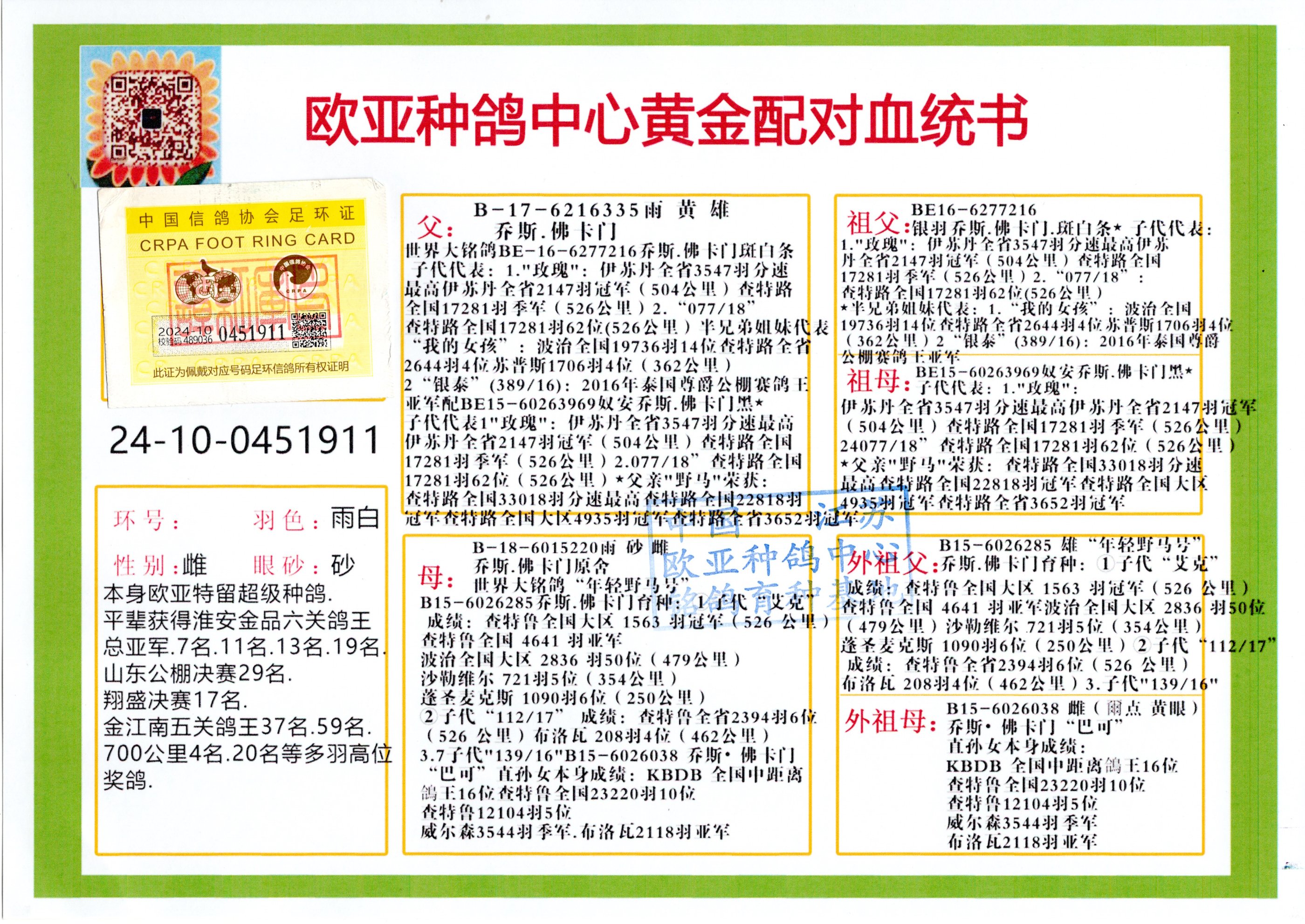 24年秋南京特比环欧亚荣获大团体冠军.小团体冠军551公里大特比13名.14名.16名.19名.20名.21名.24名.26名.27名.28名.42名.52名.54名.57名.65名.66名.68名.70名.71名.72名.74名.76名.80名.82名.83名.84名.85名.86名.90名.92名.110名.116名.121名.122名.128名.131名.158名.161名.164名.165名.166名.172名.174名.177名.182名.195名.196名.201名.205名.208名.210名.216名.253名.269名.275名.276名.294名.296名.299名,,24年秋云南天南铜都公棚决赛415名.天南铜都小棚决赛409名.云南玉活公棚决赛102名.490名.团体32名上笼二羽进二羽,天南铜都大棚506公里决赛445名。热烈祝贺河北省巨鹿县李兰生老师用欧亚泰山号血系连续十一年夺冠军,河北省国家赛冠军.全国季军等多次前十名高位,扬州王军王总用欧亚利奥24年春季获山东翔宇公棚决赛33名盖比53名。南京刘正龙刘总用欧亚盖比获得24年秋山东潍坊国际公棚决赛42名.精英赛30名.三关鸽王71名.决赛86名.加站赛16名.南京市特比环A组鸽王9名.B组鸽王5名.6名.C组鸽王5名.精英赛冠军4名.技能赛A组冠军4名.5名.秦淮区特比环荣获15名.46名.48名.87名。四川西昌徐亮徐总用欧亚利奥获得凉山州聚友决赛177名.第二关亚军双关鸽王19名.三关鸽王105名.云南豪庭公棚决赛603名。热烈祝贺24年四川重庆翔园鸽舍用欧亚泰山号荣获春季400公里冠军.秋季500公里冠军,河北王总用詹森X利奥获得千羽千翔公棚400公里冠军,广东蔡楷焕荣获24年秋爱好者 赛鸽俱乐部三关鸽王季军.一关420公里99名.二关450公里11名.三关520公里32名.单关季军.7名.12名,江西李卫兴荣获贵州红枫公棚8名.共翔俱乐部寄养棚四关综合鸽王30名.一关400公里78名.二关500公里55名.三关520公里37名.四关500公里57名.同父母获公棚18名.雷鸣获得武汉黄浦育翔中心冠军,四川陈文获得四川明鸿俱乐部300公里梦幻2名.3名.4名.9名.10名.13名.14名.15名.31名.34名.40名.41名.42名.43名.69名.71名.72名.73名.74名.94名.95名.97名.98名.99名.419公里决赛荣获总冠军7名.总共归巢9羽,四川徐亮获豪庭决赛603名,山西郑勇获得山西泰鑫公棚决赛255名詹森红狐,热烈祝贺马总获得开尔(飞跃队)决赛9名获奖金1310000万元.第一关52名,天津津福资赛180公里96名.获奖金429543万元,欧亚支持全国鸽友24年秋多人报喜 祝大家取得更好成绩,给欧亚报喜鸽友欧亚决定给每人赠送一羽超级种鸽。欧亚俱乐部特比环多关鸽王成绩:15年秋淮安特比环黑色星期一全会上笼9700多羽,当天无鸽归巢,第二天全会归巢357羽,本舍归巢158羽.前十名八羽.前一百名归巢57羽,16年春季获五关鸽王总冠军,总亚军四名.六名.七名.九名.十名.晶艺俱乐部520公里冠亚季军5名.6名.7名.9名.11名等,火车头冠军.季军6名.8名.9名.10名,16年秋晶艺俱乐部特比环520公里亚军.季军4名.6名.7名.9名,15年春南京白下特比环冠军.亚军.季军6名.7名.8名.9名.10名.指定鸽A B组获得冠军.亚军.季军4名.5名.,17年淮安特比环亚军.4名.5名.7名.8名.10名.六关鸽王总冠军.4名.6名.9名.10名,寄养棚宿迁刘总20羽特比环获冠军.季军.4名.7名.8名.9名等。18年荣获万羽特比环六关鸽王总冠军.总亚军.总季军.6名.8名.十名.单关四羽冠军.二羽亚军.四羽季军.前十名27羽。19年秋万羽特比环六关鸽王总亚军.总季军.5名.8名等,单关二羽冠军.三羽亚军.一羽季军前十名31羽。20年秋淮安市鸽会四关特比环大赛风雨无阻鸽王亚军.鸽王六名,金品俱乐部万羽特比环六关鸽王总冠军,总亚军.四名.五名.六名.七名.八名.十名.前二百名鸽王35羽,单关冠亚季军前十名四十多羽,火车头五关鸽王季军.六名.八名.前二百名鸽王十七羽。20年春荣获淮安五区一市四关鸽王总冠军.亚军.四名.八名.九名。21年秋荣获金品万羽特比环大赛六关鸽王总亚军.总季军.四名.七名.九名.十名.单关冠亚军季军前十名三十多羽。火车头协会鸽王六名.七名.十名.单关前十名十七羽。22年秋荣获鸽王总冠军.总亚军.5名.7名.8名.9名.11名.单关冠亚季军前十名三十多羽,第一关单关前二百名四十多羽,第二关前二百名三十多羽,第三关前二百名四十多羽,第四关前二百名四十多羽,第五关前一百名53羽。23年秋荣获鸽王季军.五名.八名.十名.13名.17名.20名.27名等多羽鸽王.单关前十名二十多羽。公棚.寄养棚部分成绩:16年秋宁夏黄河公棚总冠军电脑戈马力指定通炮冠军,17年送八羽参赛获得鸽王八名进奖四名,支持韩总荣获八名。支持鸽友荣获宁夏中卫公棚决赛总冠军.精英赛冠军,支持18年宁夏黄河公棚决赛冠军詹森X泰山。安徽鼎博寄养棚院内外四关鸽王总冠军.鸽王十七名.三十七名同窝,鸽王39名.42名.58名.67名。18年山东公棚预赛冠军.决赛65名.送八羽进奖五羽.指定获奔驰汽车一辆。支持鸽友获得云南蓝云公棚冠军.盖比X佛卡门。支持鸽友荣获云南银集公棚决赛冠军 詹森427X520血系 速度赛6700羽冠军。17年荣获金马俱乐部寄养棚四关鸽王总冠军.季军.六名.八名.第一关冠军.亚军.季军四名.七名.十一名.金牌教练奖。支持鸽友18年北京费翔公棚预赛九名电脑X桑杰士,支持鸽友荣获陕西威力公棚决赛11名.内蒙古临河寄养棚四关鸽王六名.詹森配泰山,支持河北王总用欧亚詹森427配胡本喜获20年秋开尔青年棚季军。云南东荣公棚16年预赛冠军.决赛77名.17年决赛12名.詹森红狐X泰山,17年平安公棚决赛4名 詹森427。欧亚获得21年金母寄养棚第一关四名.第二关5名.第三关5名.6名.7名.10名.三关鸽王总冠军,四关鸽王14名.十羽鸽王。支持河