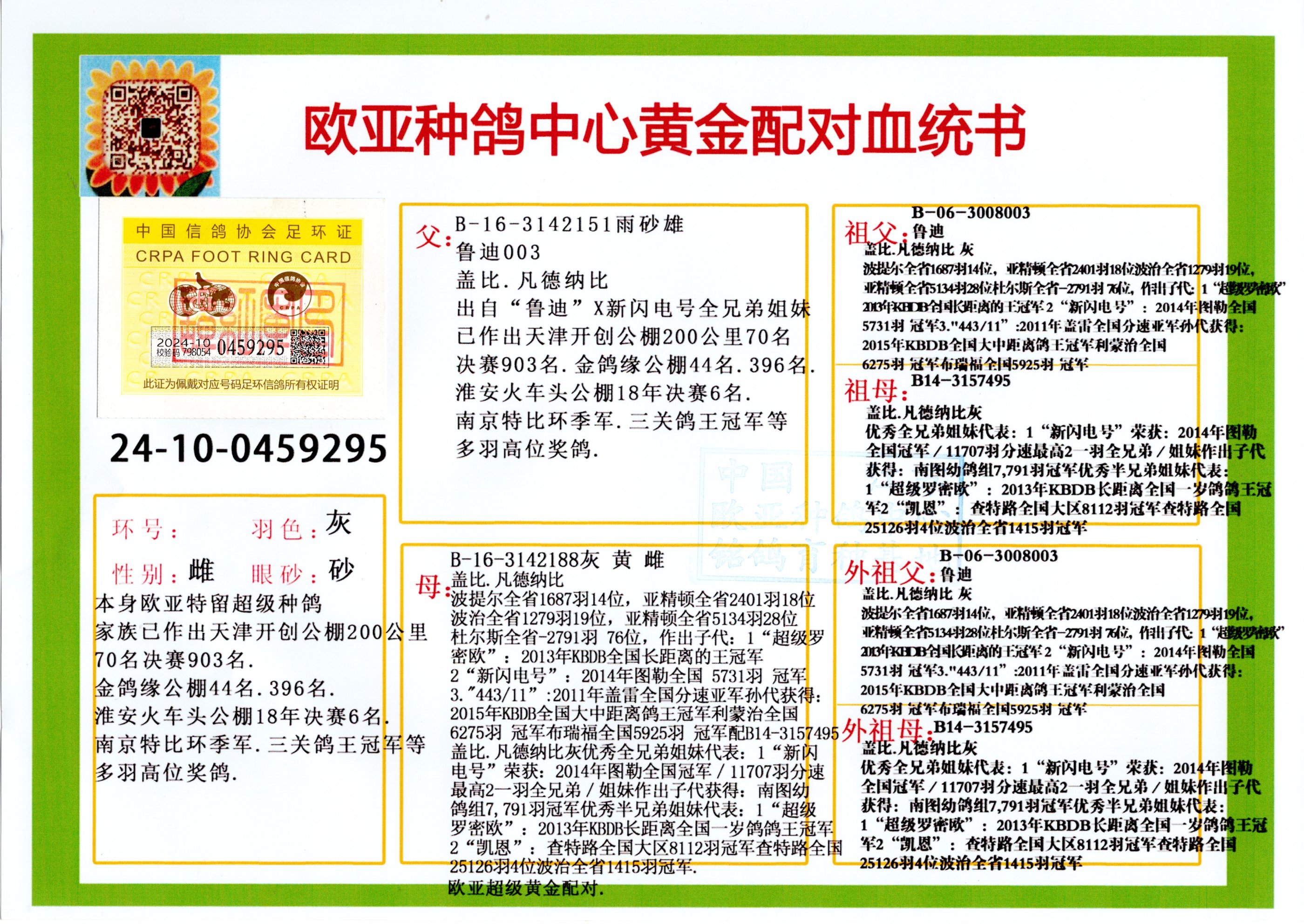 24年秋南京特比环欧亚荣获大团体冠军.小团体冠军551公里大特比13名.14名.16名.19名.20名.21名.24名.26名.27名.28名.42名.52名.54名.57名.65名.66名.68名.70名.71名.72名.74名.76名.80名.82名.83名.84名.85名.86名.90名.92名.110名.116名.121名.122名.128名.131名.158名.161名.164名.165名.166名.172名.174名.177名.182名.195名.196名.201名.205名.208名.210名.216名.253名.269名.275名.276名.294名.296名.299名,,24年秋云南天南铜都公棚决赛415名.天南铜都小棚决赛409名.云南玉活公棚决赛102名.490名.团体32名上笼二羽进二羽,天南铜都大棚506公里决赛445名。热烈祝贺河北省巨鹿县李兰生老师用欧亚泰山号血系连续十一年夺冠军,河北省国家赛冠军.全国季军等多次前十名高位,扬州王军王总用欧亚利奥24年春季获山东翔宇公棚决赛33名盖比53名。南京刘正龙刘总用欧亚盖比获得24年秋山东潍坊国际公棚决赛42名.精英赛30名.三关鸽王71名.决赛86名.加站赛16名.南京市特比环A组鸽王9名.B组鸽王5名.6名.C组鸽王5名.精英赛冠军4名.技能赛A组冠军4名.5名.秦淮区特比环荣获15名.46名.48名.87名。四川西昌徐亮徐总用欧亚利奥获得凉山州聚友决赛177名.第二关亚军双关鸽王19名.三关鸽王105名.云南豪庭公棚决赛603名。热烈祝贺24年四川重庆翔园鸽舍用欧亚泰山号荣获春季400公里冠军.秋季500公里冠军,河北王总用詹森X利奥获得千羽千翔公棚400公里冠军,广东蔡楷焕荣获24年秋爱好者 赛鸽俱乐部三关鸽王季军.一关420公里99名.二关450公里11名.三关520公里32名.单关季军.7名.12名,江西李卫兴荣获贵州红枫公棚8名.共翔俱乐部寄养棚四关综合鸽王30名.一关400公里78名.二关500公里55名.三关520公里37名.四关500公里57名.同父母获公棚18名.雷鸣获得武汉黄浦育翔中心冠军,四川陈文获得四川明鸿俱乐部300公里梦幻2名.3名.4名.9名.10名.13名.14名.15名.31名.34名.40名.41名.42名.43名.69名.71名.72名.73名.74名.94名.95名.97名.98名.99名.419公里决赛荣获总冠军7名.总共归巢9羽,四川徐亮获豪庭决赛603名,山西郑勇获得山西泰鑫公棚决赛255名詹森红狐,热烈祝贺马总获得开尔(飞跃队)决赛9名获奖金1310000万元.第一关52名,天津津福资赛180公里96名.获奖金429543万元,欧亚支持全国鸽友24年秋多人报喜 祝大家取得更好成绩,给欧亚报喜鸽友欧亚决定给每人赠送一羽超级种鸽。欧亚俱乐部特比环多关鸽王成绩:15年秋淮安特比环黑色星期一全会上笼9700多羽,当天无鸽归巢,第二天全会归巢357羽,本舍归巢158羽.前十名八羽.前一百名归巢57羽,16年春季获五关鸽王总冠军,总亚军四名.六名.七名.九名.十名.晶艺俱乐部520公里冠亚季军5名.6名.7名.9名.11名等,火车头冠军.季军6名.8名.9名.10名,16年秋晶艺俱乐部特比环520公里亚军.季军4名.6名.7名.9名,15年春南京白下特比环冠军.亚军.季军6名.7名.8名.9名.10名.指定鸽A B组获得冠军.亚军.季军4名.5名.,17年淮安特比环亚军.4名.5名.7名.8名.10名.六关鸽王总冠军.4名.6名.9名.10名,寄养棚宿迁刘总20羽特比环获冠军.季军.4名.7名.8名.9名等。18年荣获万羽特比环六关鸽王总冠军.总亚军.总季军.6名.8名.十名.单关四羽冠军.二羽亚军.四羽季军.前十名27羽。19年秋万羽特比环六关鸽王总亚军.总季军.5名.8名等,单关二羽冠军.三羽亚军.一羽季军前十名31羽。20年秋淮安市鸽会四关特比环大赛风雨无阻鸽王亚军.鸽王六名,金品俱乐部万羽特比环六关鸽王总冠军,总亚军.四名.五名.六名.七名.八名.十名.前二百名鸽王35羽,单关冠亚季军前十名四十多羽,火车头五关鸽王季军.六名.八名.前二百名鸽王十七羽。20年春荣获淮安五区一市四关鸽王总冠军.亚军.四名.八名.九名。21年秋荣获金品万羽特比环大赛六关鸽王总亚军.总季军.四名.七名.九名.十名.单关冠亚军季军前十名三十多羽。火车头协会鸽王六名.七名.十名.单关前十名十七羽。22年秋荣获鸽王总冠军.总亚军.5名.7名.8名.9名.11名.单关冠亚季军前十名三十多羽,第一关单关前二百名四十多羽,第二关前二百名三十多羽,第三关前二百名四十多羽,第四关前二百名四十多羽,第五关前一百名53羽。23年秋荣获鸽王季军.五名.八名.十名.13名.17名.20名.27名等多羽鸽王.单关前十名二十多羽。公棚.寄养棚部分成绩:16年秋宁夏黄河公棚总冠军电脑戈马力指定通炮冠军,17年送八羽参赛获得鸽王八名进奖四名,支持韩总荣获八名。支持鸽友荣获宁夏中卫公棚决赛总冠军.精英赛冠军,支持18年宁夏黄河公棚决赛冠军詹森X泰山。安徽鼎博寄养棚院内外四关鸽王总冠军.鸽王十七名.三十七名同窝,鸽王39名.42名.58名.67名。18年山东公棚预赛冠军.决赛65名.送八羽进奖五羽.指定获奔驰汽车一辆。支持鸽友获得云南蓝云公棚冠军.盖比X佛卡门。支持鸽友荣获云南银集公棚决赛冠军 詹森427X520血系 速度赛6700羽冠军。17年荣获金马俱乐部寄养棚四关鸽王总冠军.季军.六名.八名.第一关冠军.亚军.季军四名.七名.十一名.金牌教练奖。支持鸽友18年北京费翔公棚预赛九名电脑X桑杰士,支持鸽友荣获陕西威力公棚决赛11名.内蒙古临河寄养棚四关鸽王六名.詹森配泰山,支持河北王总用欧亚詹森427配胡本喜获20年秋开尔青年棚季军。云南东荣公棚16年预赛冠军.决赛77名.17年决赛12名.詹森红狐X泰山,17年平安公棚决赛4名 詹森427。欧亚获得21年金母寄养棚第一关四名.第二关5名.第三关5名.6名.7名.10名.三关鸽王总冠军,四关鸽王14名.十羽鸽王。支持河