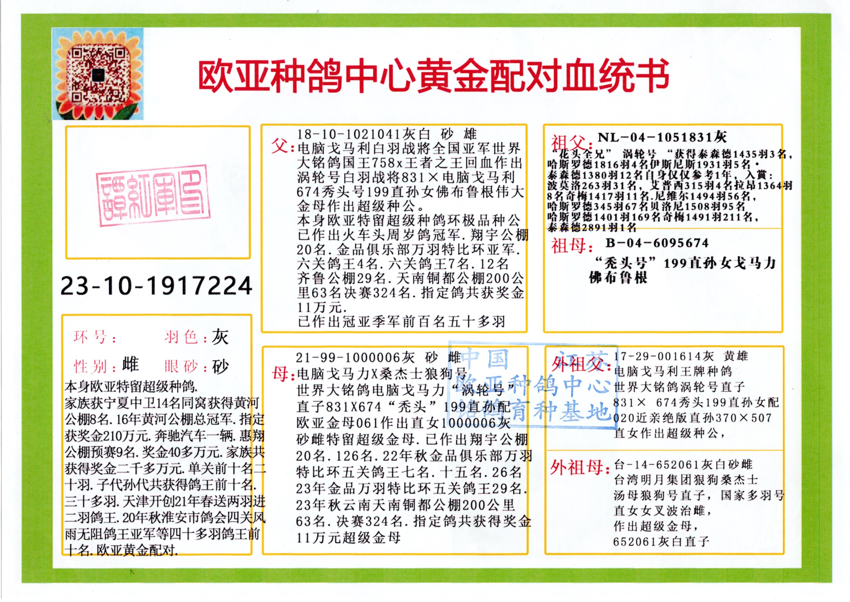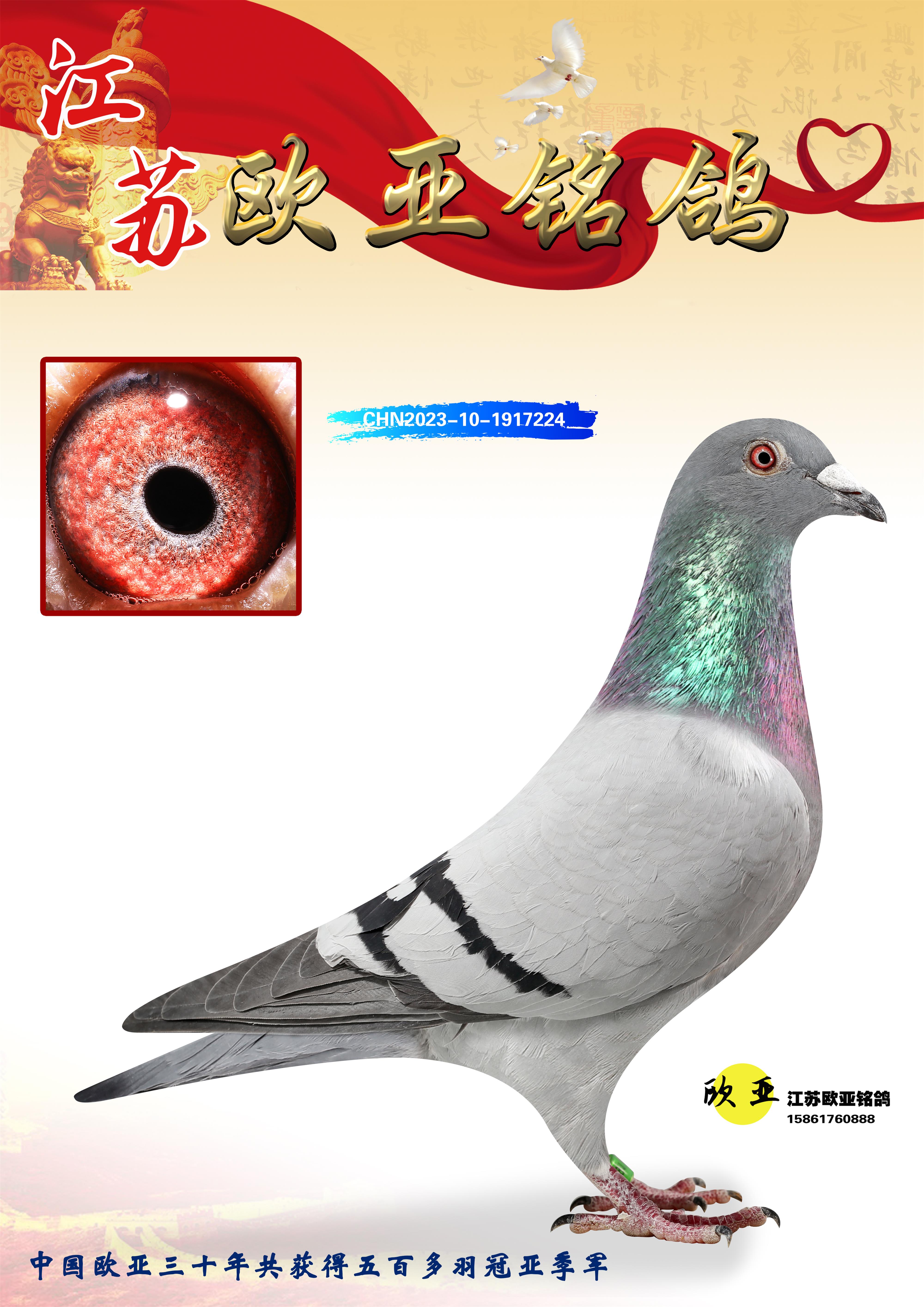 24年秋南京特比环欧亚荣获大团体冠军.小团体冠军551公里大特比13名.14名.16名.19名.20名.21名.24名.26名.27名.28名.42名.52名.54名.57名.65名.66名.68名.70名.71名.72名.74名.76名.80名.82名.83名.84名.85名.86名.90名.92名.110名.116名.121名.122名.128名.131名.158名.161名.164名.165名.166名.172名.174名.177名.182名.195名.196名.201名.205名.208名.210名.216名.253名.269名.275名.276名.294名.296名.299名,,24年秋云南天南铜都公棚决赛415名.天南铜都小棚决赛409名.云南玉活公棚决赛102名.490名.团体32名上笼二羽进二羽,天南铜都大棚506公里决赛445名。热烈祝贺河北省巨鹿县李兰生老师用欧亚泰山号血系连续十一年夺冠军,河北省国家赛冠军.全国季军等多次前十名高位,扬州王军王总用欧亚利奥24年春季获山东翔宇公棚决赛33名盖比53名。南京刘正龙刘总用欧亚盖比获得24年秋山东潍坊国际公棚决赛42名.精英赛30名.三关鸽王71名.决赛86名.加站赛16名.南京市特比环A组鸽王9名.B组鸽王5名.6名.C组鸽王5名.精英赛冠军4名.技能赛A组冠军4名.5名.秦淮区特比环荣获15名.46名.48名.87名。四川西昌徐亮徐总用欧亚利奥获得凉山州聚友决赛177名.第二关亚军双关鸽王19名.三关鸽王105名.云南豪庭公棚决赛603名。热烈祝贺24年四川重庆翔园鸽舍用欧亚泰山号荣获春季400公里冠军.秋季500公里冠军,河北王总用詹森X利奥获得千羽千翔公棚400公里冠军,广东蔡楷焕荣获24年秋爱好者 赛鸽俱乐部三关鸽王季军.一关420公里99名.二关450公里11名.三关520公里32名.单关季军.7名.12名,江西李卫兴荣获贵州红枫公棚8名.共翔俱乐部寄养棚四关综合鸽王30名.一关400公里78名.二关500公里55名.三关520公里37名.四关500公里57名.同父母获公棚18名.雷鸣获得武汉黄浦育翔中心冠军,四川陈文获得四川明鸿俱乐部300公里梦幻2名.3名.4名.9名.10名.13名.14名.15名.31名.34名.40名.41名.42名.43名.69名.71名.72名.73名.74名.94名.95名.97名.98名.99名.419公里决赛荣获总冠军7名.总共归巢9羽,四川徐亮获豪庭决赛603名,山西郑勇获得山西泰鑫公棚决赛255名詹森红狐,热烈祝贺马总获得开尔(飞跃队)决赛9名获奖金1310000万元.第一关52名,天津津福资赛180公里96名.获奖金429543万元,欧亚支持全国鸽友24年秋多人报喜 祝大家取得更好成绩,给欧亚报喜鸽友欧亚决定给每人赠送一羽超级种鸽。欧亚俱乐部特比环多关鸽王成绩:15年秋淮安特比环黑色星期一全会上笼9700多羽,当天无鸽归巢,第二天全会归巢357羽,本舍归巢158羽.前十名八羽.前一百名归巢57羽,16年春季获五关鸽王总冠军,总亚军四名.六名.七名.九名.十名.晶艺俱乐部520公里冠亚季军5名.6名.7名.9名.11名等,火车头冠军.季军6名.8名.9名.10名,16年秋晶艺俱乐部特比环520公里亚军.季军4名.6名.7名.9名,15年春南京白下特比环冠军.亚军.季军6名.7名.8名.9名.10名.指定鸽A B组获得冠军.亚军.季军4名.5名.,17年淮安特比环亚军.4名.5名.7名.8名.10名.六关鸽王总冠军.4名.6名.9名.10名,寄养棚宿迁刘总20羽特比环获冠军.季军.4名.7名.8名.9名等。18年荣获万羽特比环六关鸽王总冠军.总亚军.总季军.6名.8名.十名.单关四羽冠军.二羽亚军.四羽季军.前十名27羽。19年秋万羽特比环六关鸽王总亚军.总季军.5名.8名等,单关二羽冠军.三羽亚军.一羽季军前十名31羽。20年秋淮安市鸽会四关特比环大赛风雨无阻鸽王亚军.鸽王六名,金品俱乐部万羽特比环六关鸽王总冠军,总亚军.四名.五名.六名.七名.八名.十名.前二百名鸽王35羽,单关冠亚季军前十名四十多羽,火车头五关鸽王季军.六名.八名.前二百名鸽王十七羽。20年春荣获淮安五区一市四关鸽王总冠军.亚军.四名.八名.九名。21年秋荣获金品万羽特比环大赛六关鸽王总亚军.总季军.四名.七名.九名.十名.单关冠亚军季军前十名三十多羽。火车头协会鸽王六名.七名.十名.单关前十名十七羽。22年秋荣获鸽王总冠军.总亚军.5名.7名.8名.9名.11名.单关冠亚季军前十名三十多羽,第一关单关前二百名四十多羽,第二关前二百名三十多羽,第三关前二百名四十多羽,第四关前二百名四十多羽,第五关前一百名53羽。23年秋荣获鸽王季军.五名.八名.十名.13名.17名.20名.27名等多羽鸽王.单关前十名二十多羽。公棚.寄养棚部分成绩:16年秋宁夏黄河公棚总冠军电脑戈马力指定通炮冠军,17年送八羽参赛获得鸽王八名进奖四名,支持韩总荣获八名。支持鸽友荣获宁夏中卫公棚决赛总冠军.精英赛冠军,支持18年宁夏黄河公棚决赛冠军詹森X泰山。安徽鼎博寄养棚院内外四关鸽王总冠军.鸽王十七名.三十七名同窝,鸽王39名.42名.58名.67名。18年山东公棚预赛冠军.决赛65名.送八羽进奖五羽.指定获奔驰汽车一辆。支持鸽友获得云南蓝云公棚冠军.盖比X佛卡门。支持鸽友荣获云南银集公棚决赛冠军 詹森427X520血系 速度赛6700羽冠军。17年荣获金马俱乐部寄养棚四关鸽王总冠军.季军.六名.八名.第一关冠军.亚军.季军四名.七名.十一名.金牌教练奖。支持鸽友18年北京费翔公棚预赛九名电脑X桑杰士,支持鸽友荣获陕西威力公棚决赛11名.内蒙古临河寄养棚四关鸽王六名.詹森配泰山,支持河北王总用欧亚詹森427配胡本喜获20年秋开尔青年棚季军。云南东荣公棚16年预赛冠军.决赛77名.17年决赛12名.詹森红狐X泰山,17年平安公棚决赛4名 詹森427。欧亚获得21年金母寄养棚第一关四名.第二关5名.第三关5名.6名.7名.10名.三关鸽王总冠军,四关鸽王14名.十羽鸽王。支持河