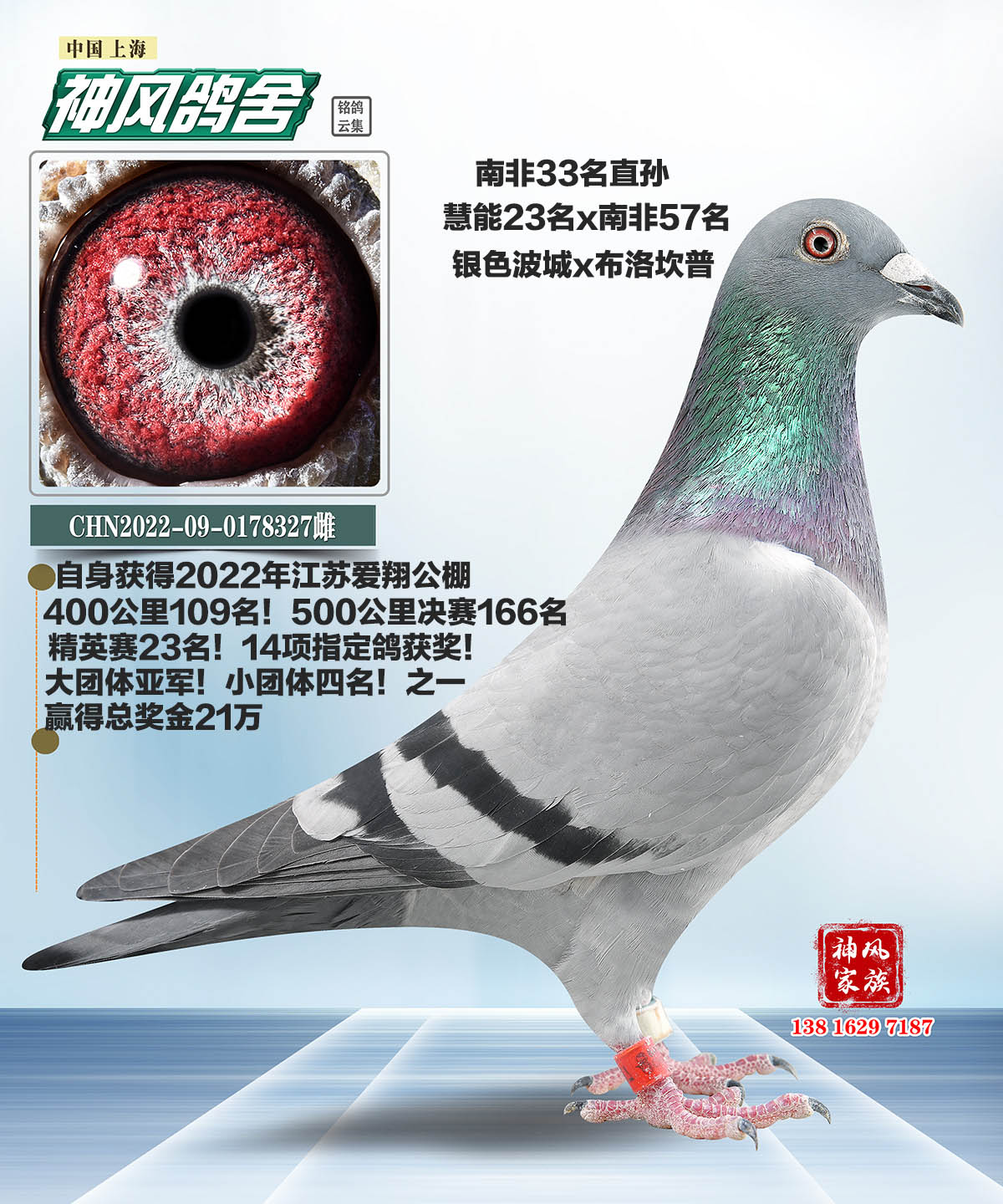 同父母平辈获得2019年上海君冠公棚预赛11名。决赛8名。2020年西安威力慧能公棚300公里29名。400公里17名。530公里434名赢得奖金60万。2020年西安威力慧能决赛469名。2021年江苏爱翔公棚决赛62名!兄弟姐妹作出江浙沪和协会成绩鸽两年之内获奖30余只2022年作出江苏爱翔公棚决赛306名!307名!