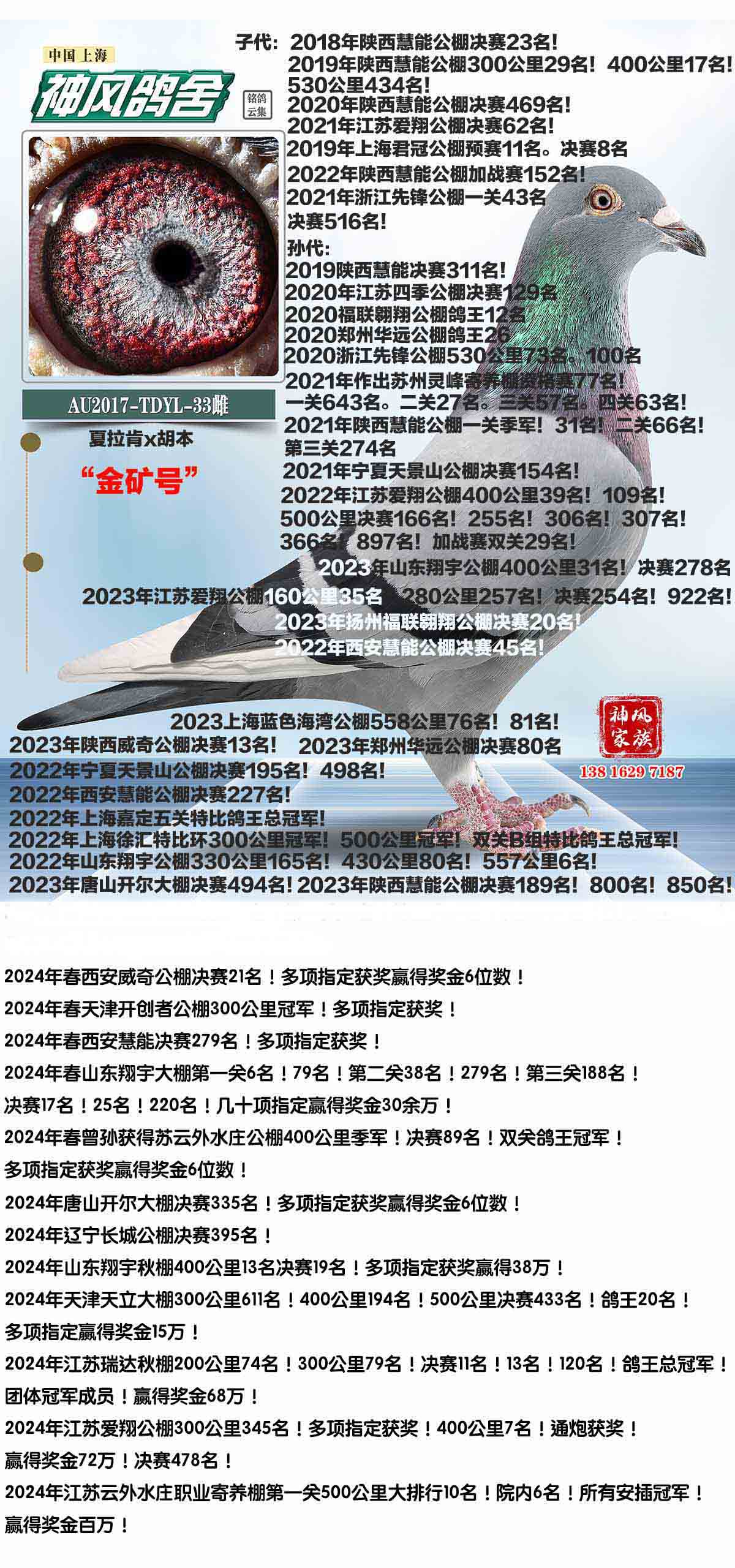 祖母AU2017-33:本舍胡本头号中鸽“鸽王缔造者”直女!本身和全平辈后代西安威力。宁夏黄河。安徽万佛。江苏爱翔。浙江先锋。上海君冠。等等众多公棚都有高位获奖!